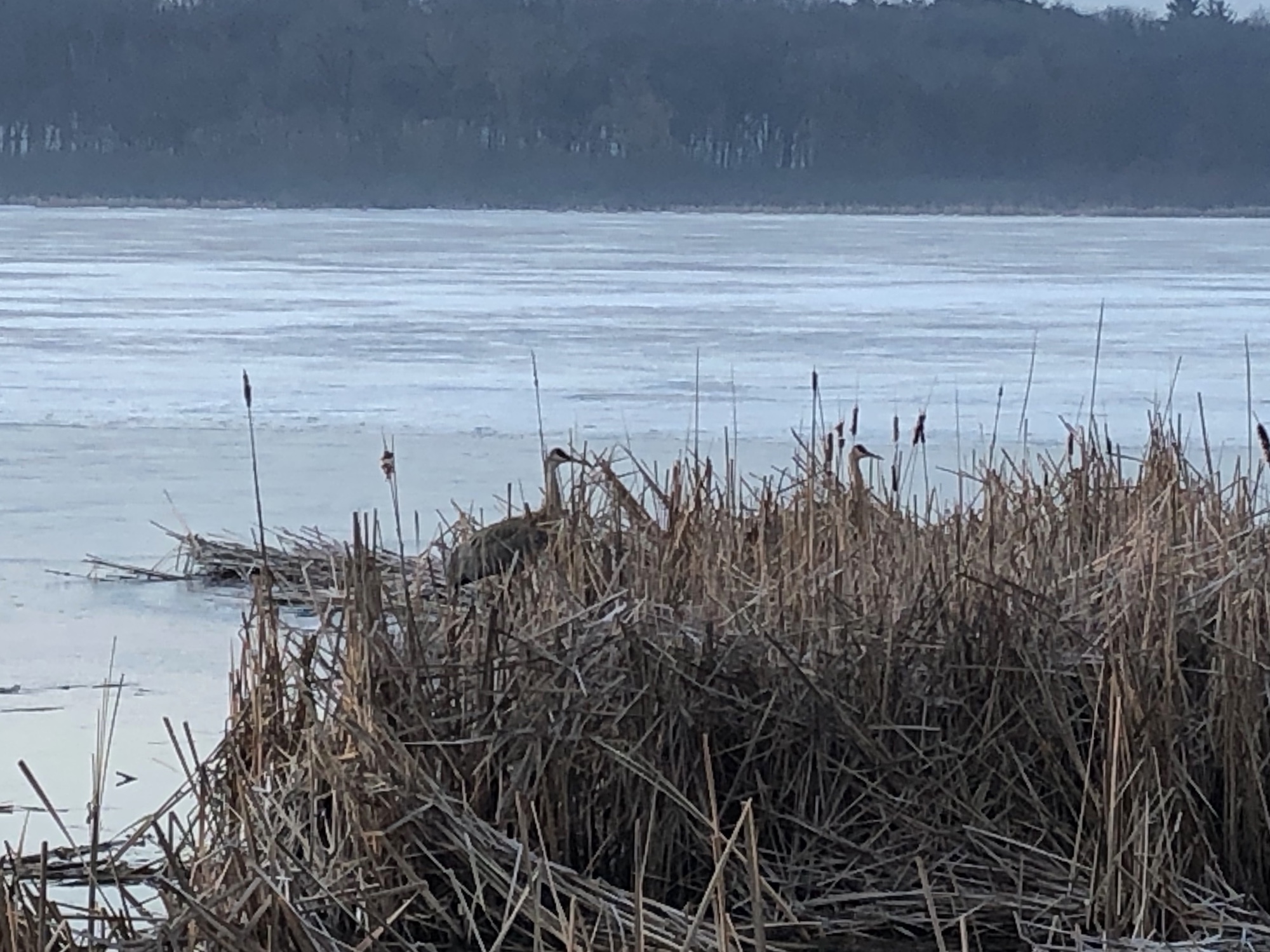 Above: Lake Wingra cattails. Two Sandhill Cranes. Redwing Blackbirds.
