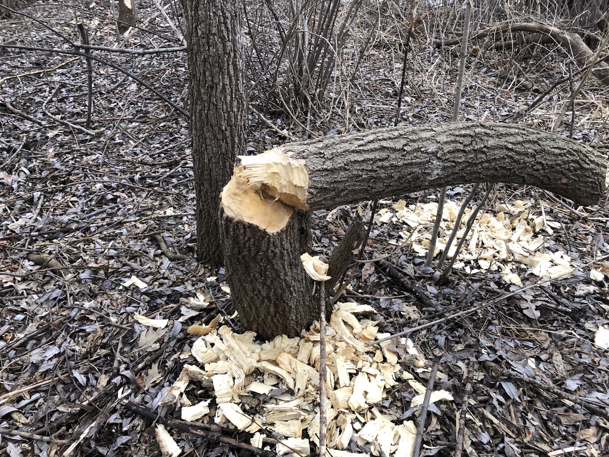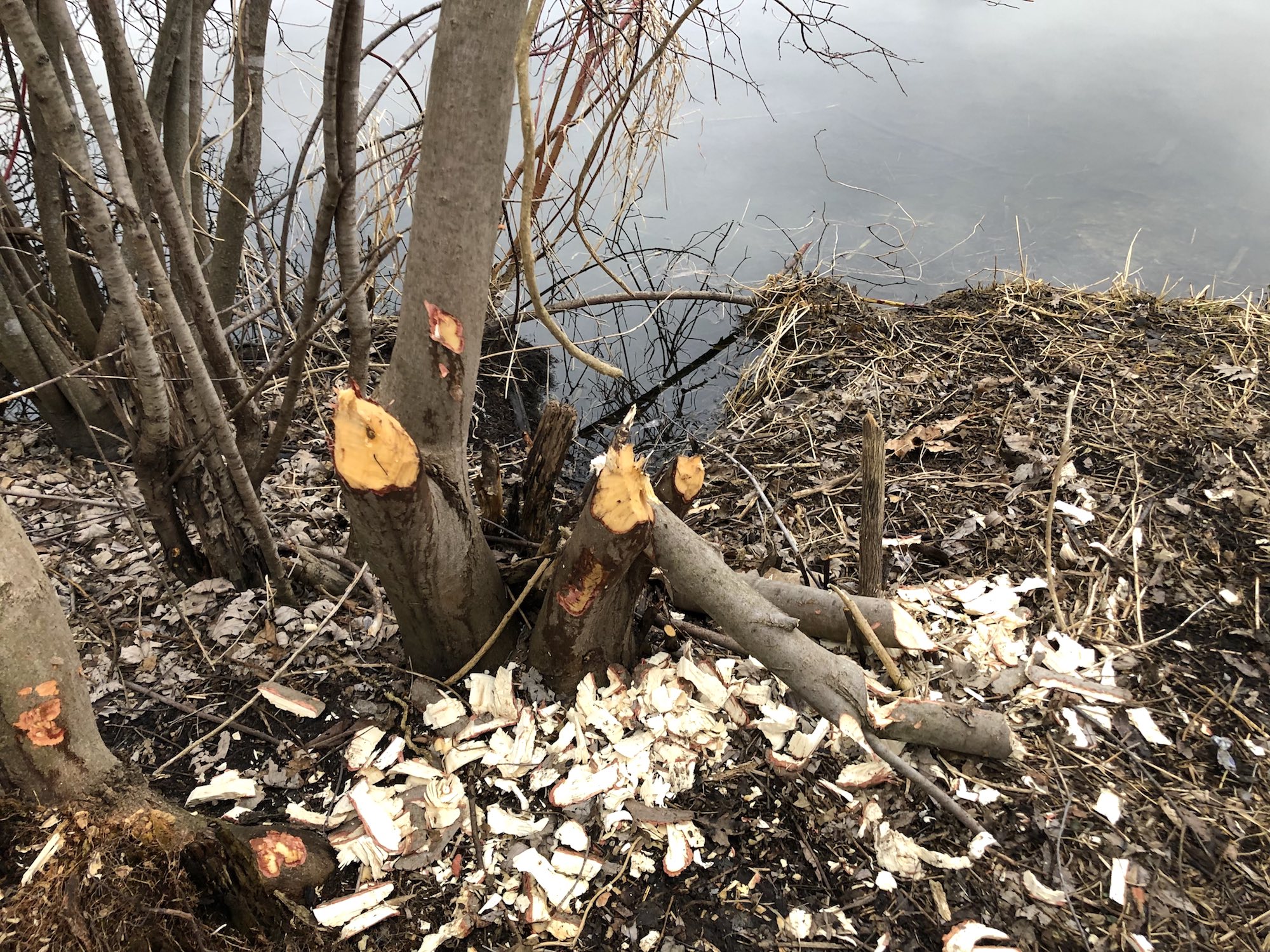 Below: Tree and limbs gnawed by beaver on shore of Ho-Nee-Um Pond near Marston Springs.