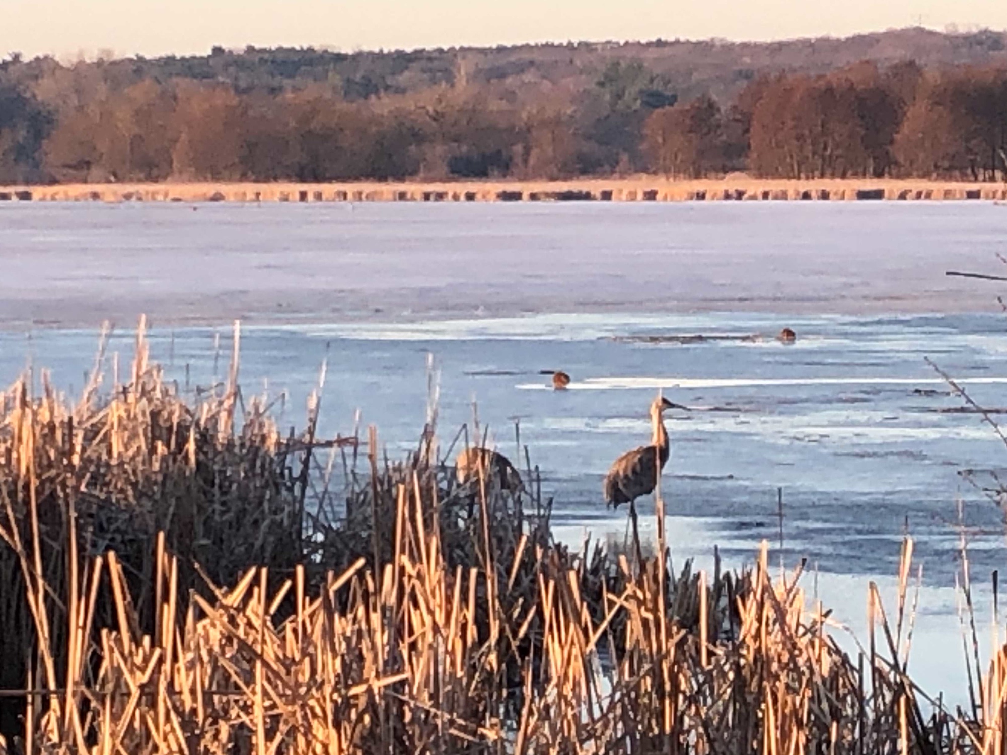 Above: Lake Wingra cattails. Two Sandhill Cranes. Redwing Blackbirds. Canada Geese. Mallards. Muskrat on edge of receeding ice.
