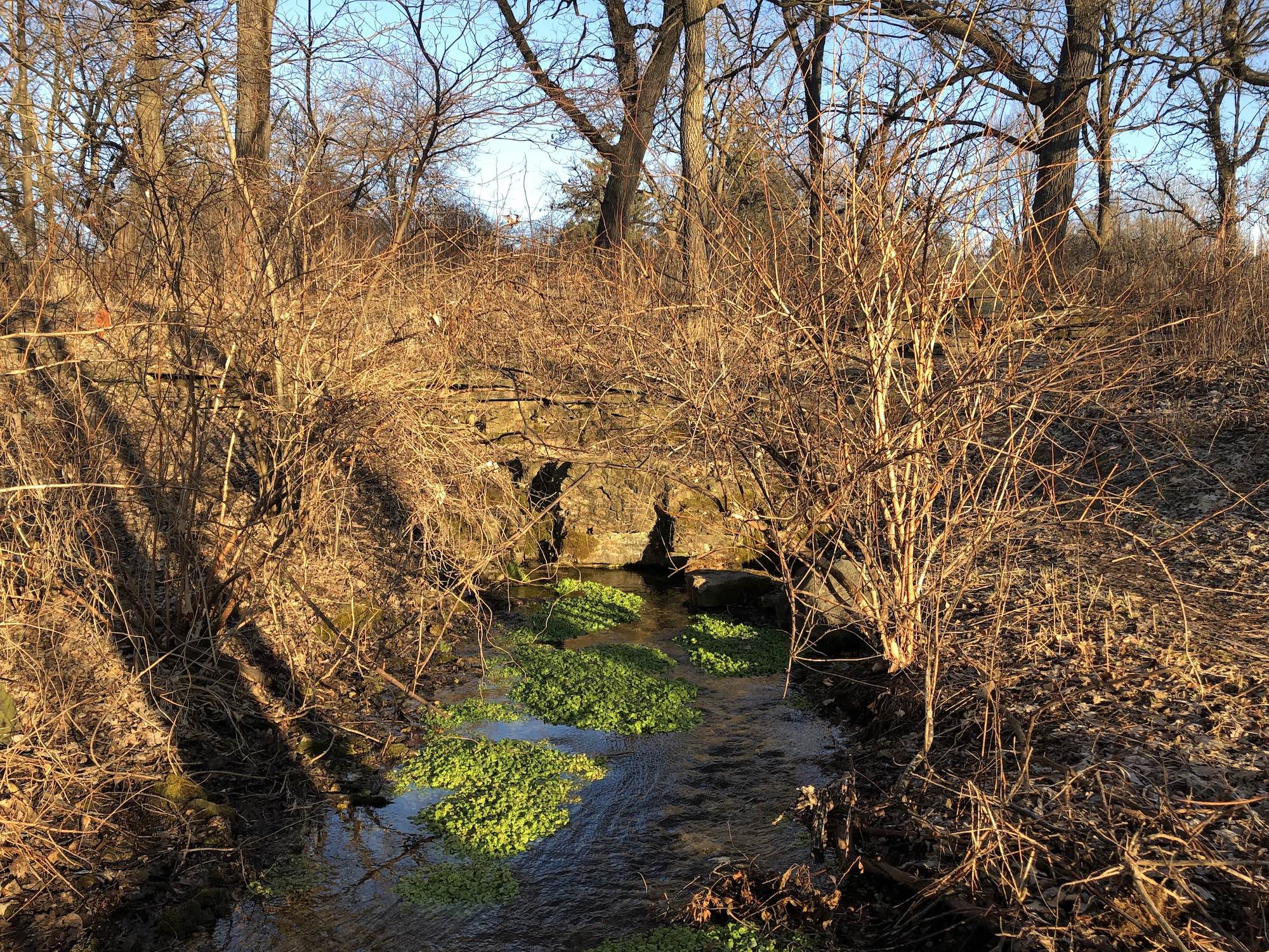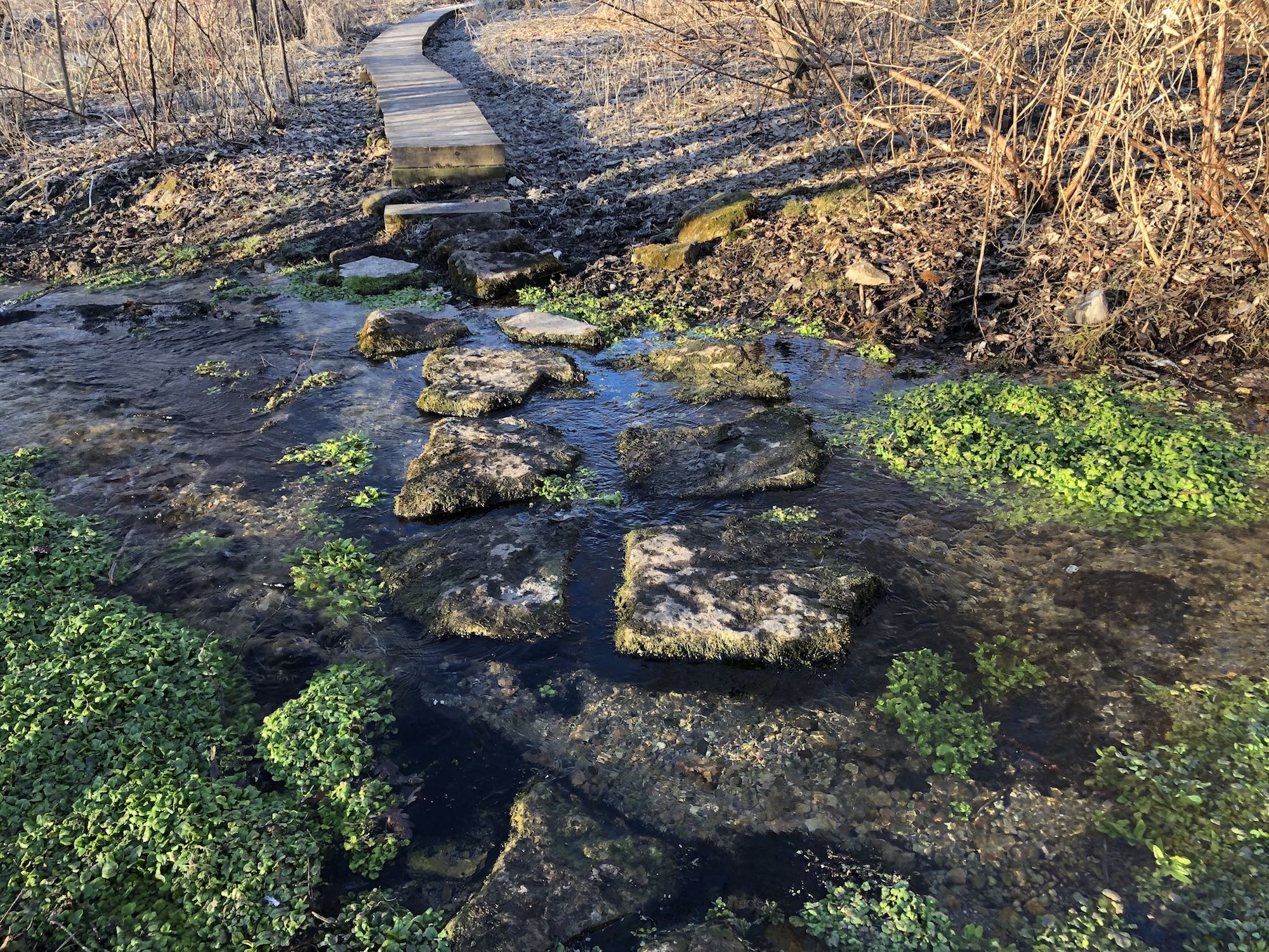 Above: Retaining pond on corner of Nakoma Road and Manitou Way on March 23, 2019 (30°).