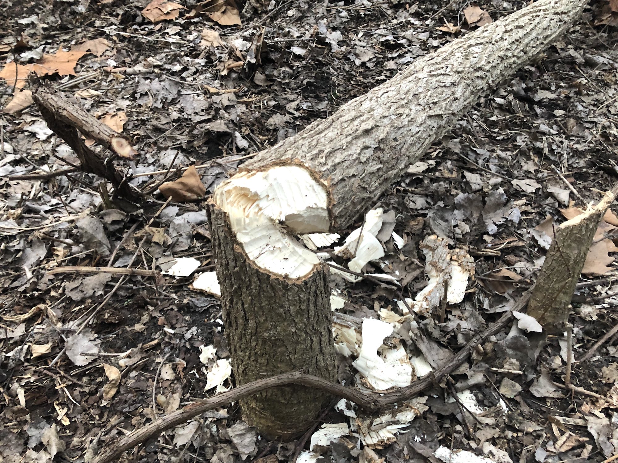 Below: Trees by Ho-Nee-Um Pond carved and felled by beaver.