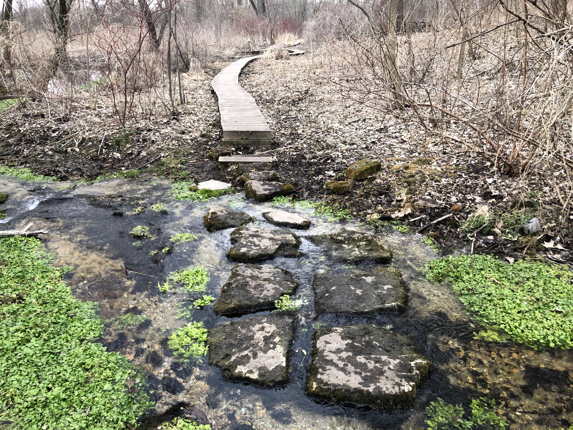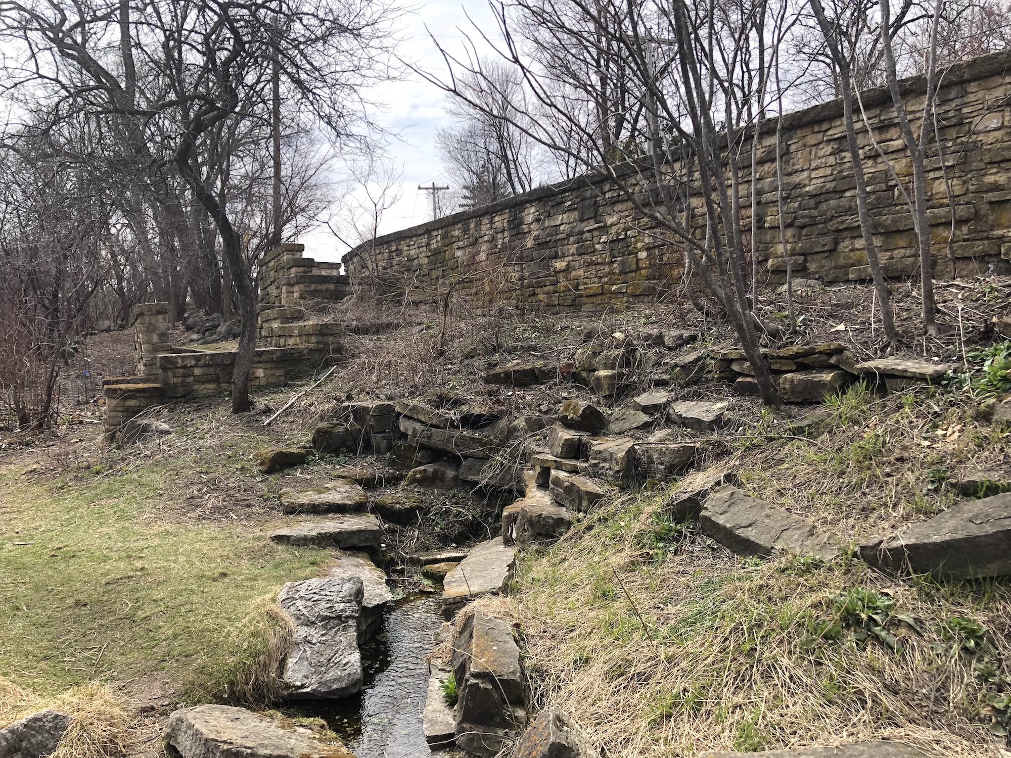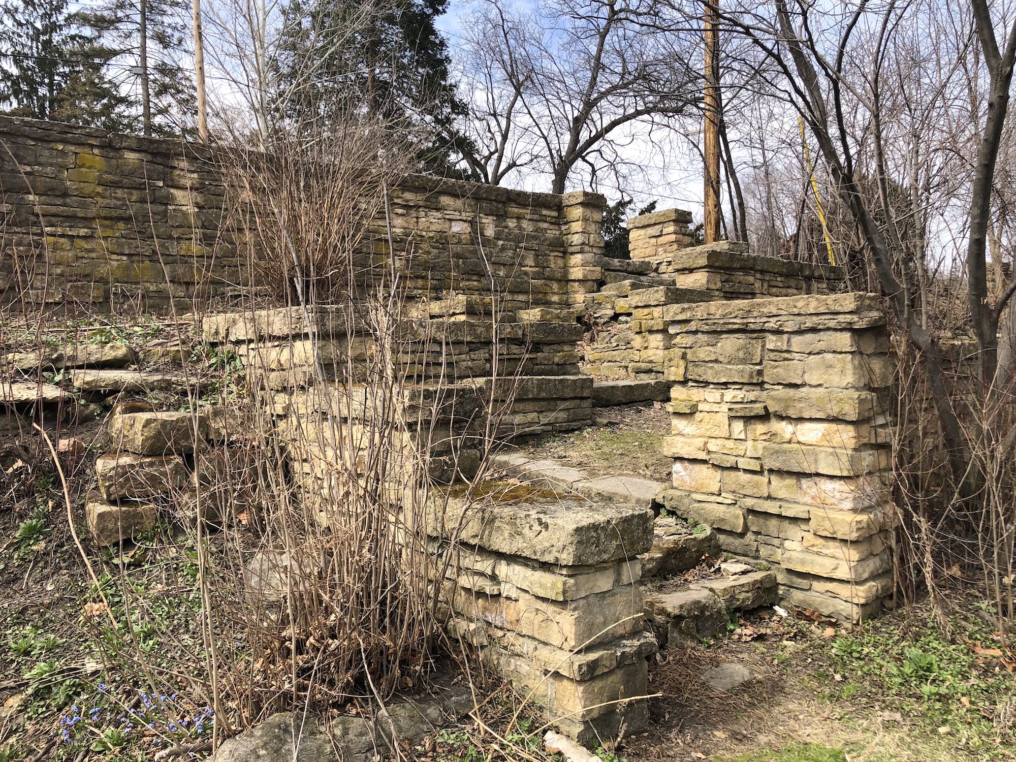 Below: The entrance to the Duck Pond, a stone structure (wall and steps) is reported to have been designed by Frank Lloyd Wright and built by the CCC.