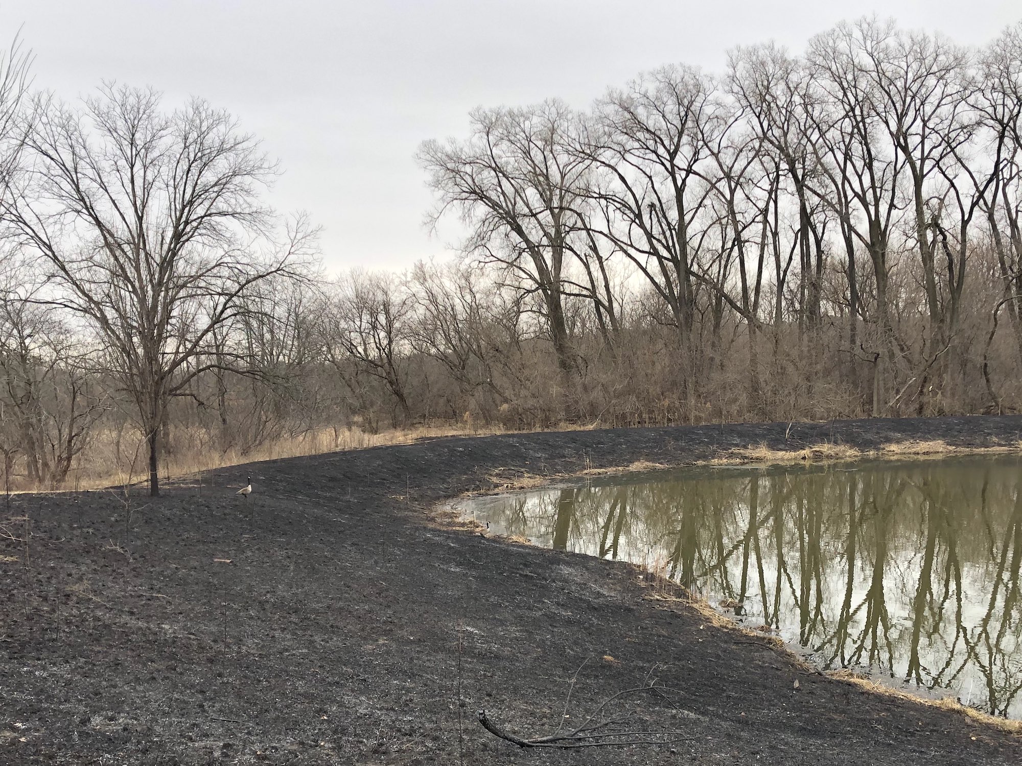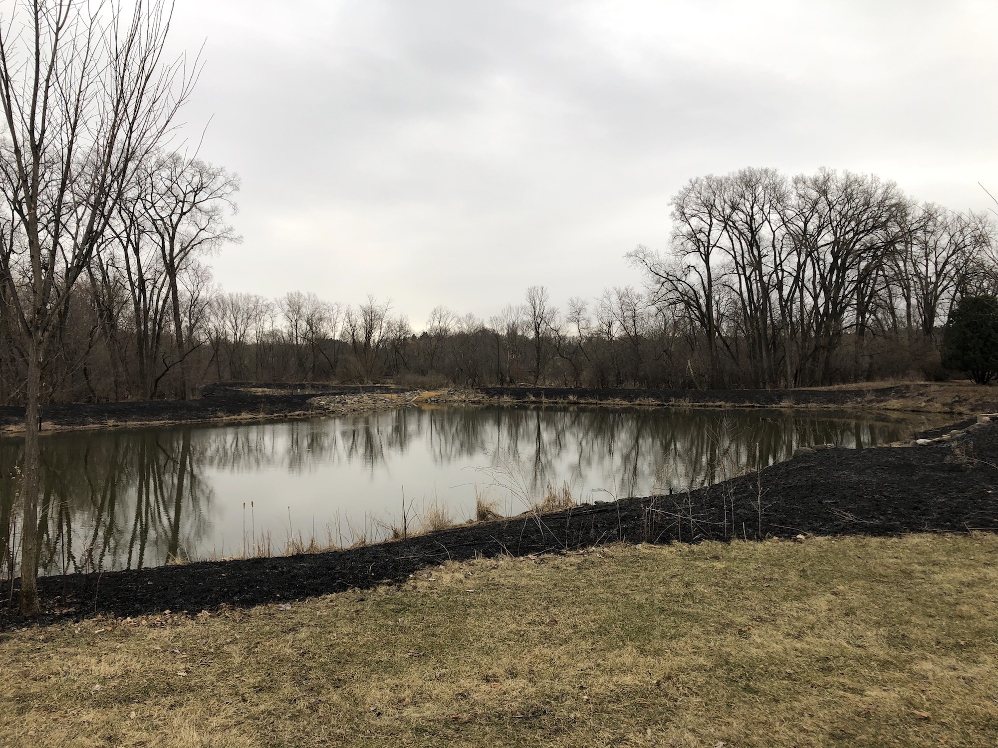 Above: Retaining pond on corner of Nakoma Road and Manitou Way on April 1, 2019 (23°). Controlled burn the day before on March 31.