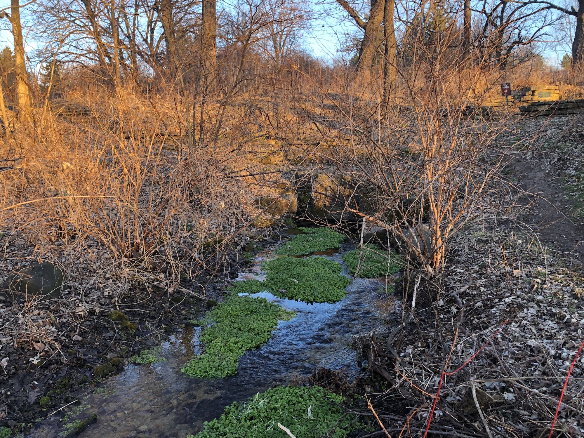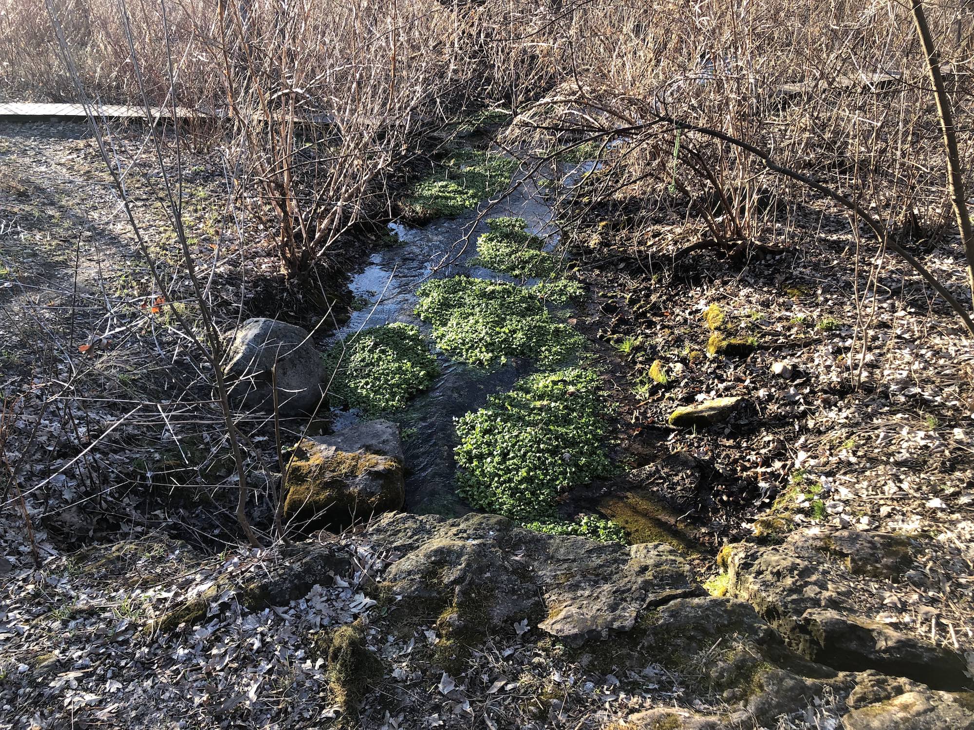Above: Retaining pond on corner of Nakoma Road and Manitou Way on April 3, 2019 (36°).