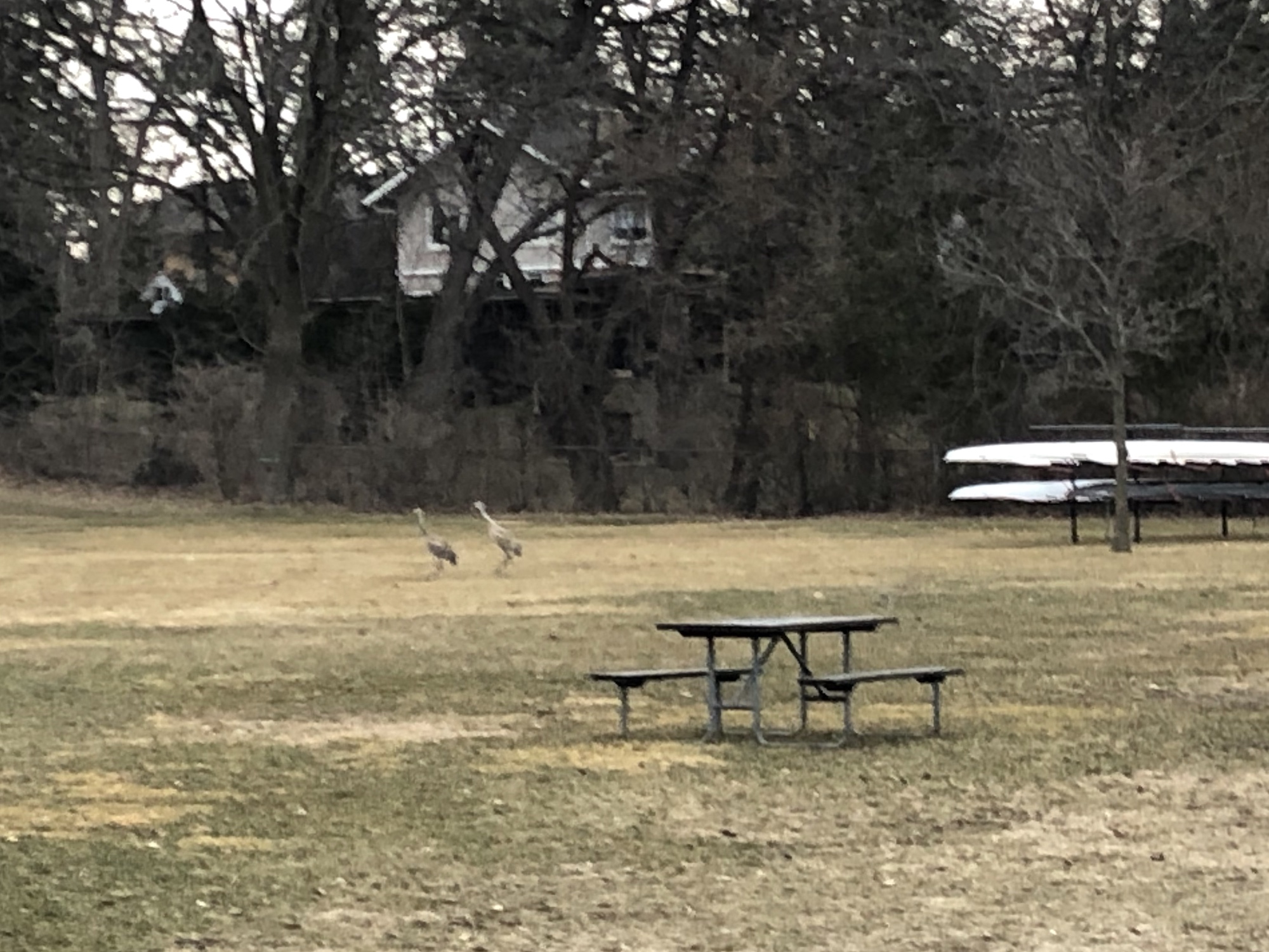 Note: Two Sandhill Cranes in Wingra Park. Redwing Blackbirds in cattails. Mallards. Canada Geese. Woodpeckers. Rafter of wild turkeys by Duck Pond.