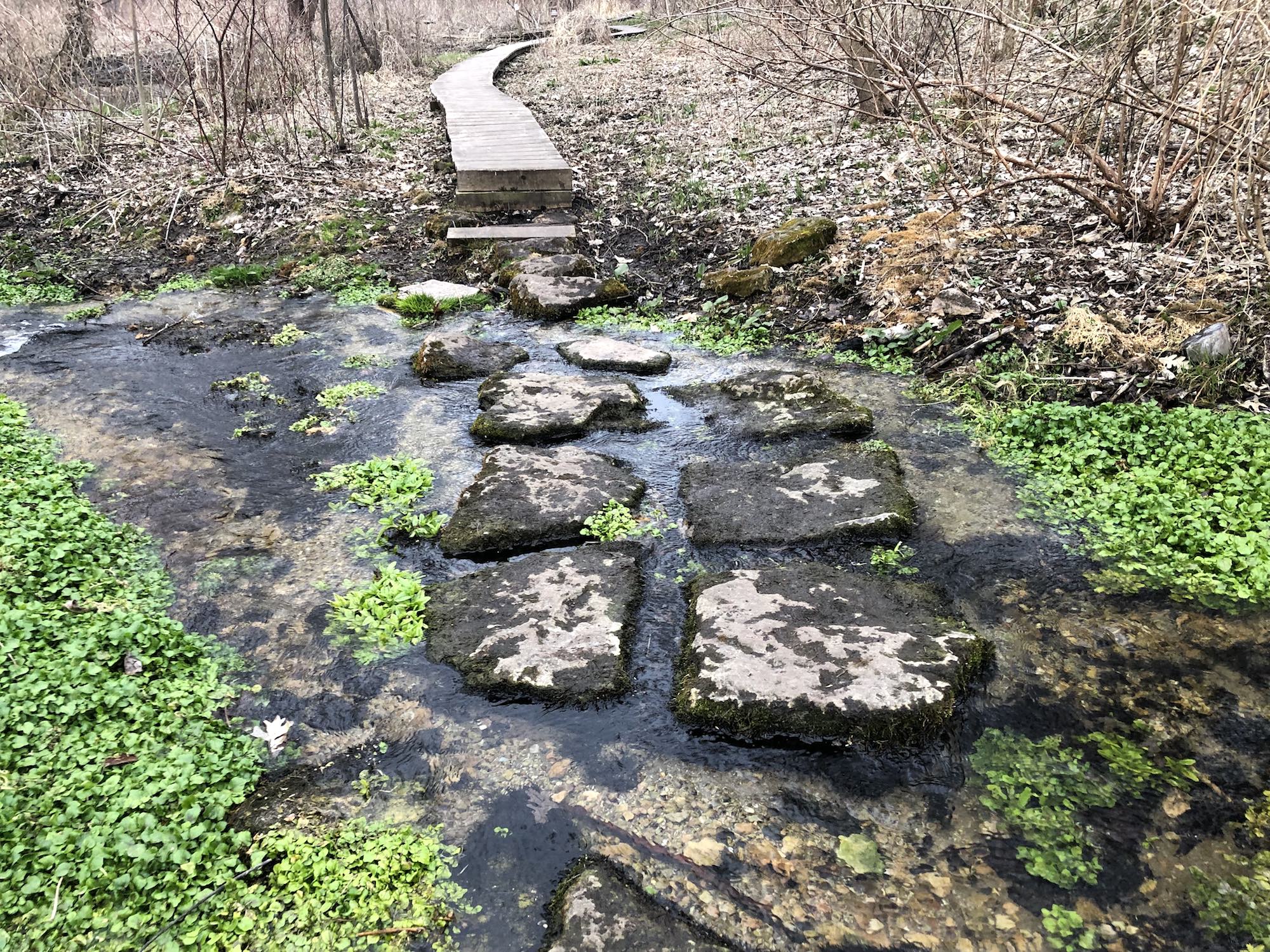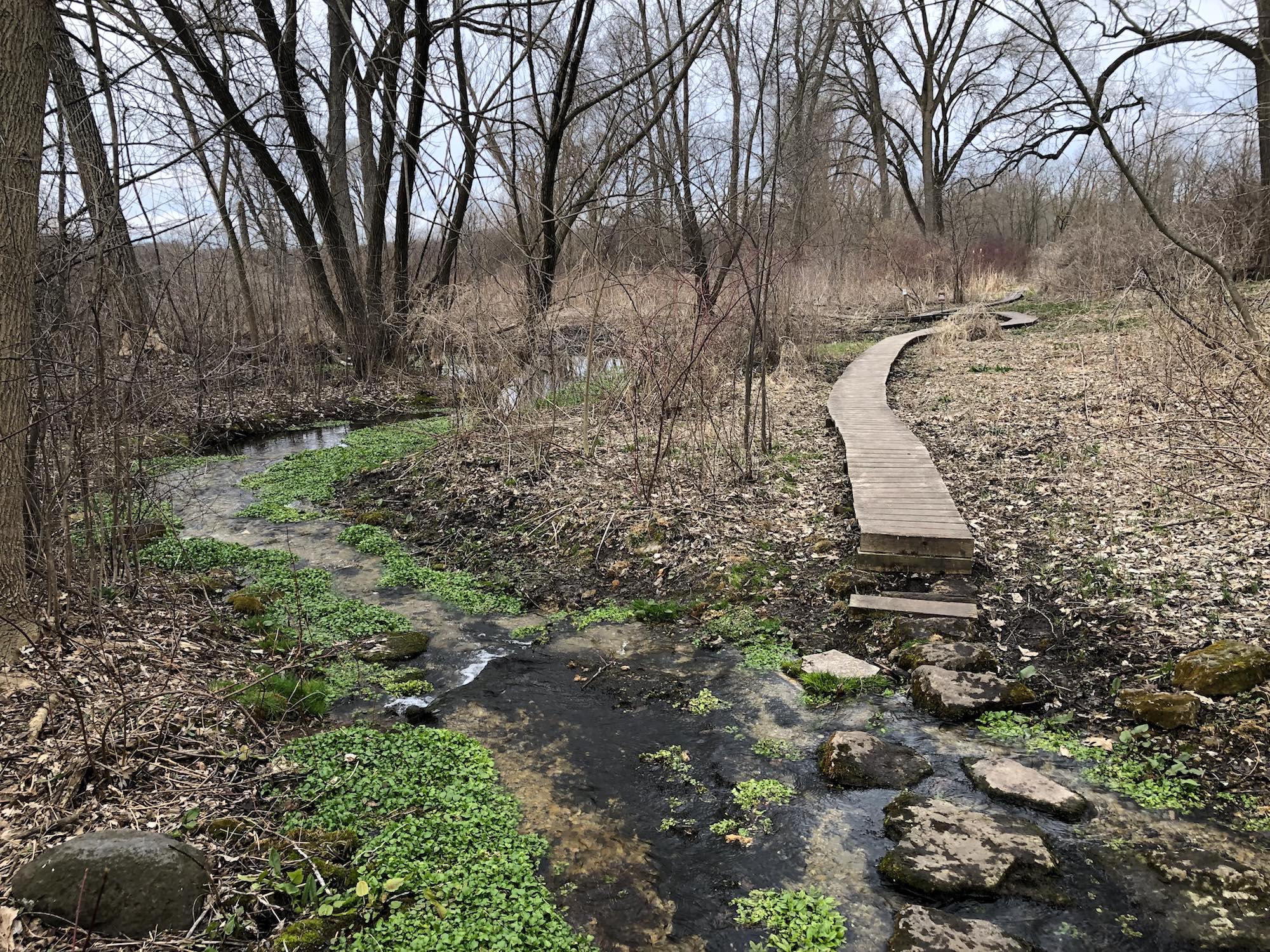 Above: Retaining pond on corner of Nakoma Road and Manitou Way on April 10, 2019 (33°).