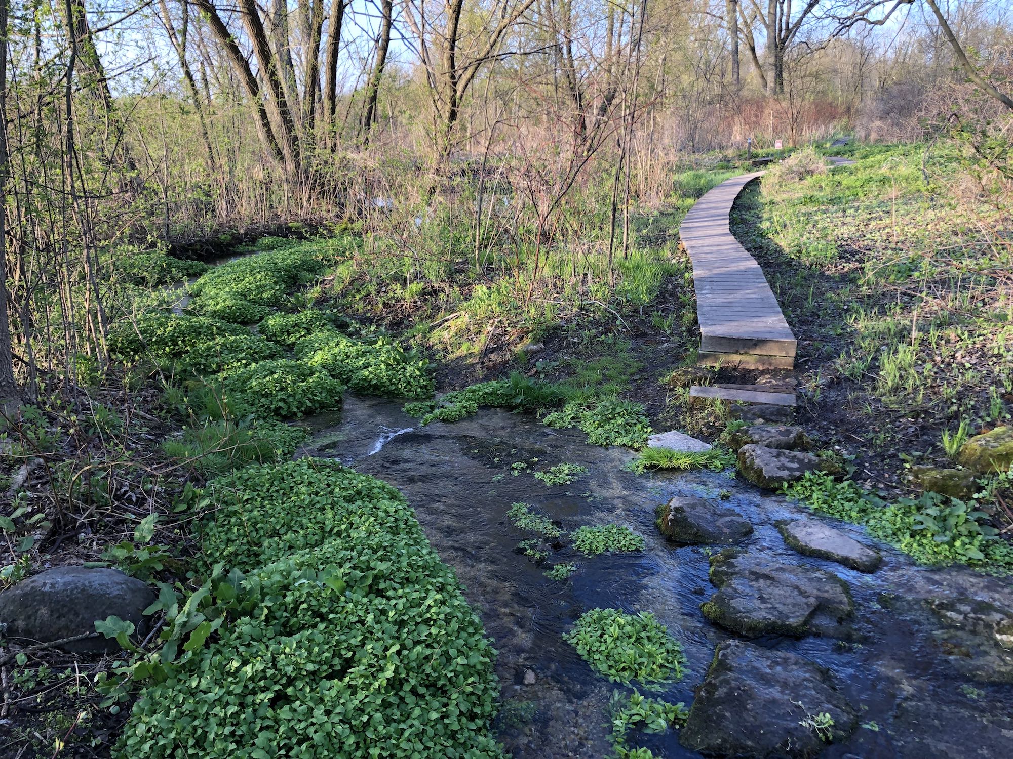 Note: Redwing Blackbirds in cattails. Mallards. Trout Lillies still blooming in Oak Savanna. Dutchman's Breeches still blooming buy fading fast. Woodpecker drumming between Marion Dunn Prairie and Oak Savanna. Lone wild turkey at outflow creek of retaining pond. Lone Turkey by retaining pond.