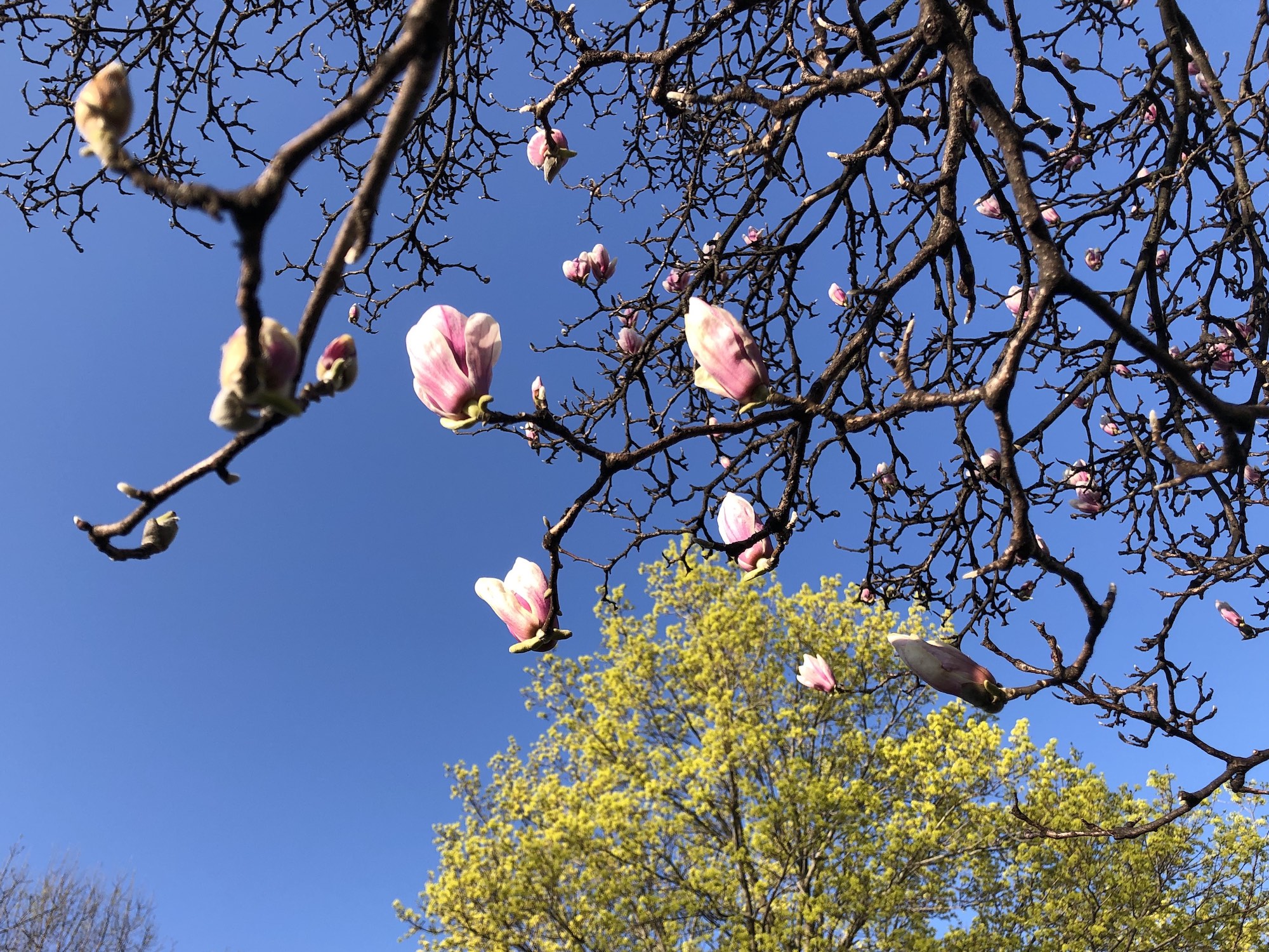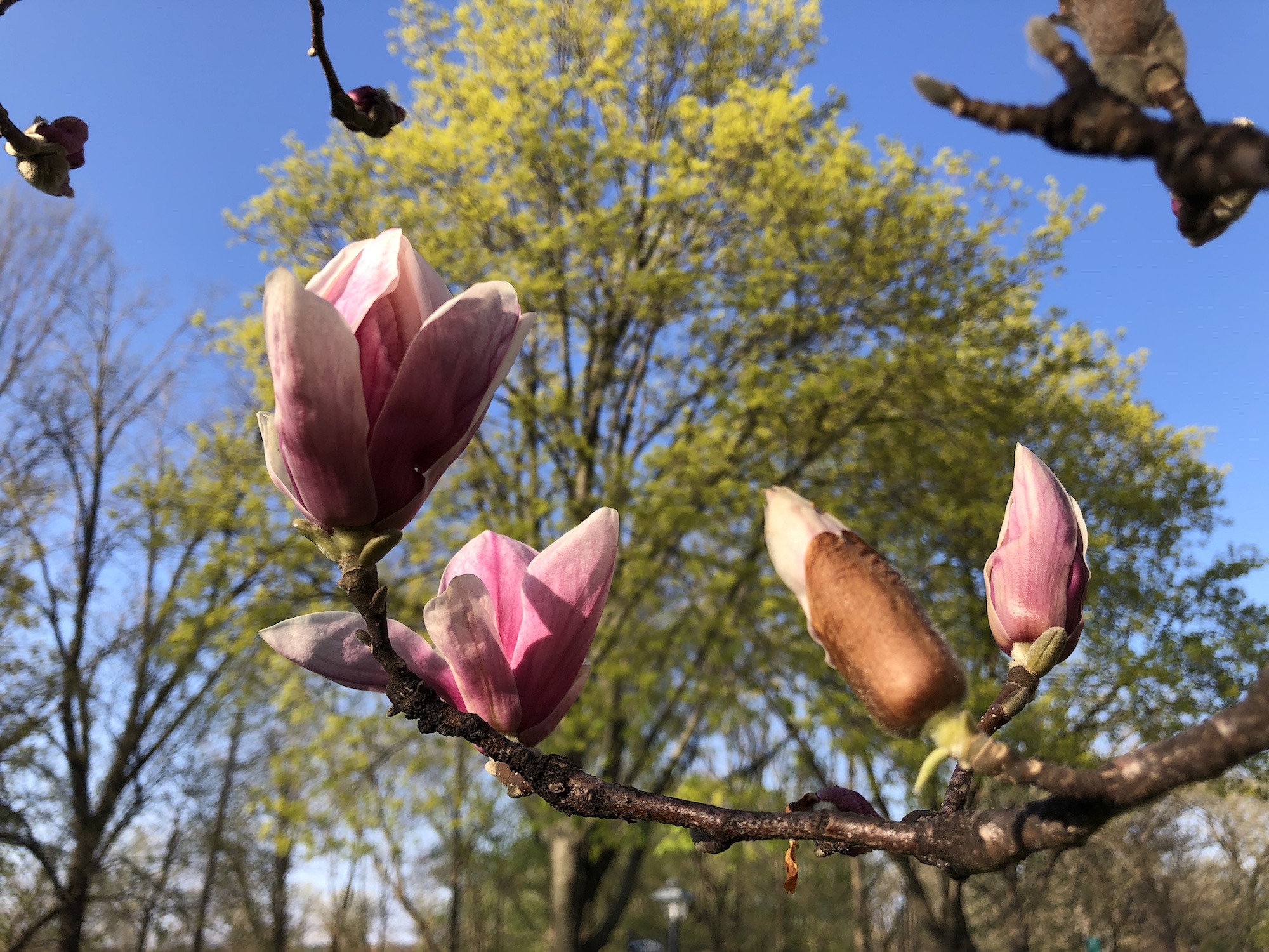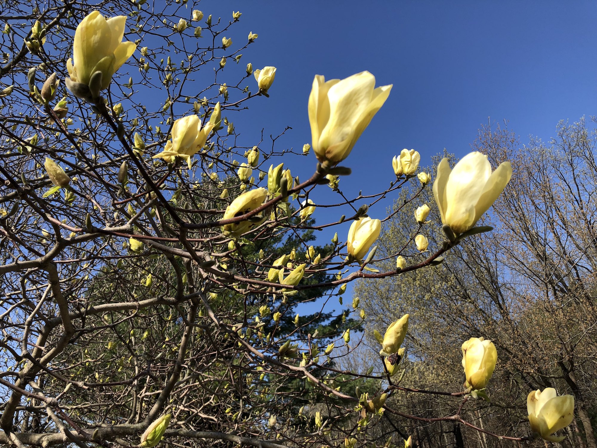 Below: Yellow Magnolia blossoms in Longenecker Gardens around 9:25 AM.