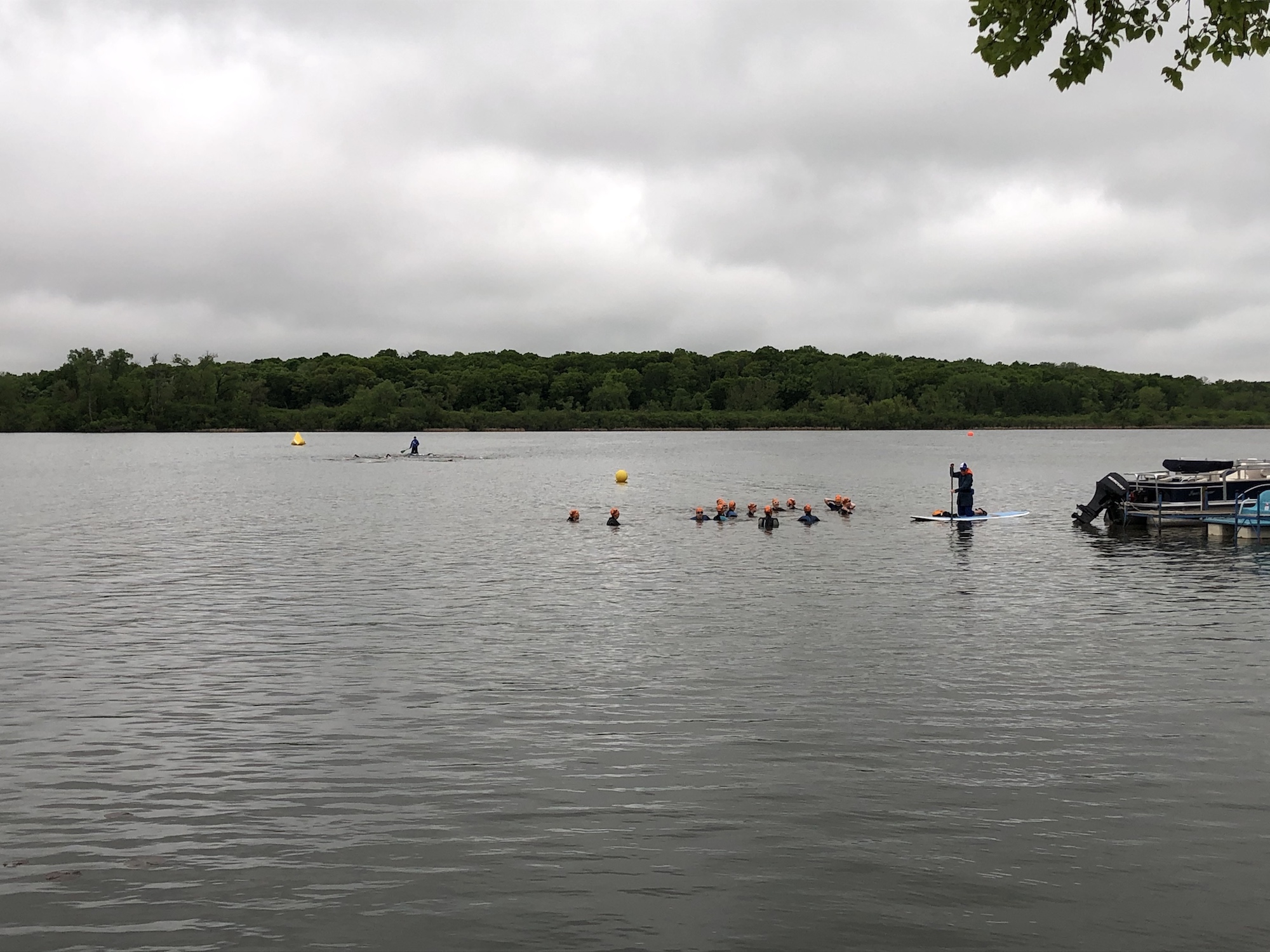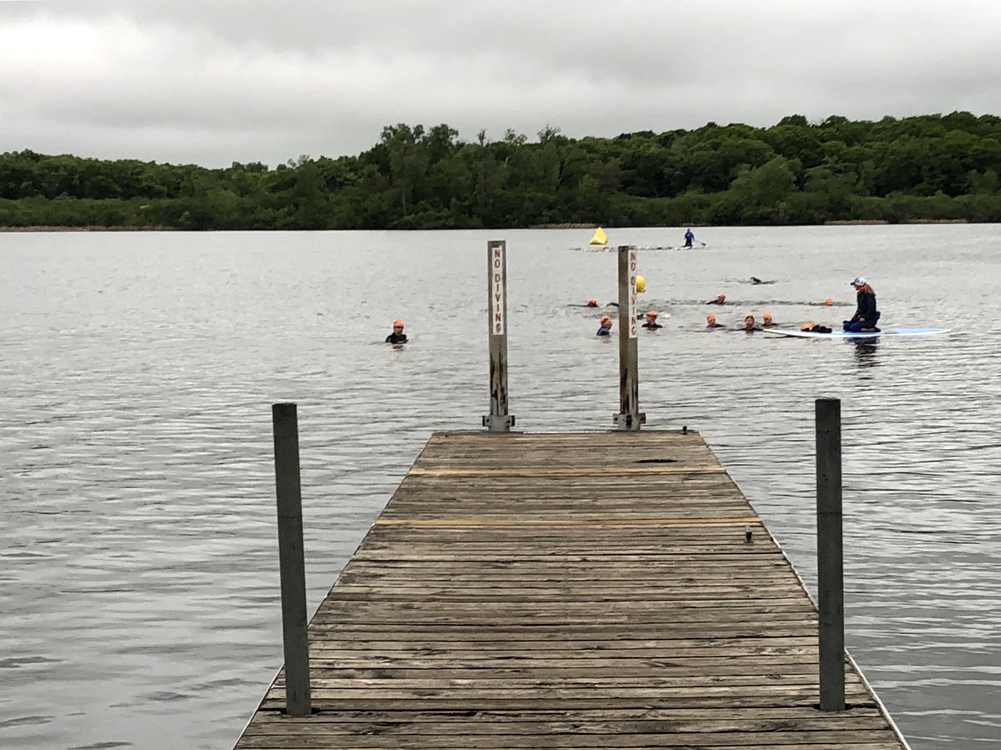 Note: Swimmers training in Lake Wingra. Large yellow buoy. Muskrat in Cattails. Three Wild Turkeys by Duck Pond (one perched on bench).