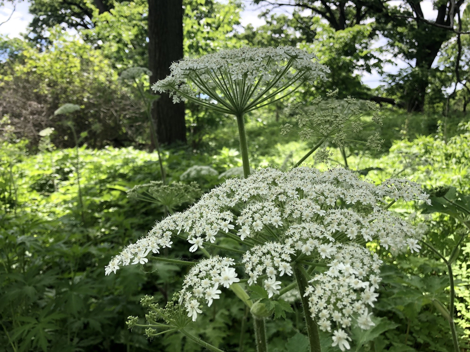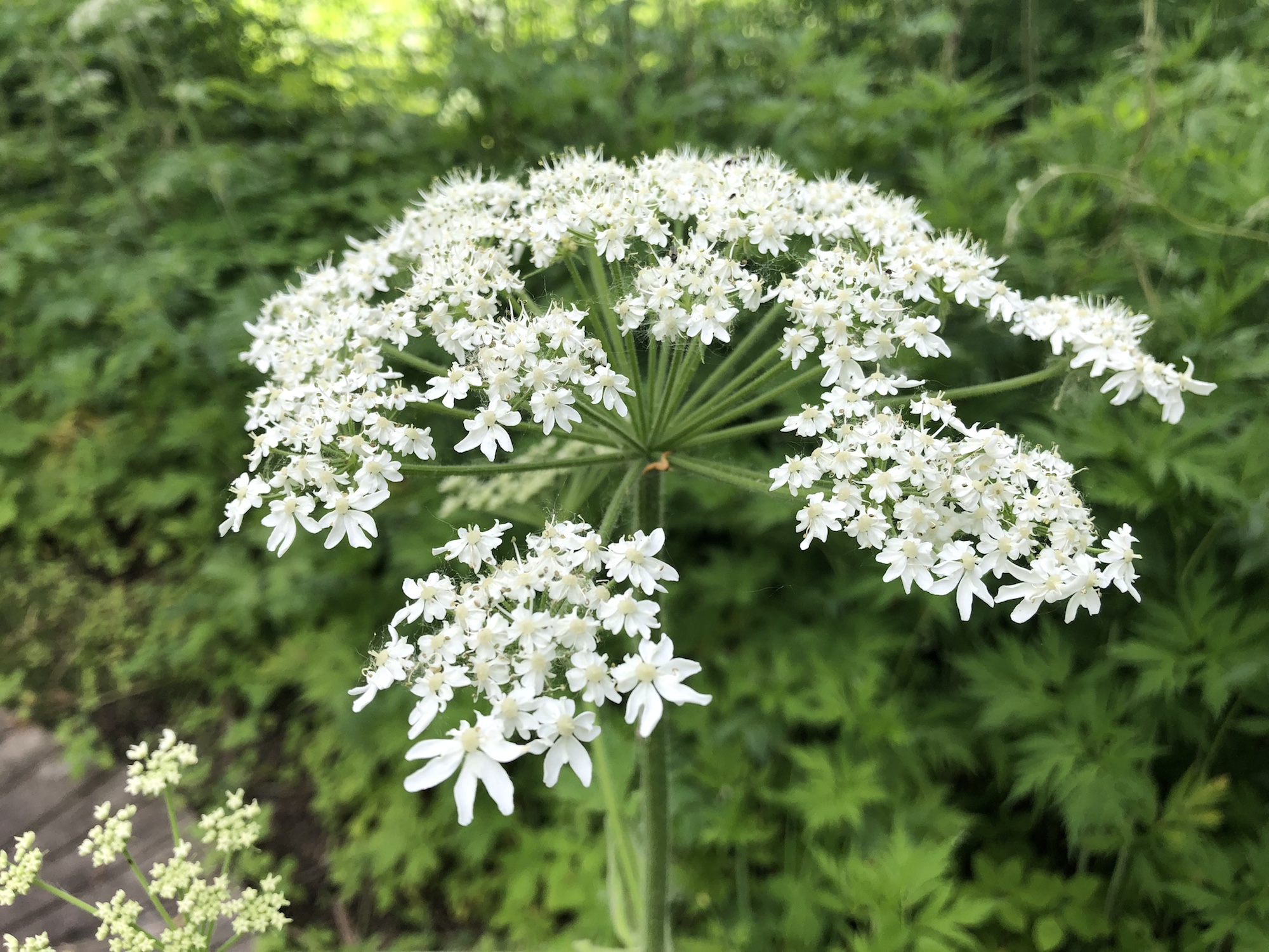 Above: Large white flower (Cow Parsnip/Heracleum maximum) in marsh wetlands along Ho-Nee-Um Pond boardwalk on June 8, 2019 (60°).
