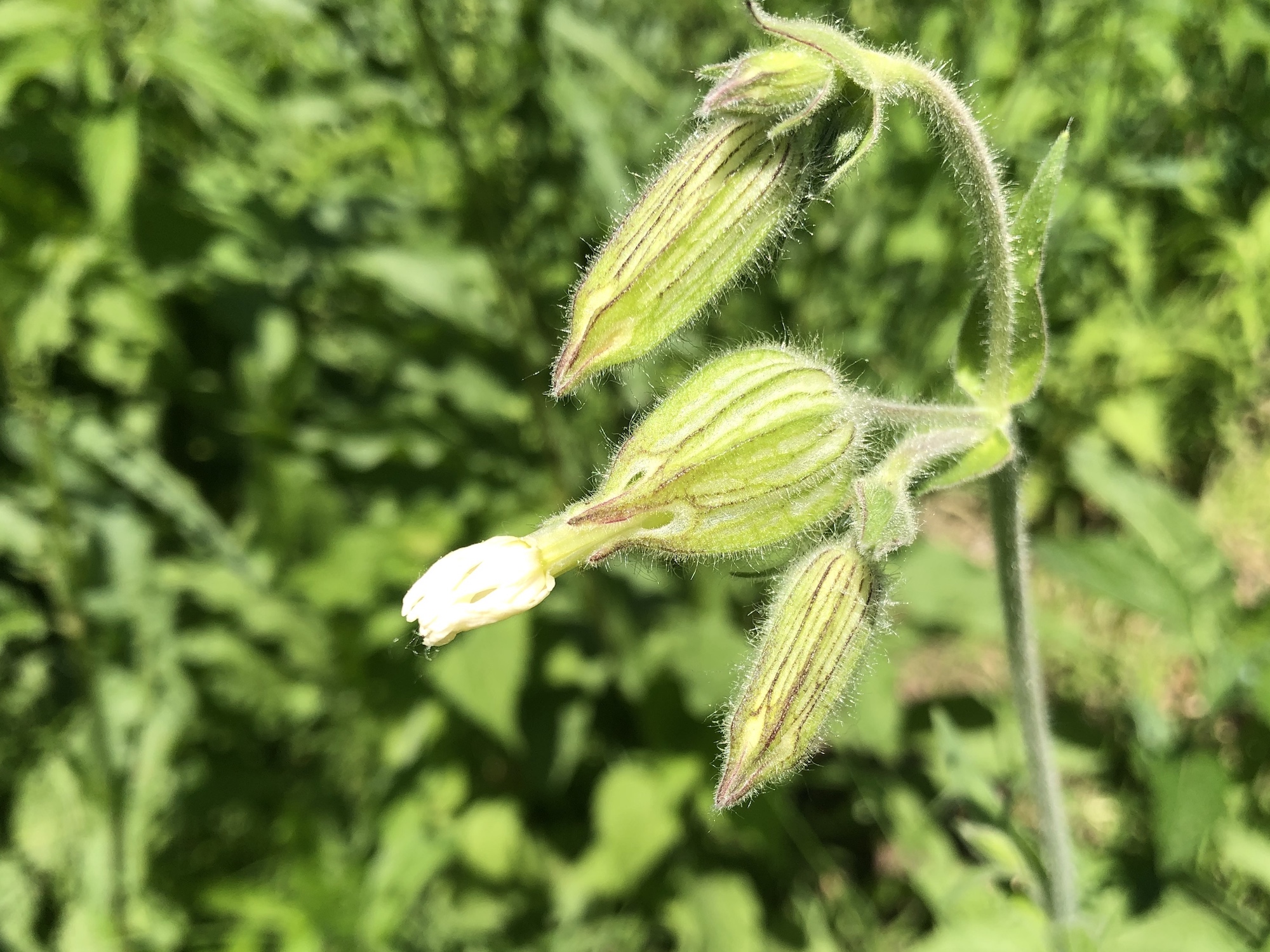 Below: White Campion (Evening Lychnis) closed during day on June 10, 2019. Blooms close in sunlight and open in evening.