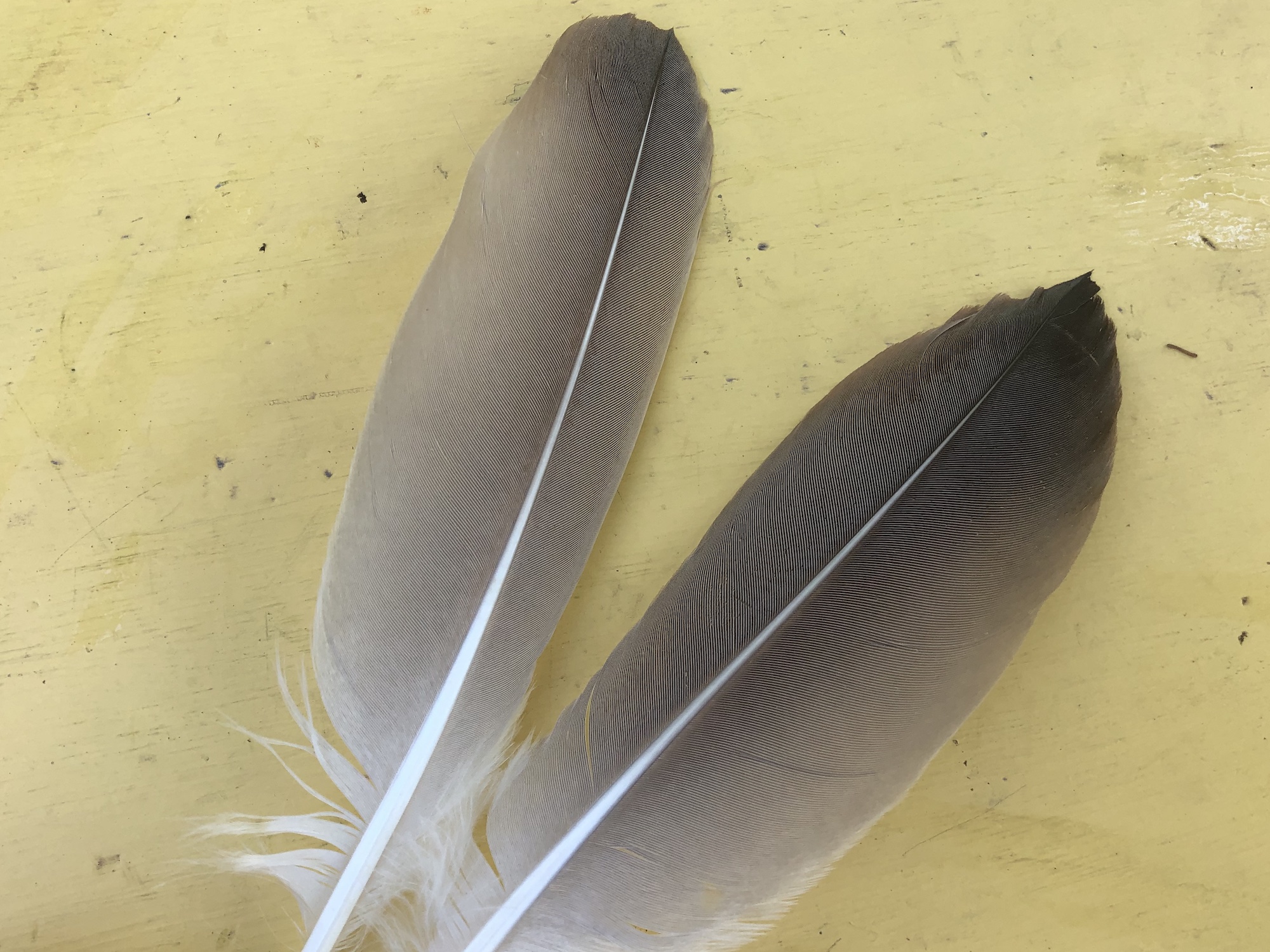 Below: Sandhill Crane feathers found by Marion Dunn Pond on June 13, 2019.