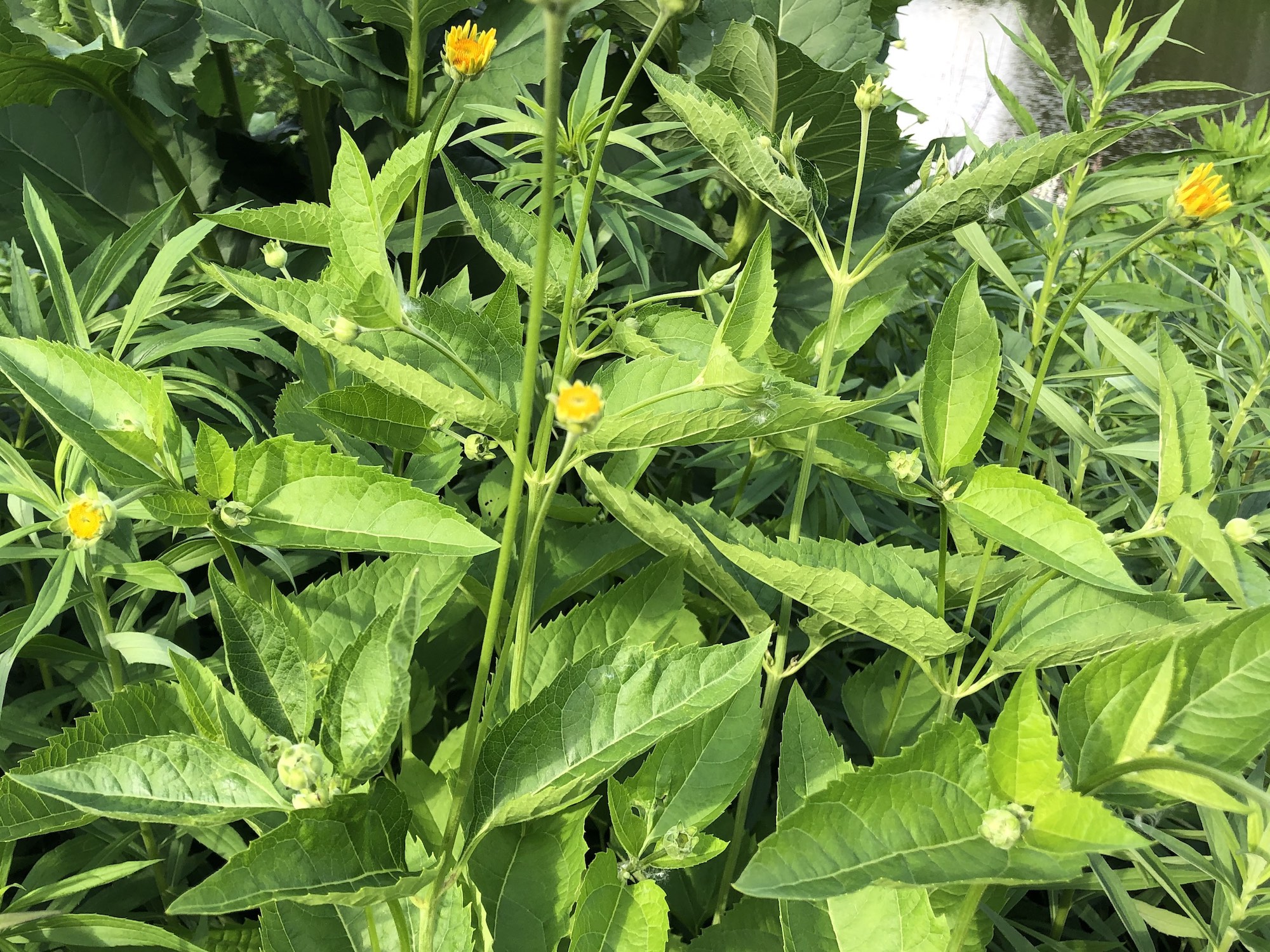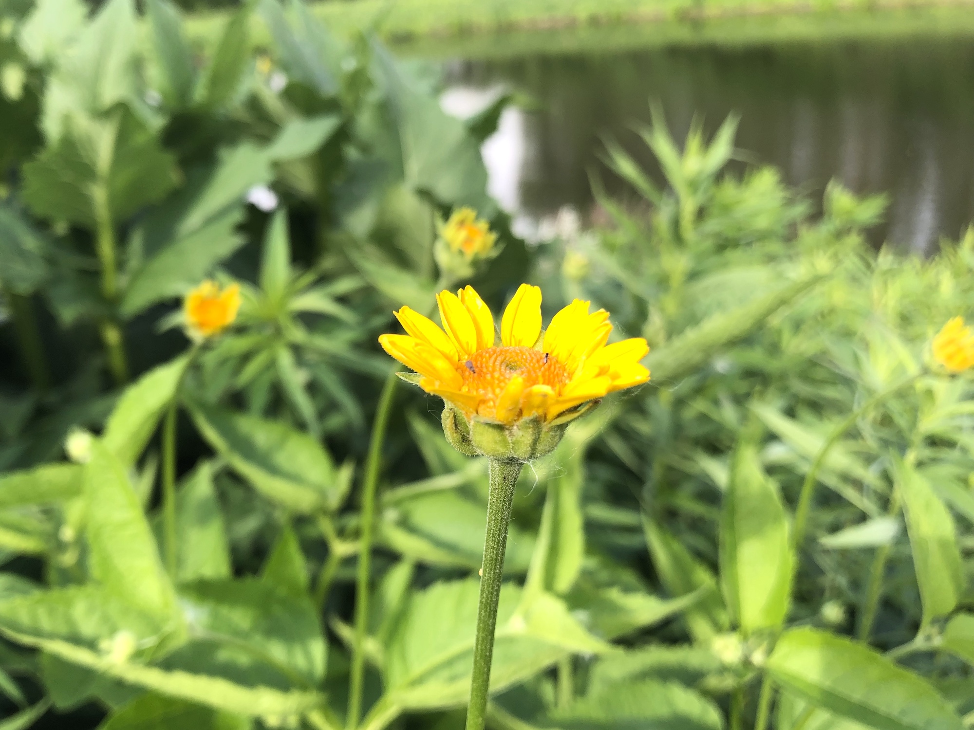 Above: yellow/orange flower to be identified on the banks of the retaining pond on corner of Nakoma Road and Manitou Way on June 20, 2019 (58°).