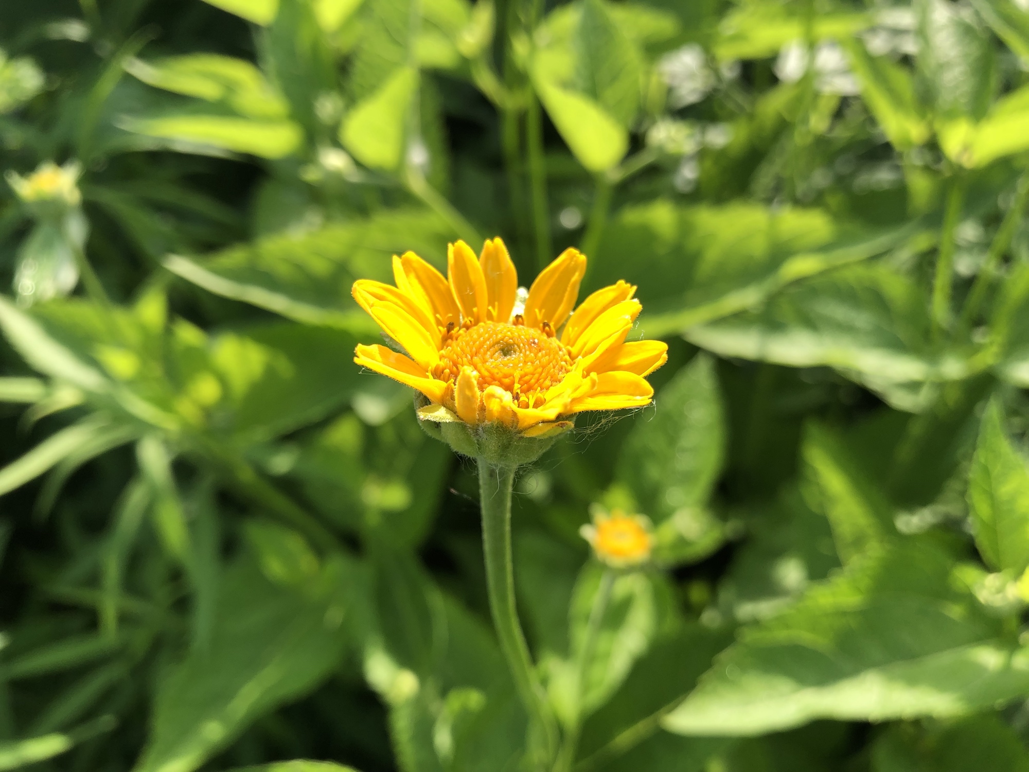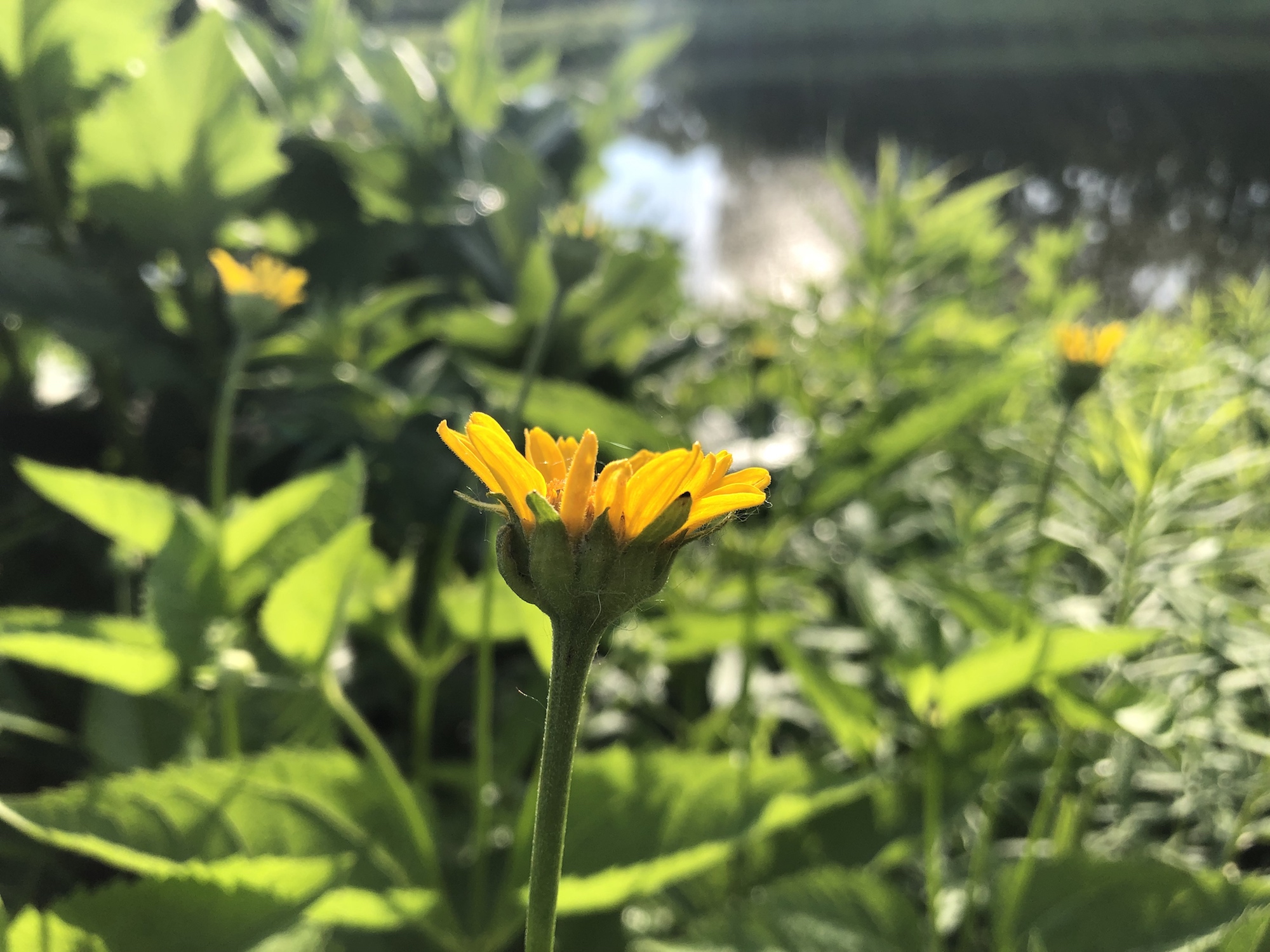 Above: yellow/orange flower to be identified on the banks of the retaining pond on corner of Nakoma Road and Manitou Way on June 21, 2019 (58°).