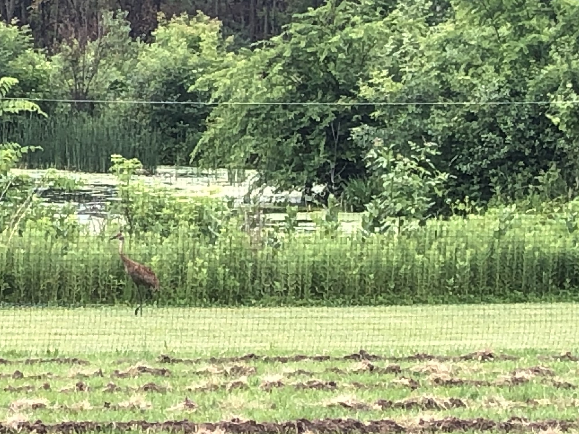 Above: Lone Sandhill Crane between Marion-Dunn Retaining Pond and the Three Sisters Garden (Corn/Bean/Squash) fence on June 23, 2019 (67°).