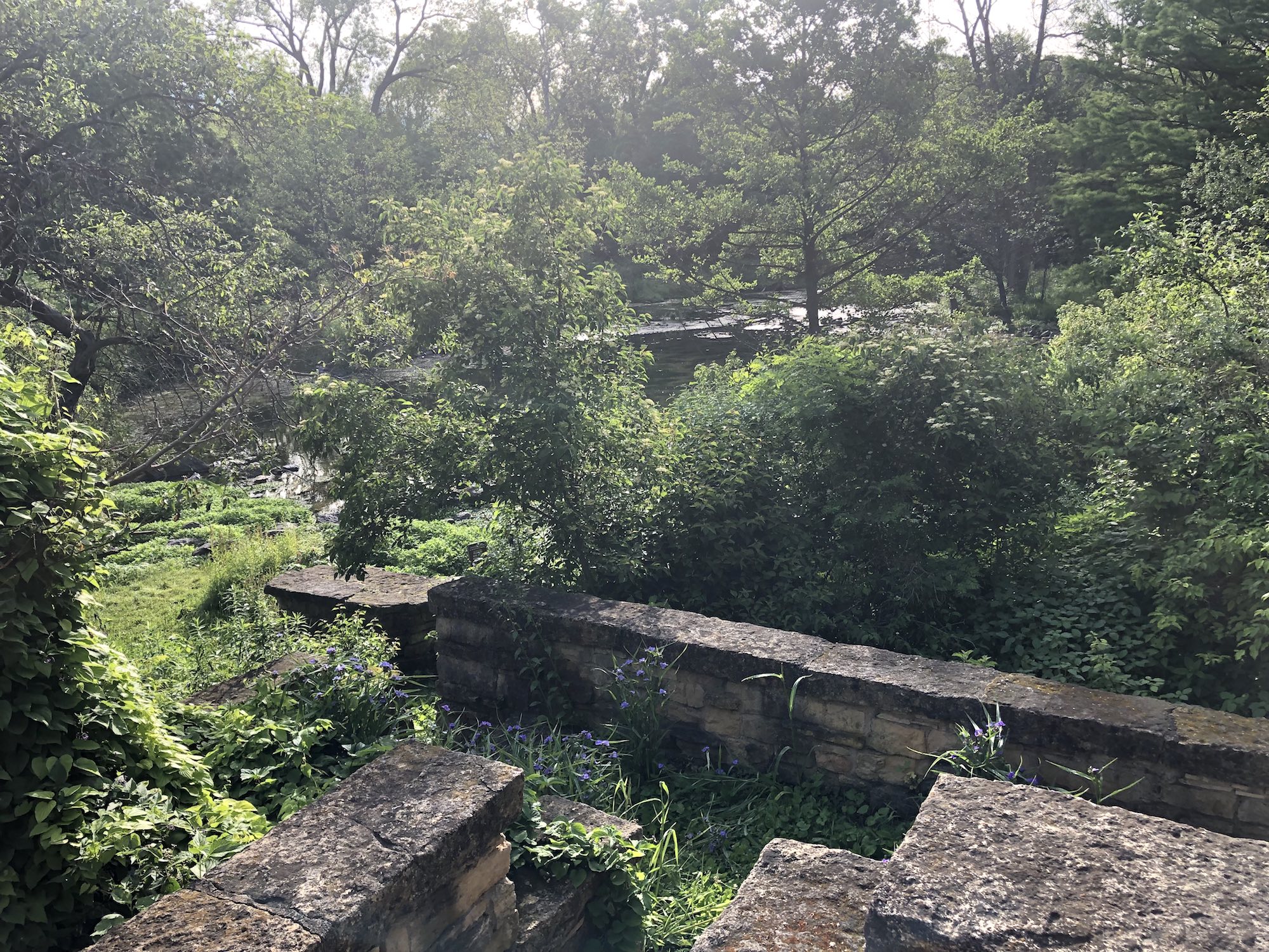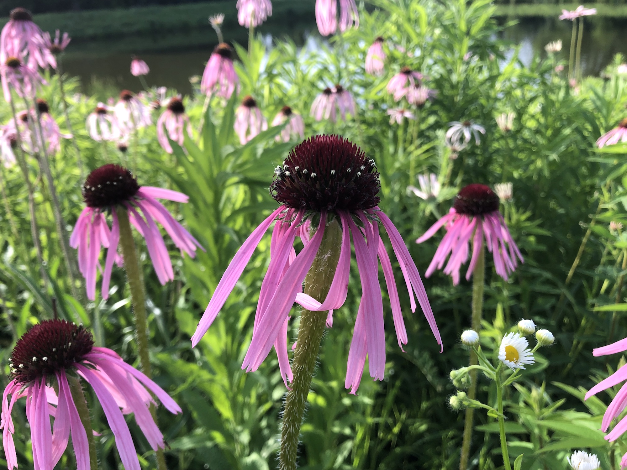 Above: Coneflower and Spiderwort on the banks of the retaining pond on corner of Nakoma Road and Manitou Way on June 26, 2019 (61°).