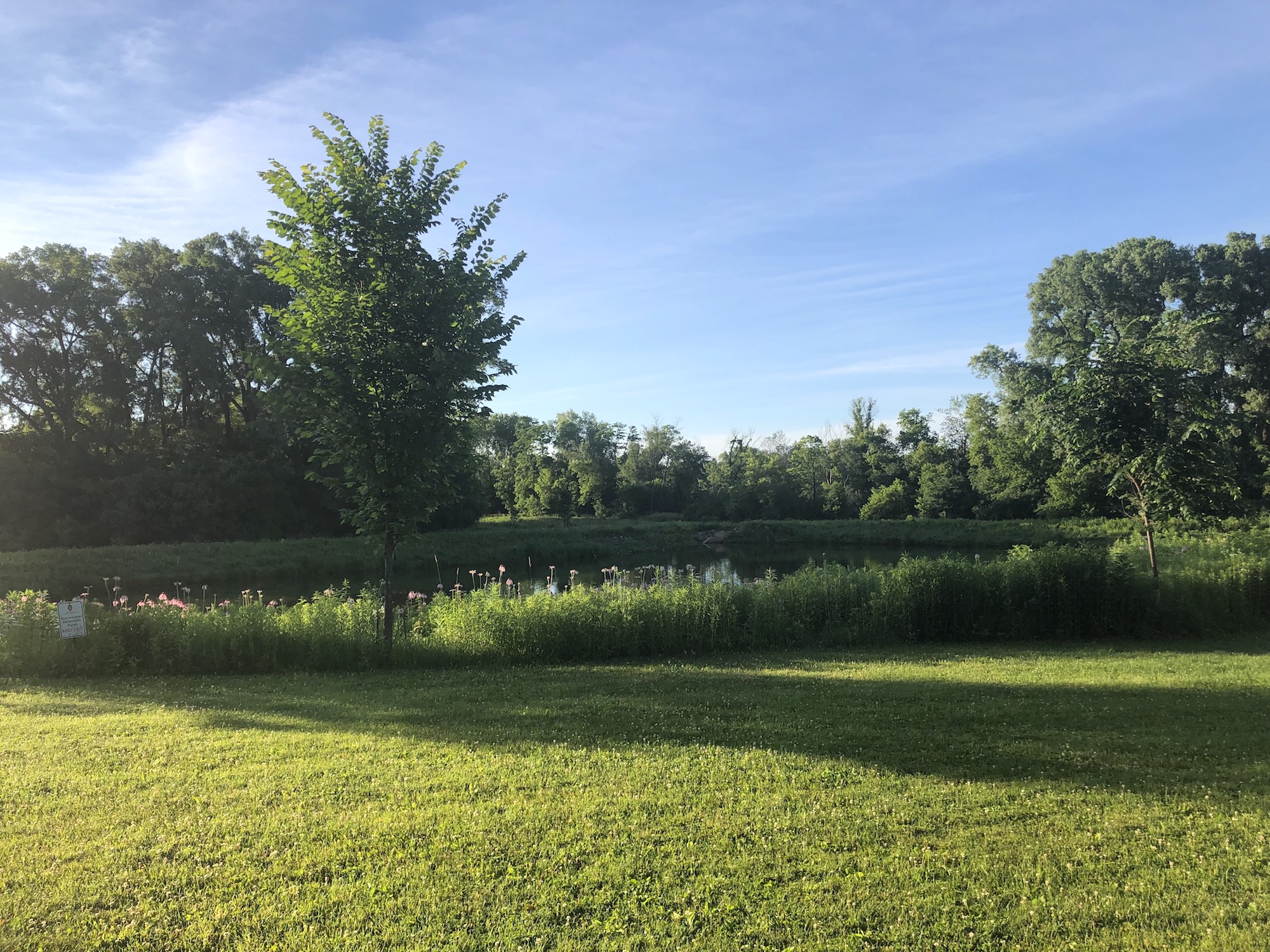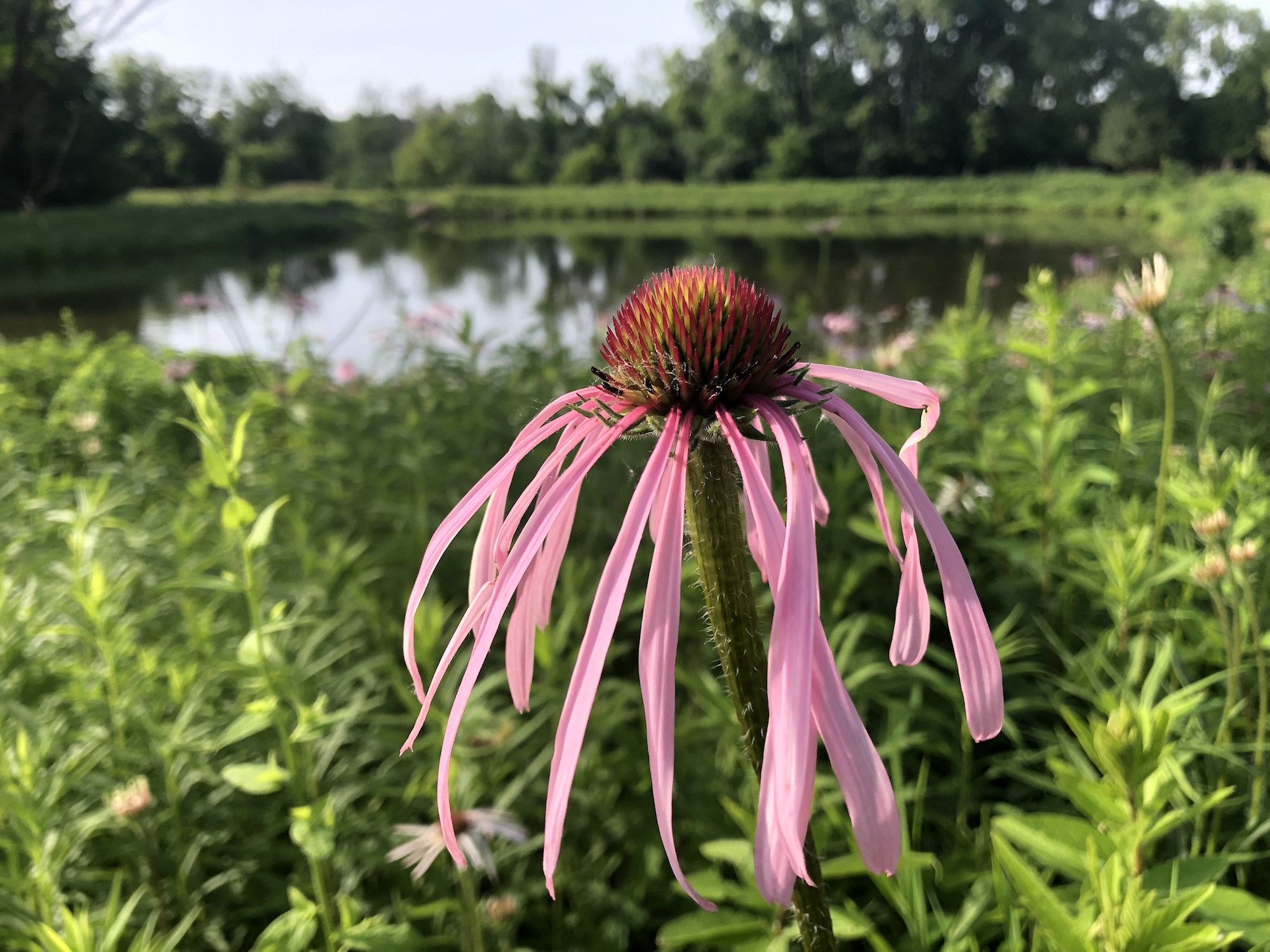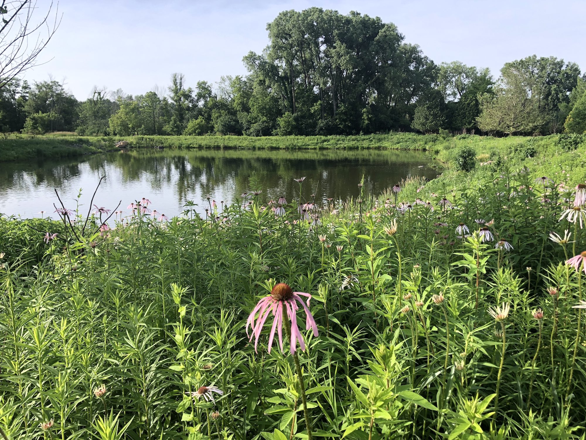 Above: Retaining pond on corner of Nakoma Road and Manitou Way on June 26, 2019 (61°). Narrow-leaved purple coneflower in foreground.