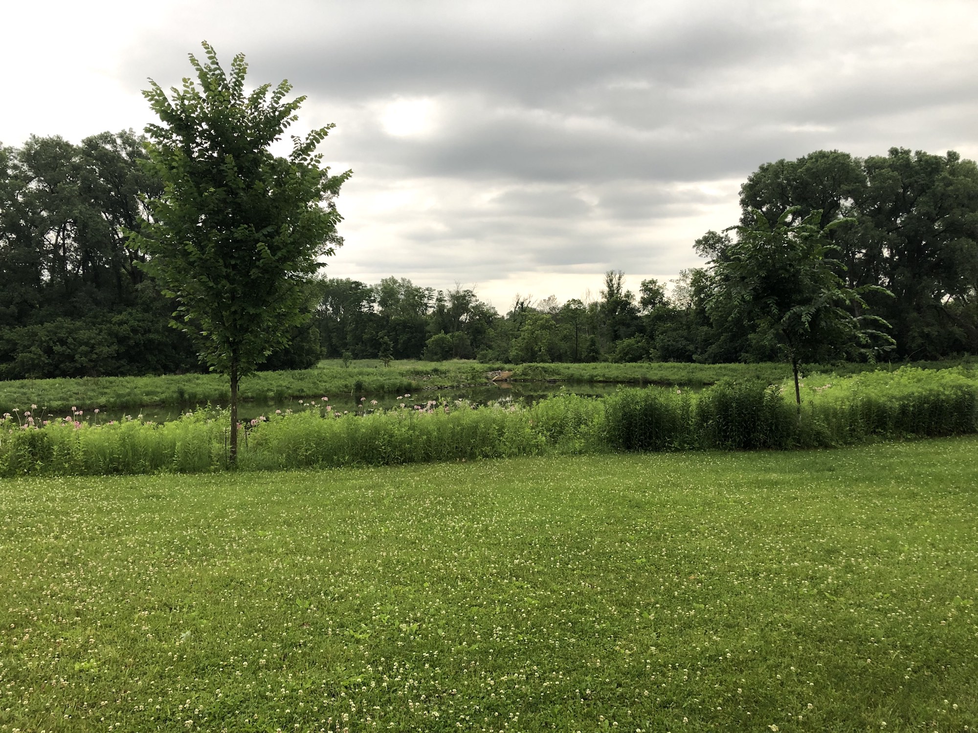 Above: Retaining pond on corner of Nakoma Road and Manitou Way on June 28, 2019 (61°). Narrow-leaved purple coneflower in foreground.