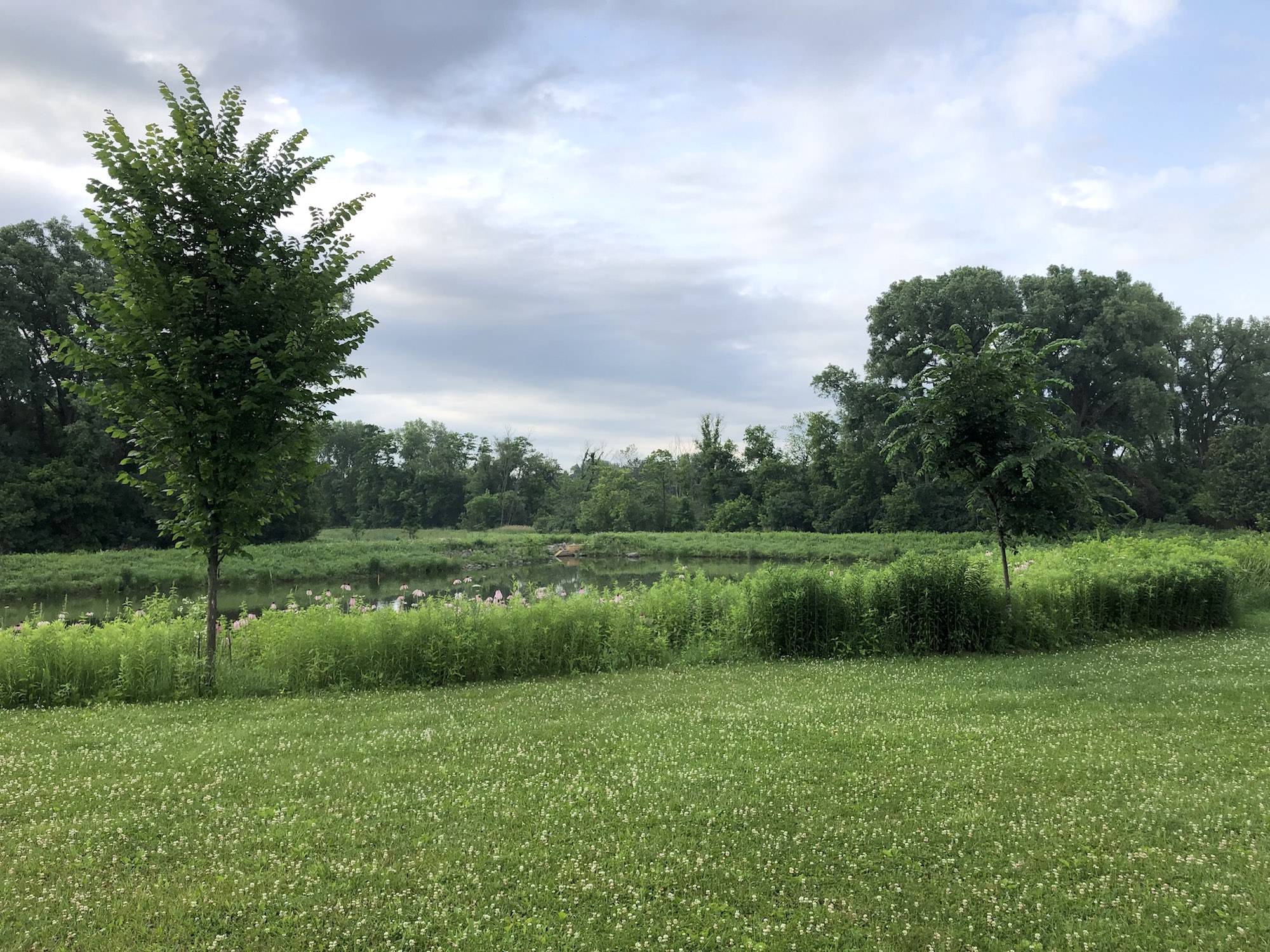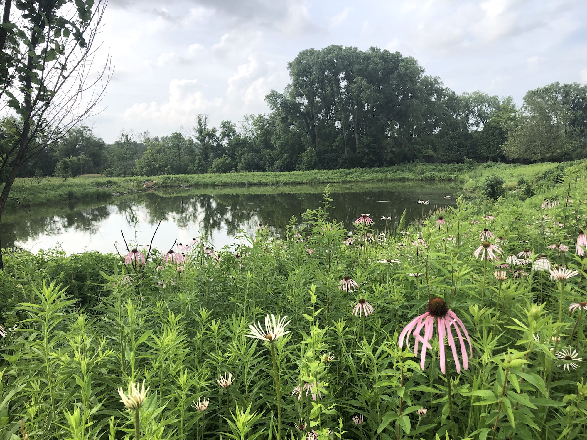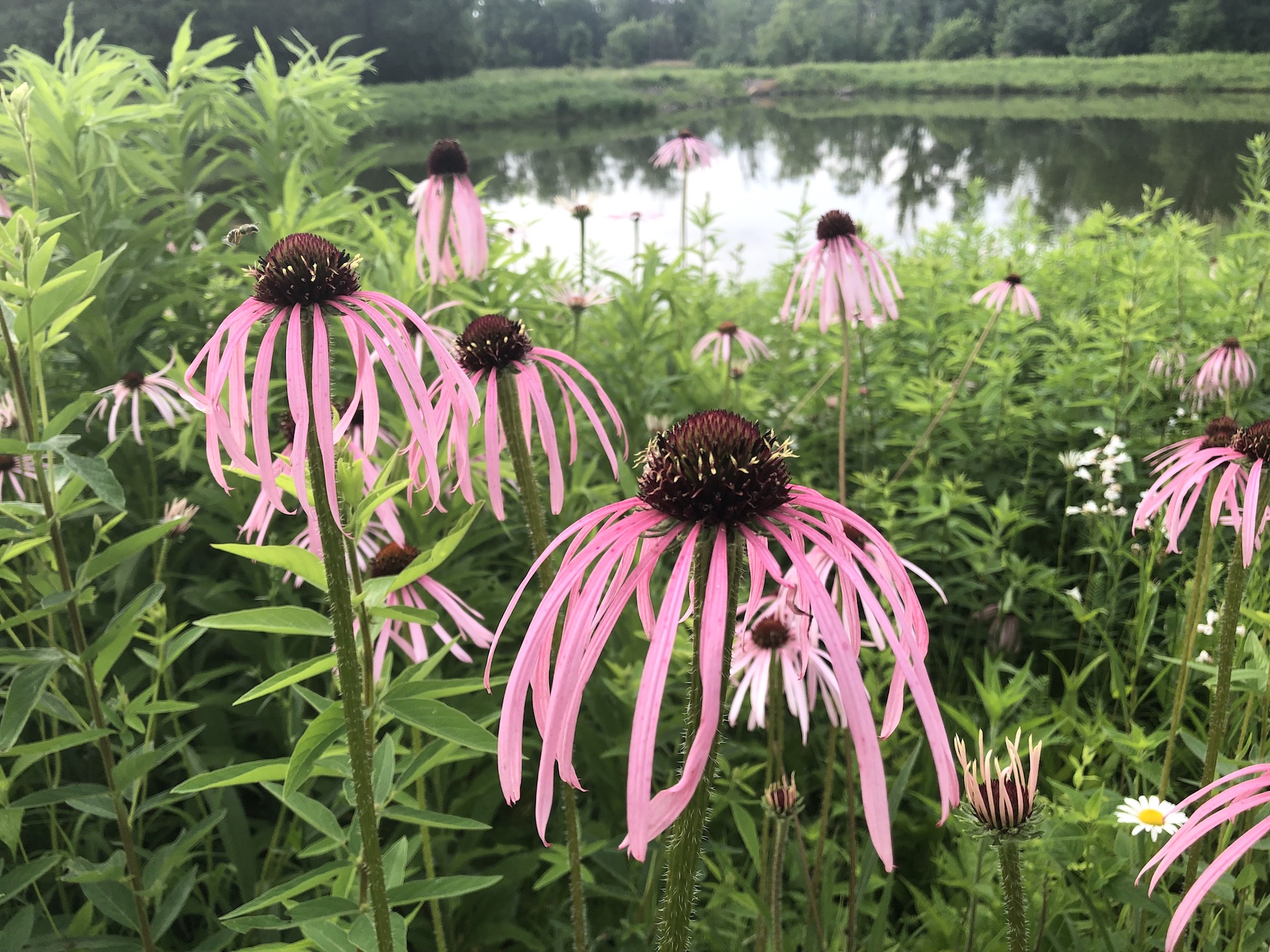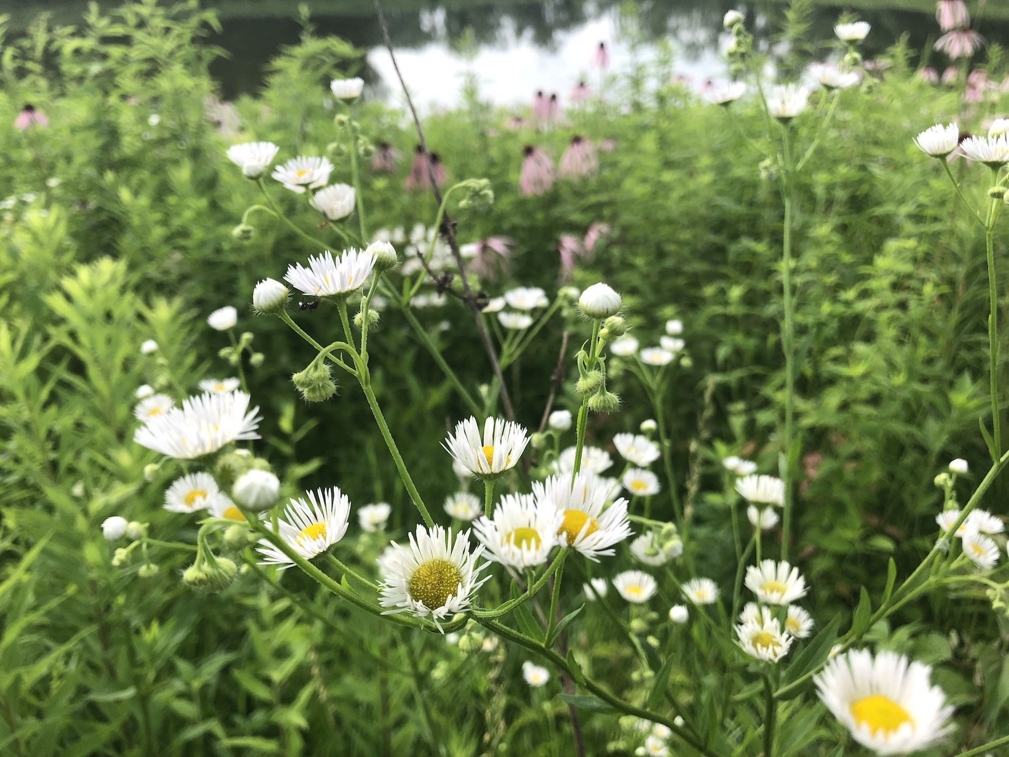 Above: Retaining pond on corner of Nakoma Road and Manitou Way on June 30, 2019 (78°). Narrow-leaved purple coneflower and daisies in foreground.