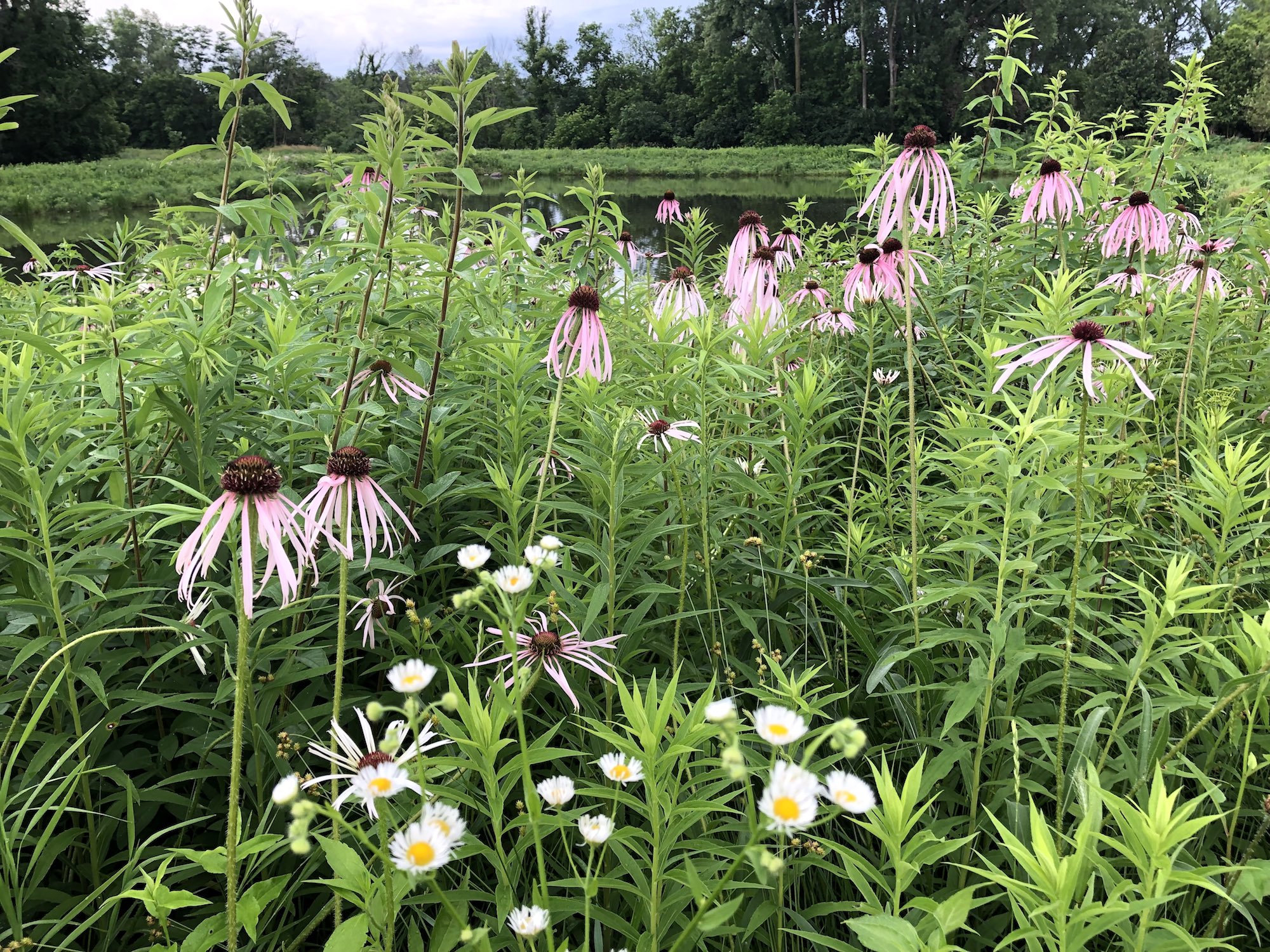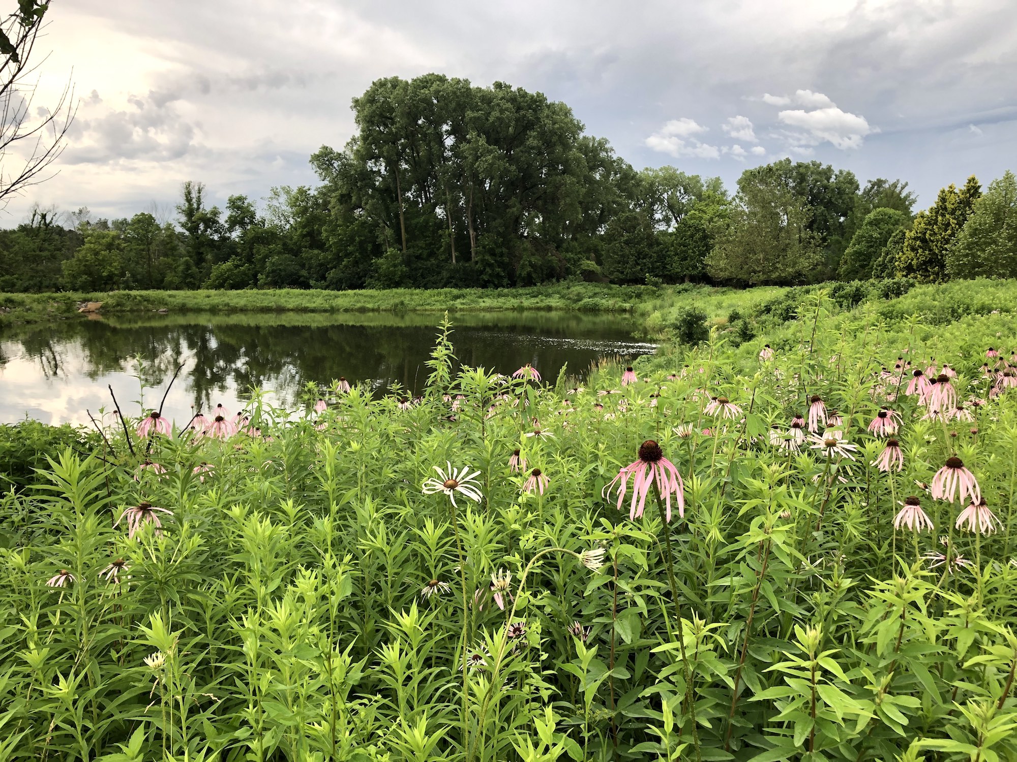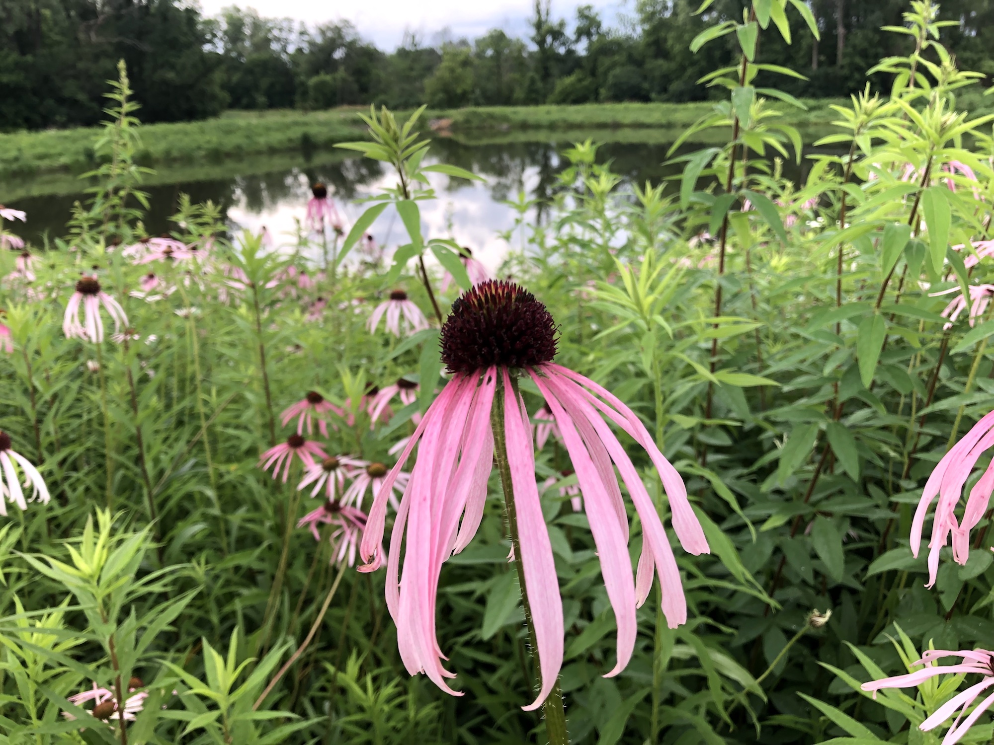 Above: Retaining pond on corner of Nakoma Road and Manitou Way on July 1, 2019 (68°). Narrow-leaved purple coneflower in foreground.