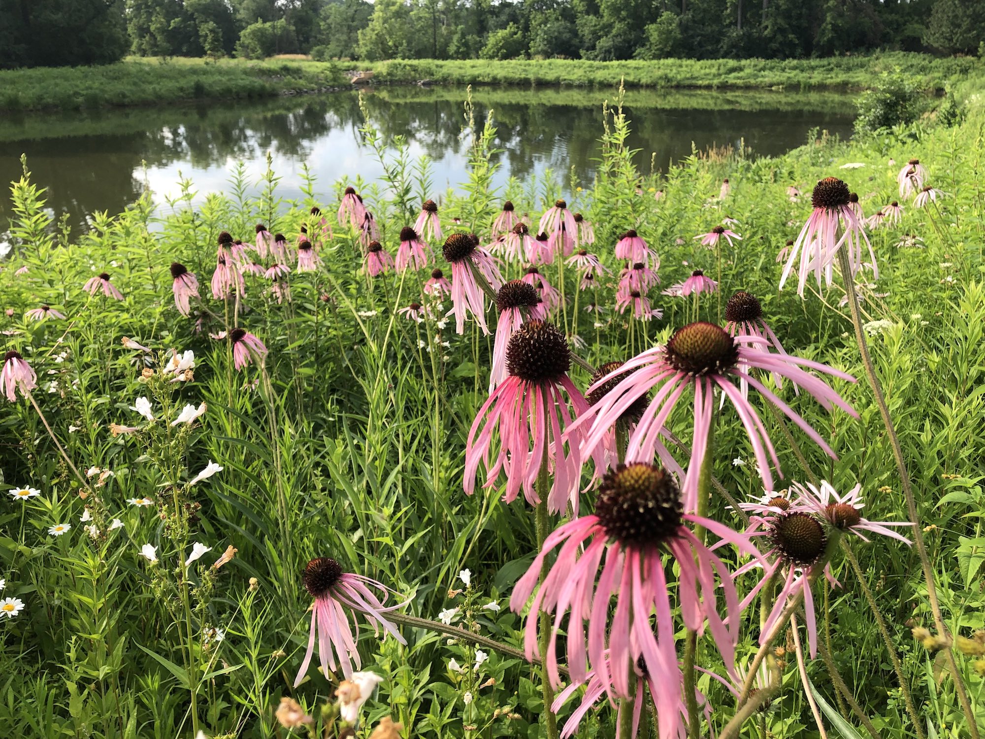 Above: Retaining pond on corner of Nakoma Road and Manitou Way on July 3, 2019 (68°). Narrow-leaved purple coneflower in foreground.