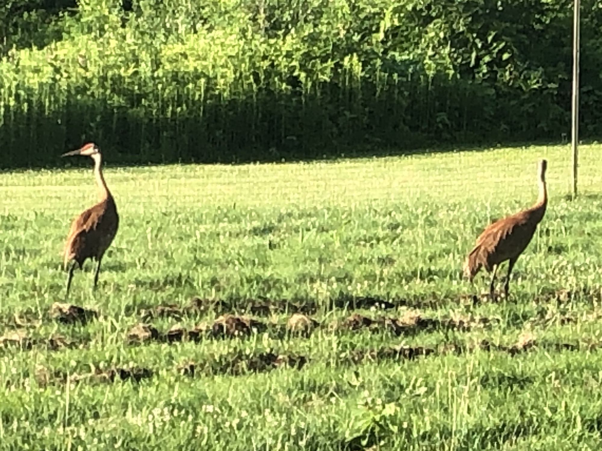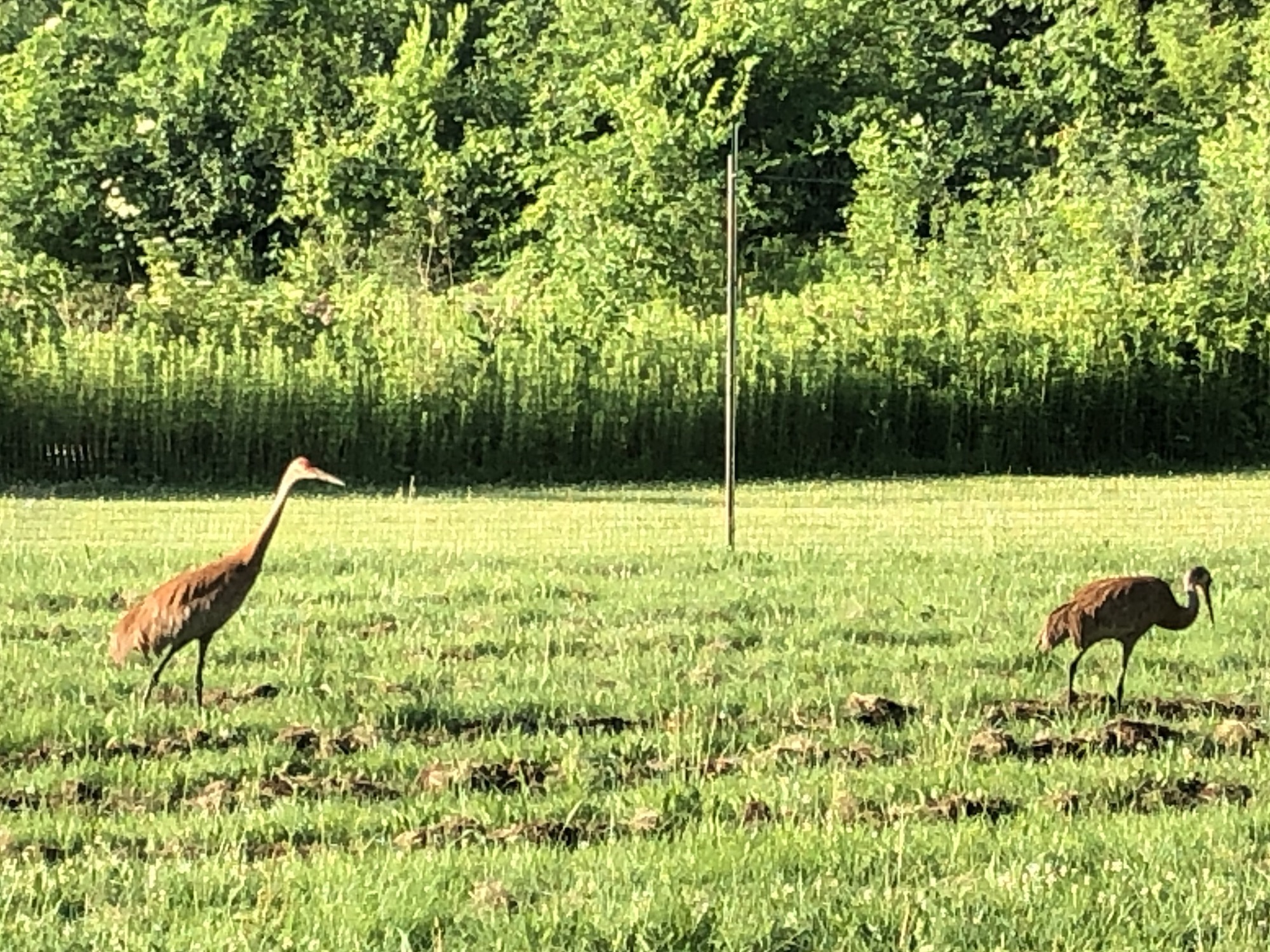 Above: Sandhill Cranes feasting in Three Sisters Garden by Marion Dunn on July 5, 2019 (74°).