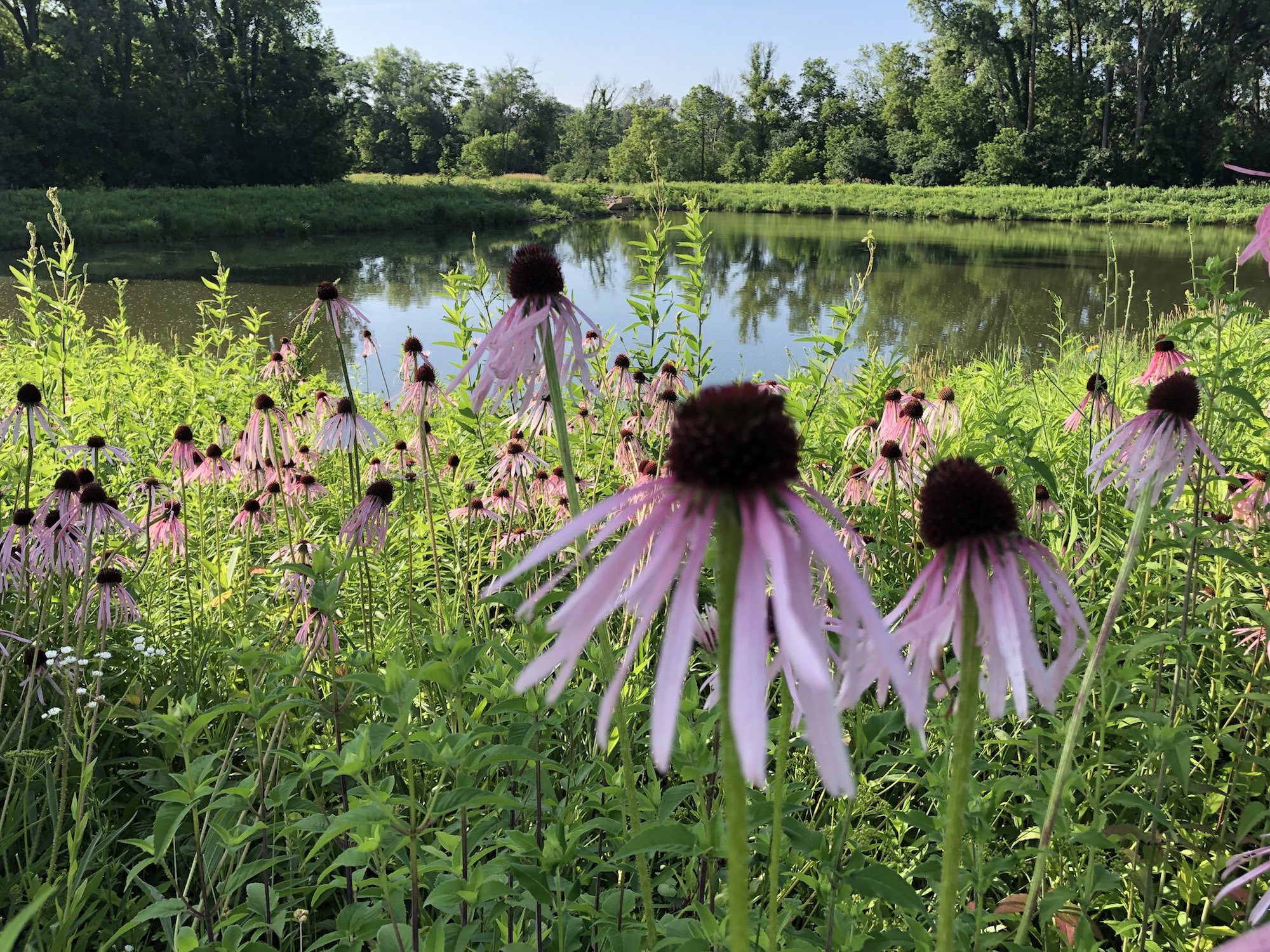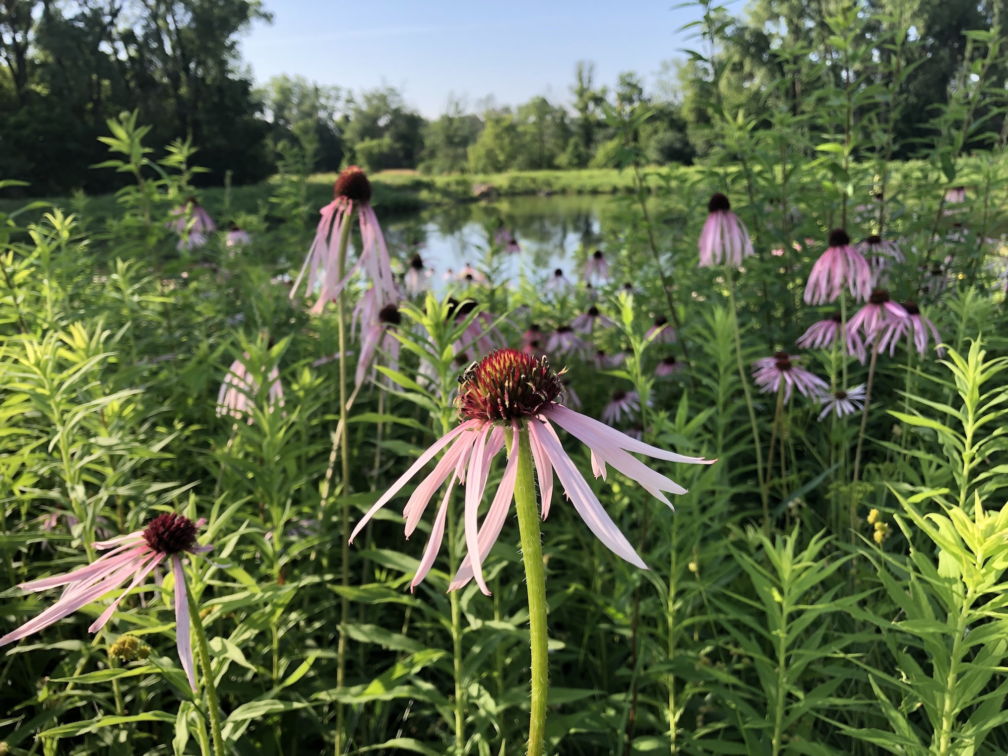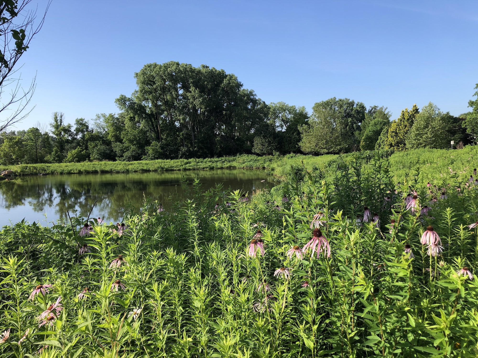 Above: Retaining pond on corner of Nakoma Road and Manitou Way on July 5, 2019 (74°). Narrow-leaved purple coneflower in foreground.