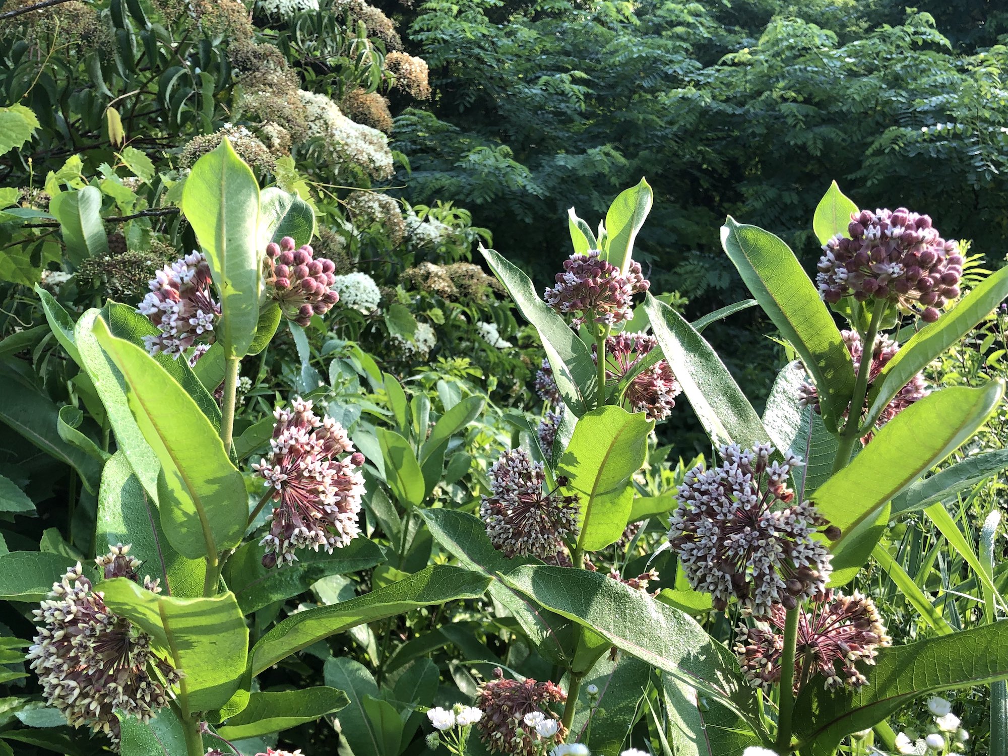 Above: Milkweed on the southeast bank of the Marion Dunn pond on July 8, 2019 (64°).