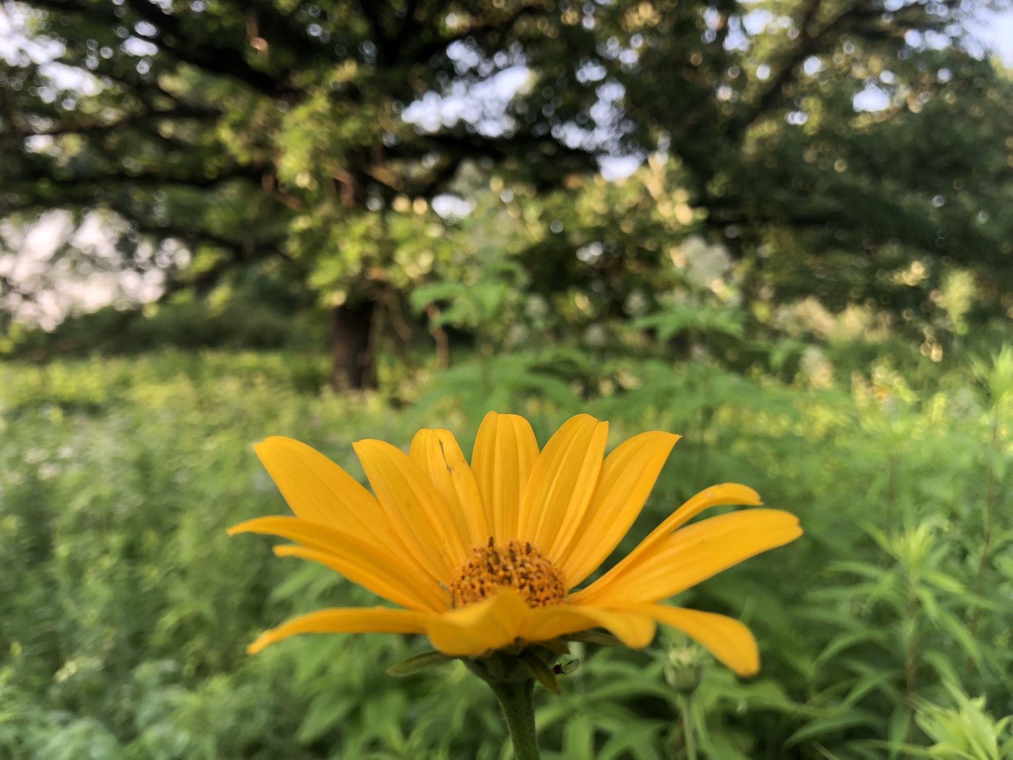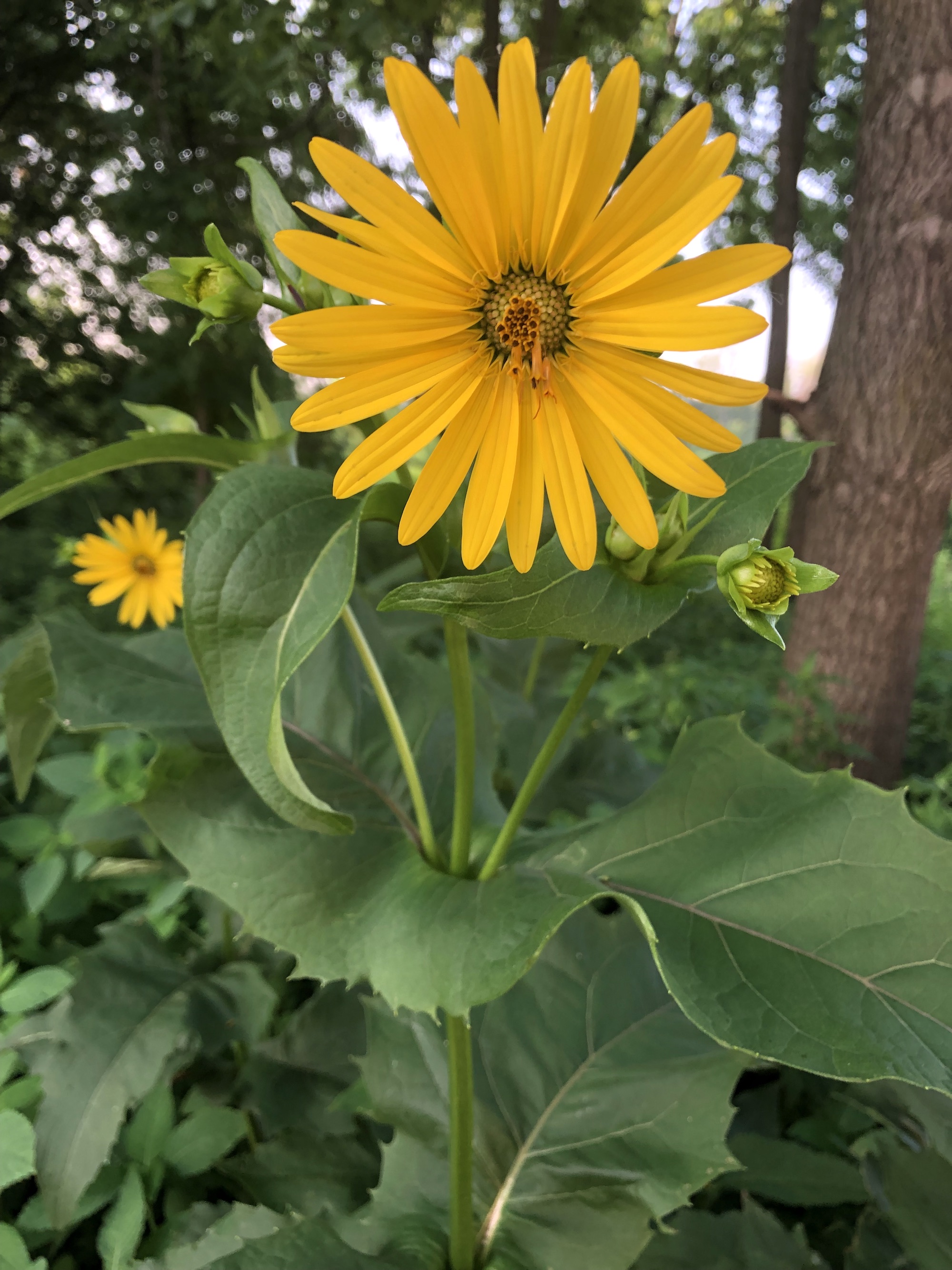 Above: Sunflower in woods between the Marion Dunn pond and the Oak Savanna on July 8, 2019 (64°).