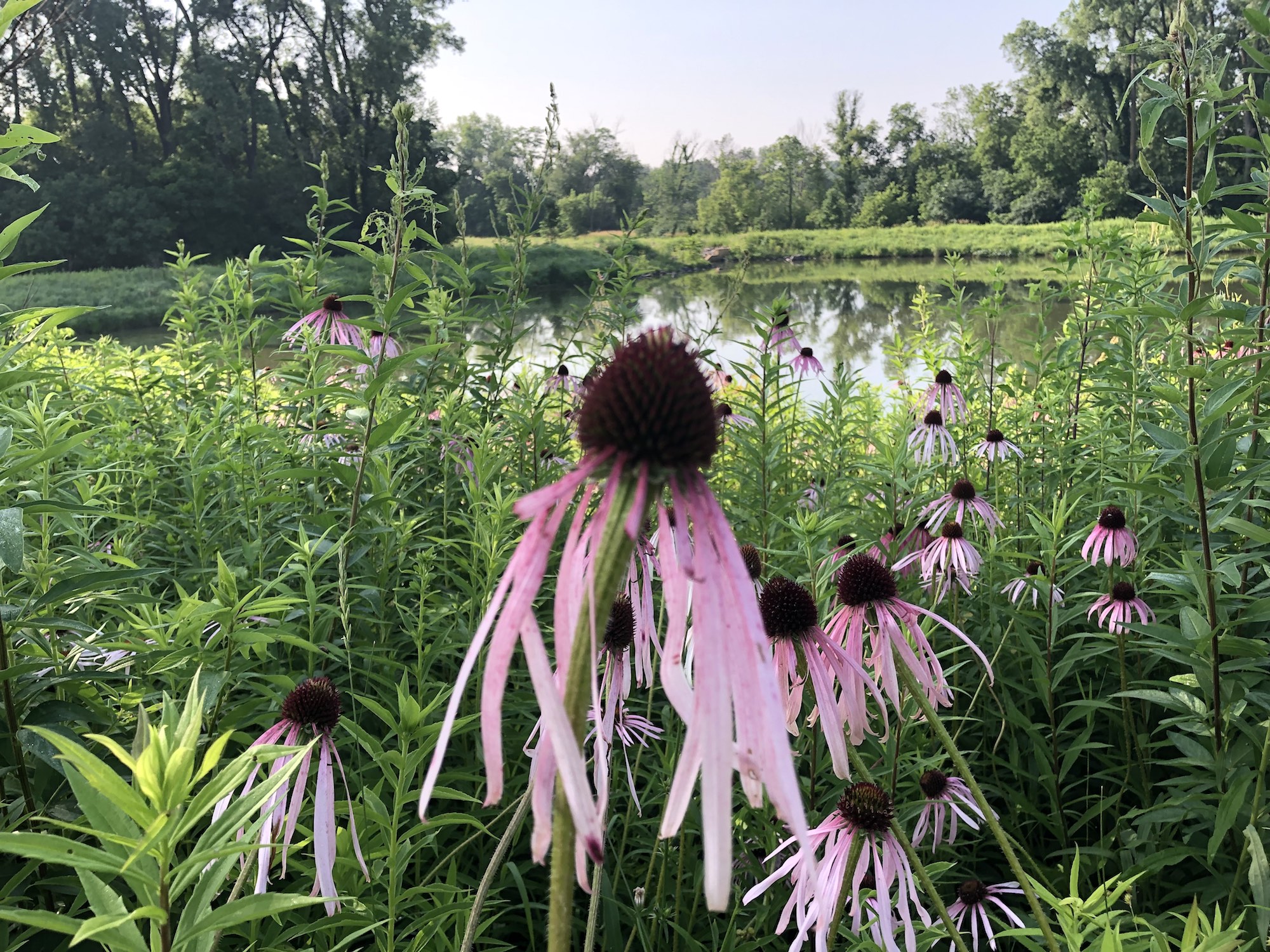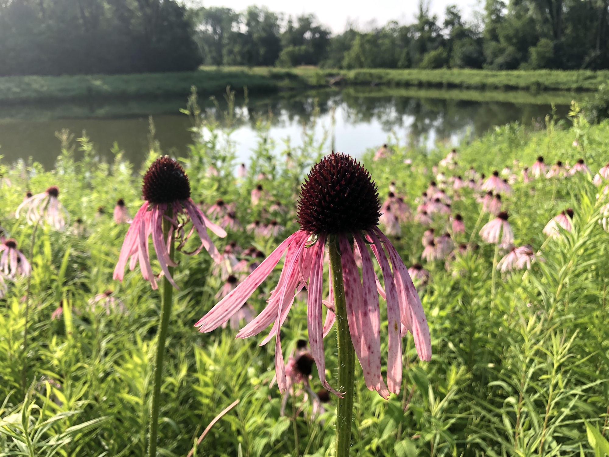 Above: Retaining pond on corner of Nakoma Road and Manitou Way on July 8, 2019 (64°). Narrow-leaved purple coneflower in foreground.