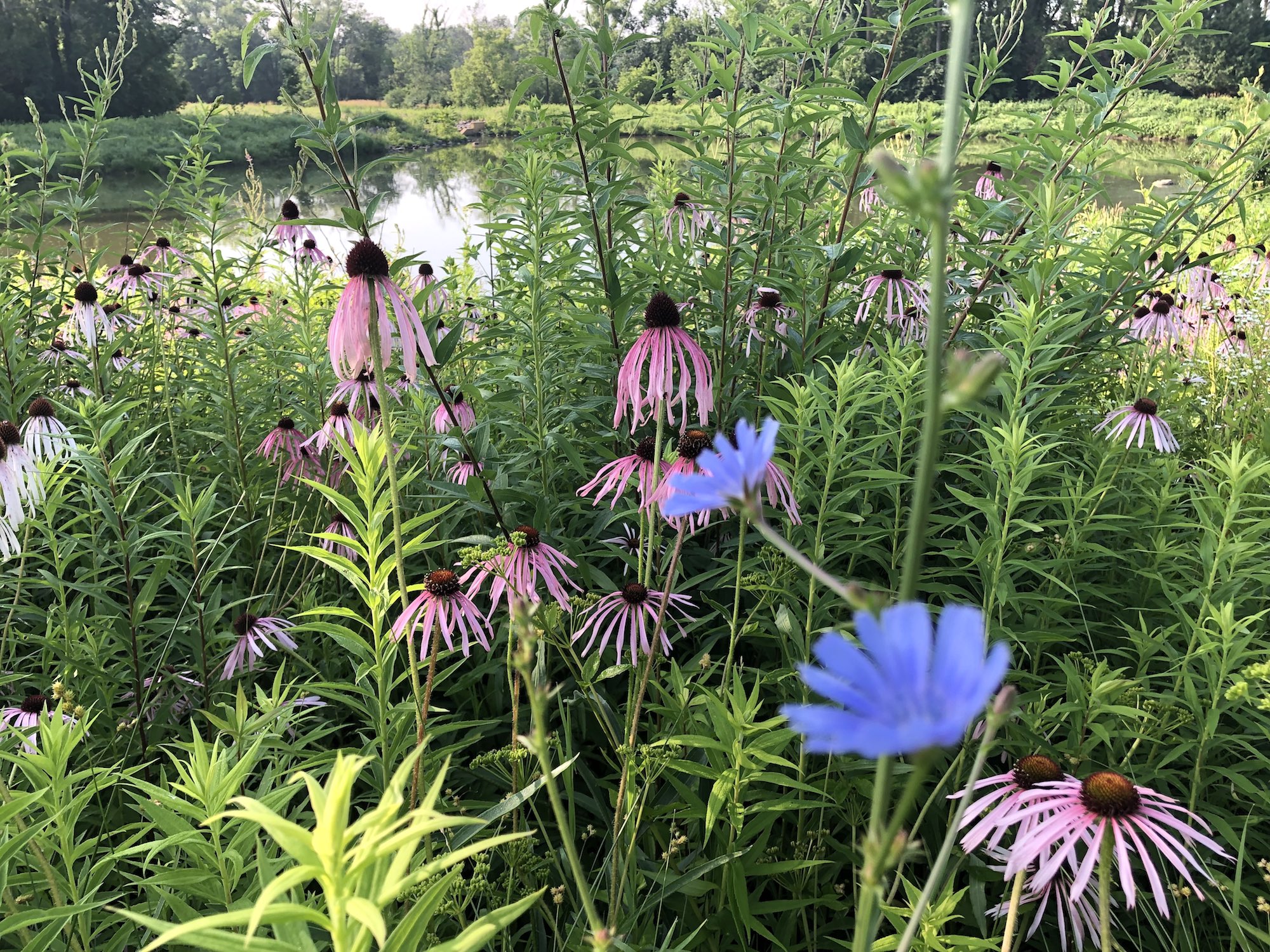 Above: Chicory on banks of retaining pond on July 8, 2019 (64°).