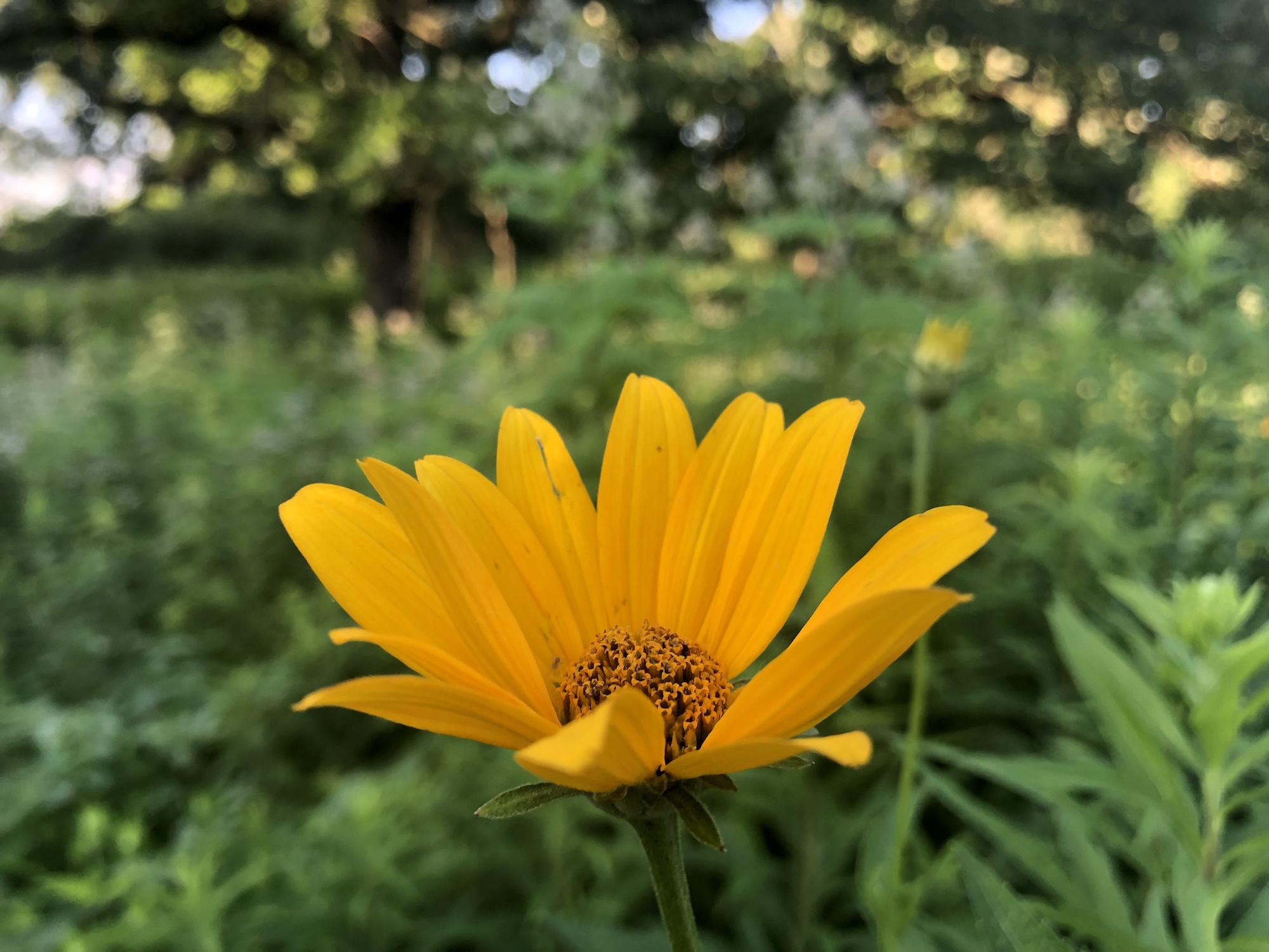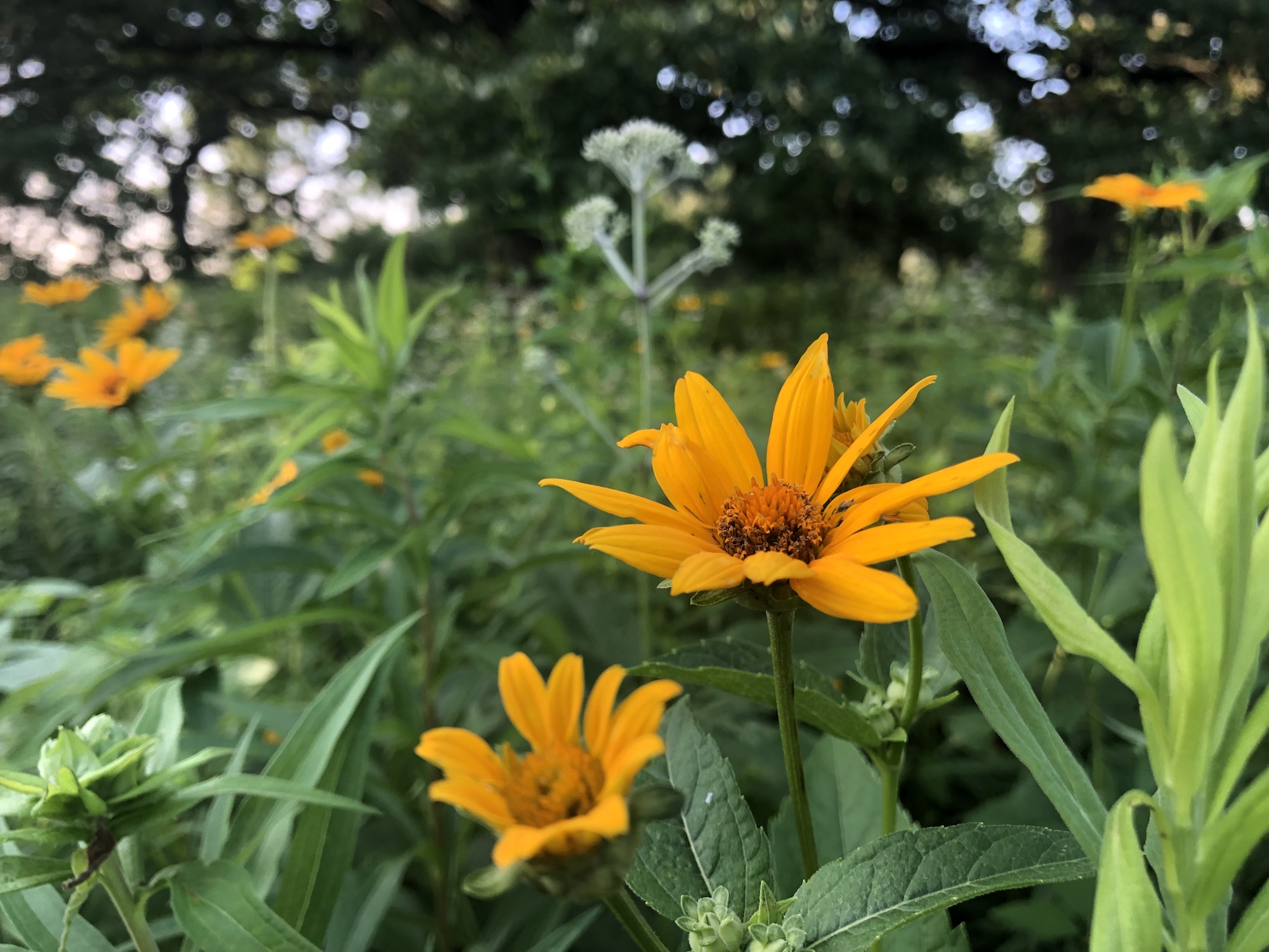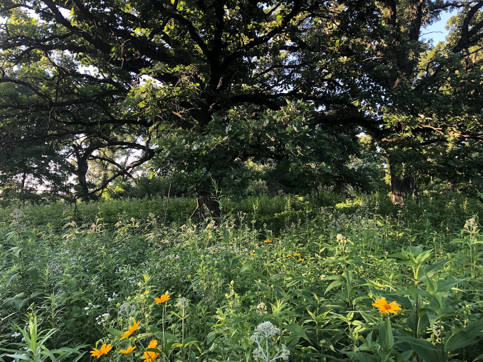 Above: Oak Savanna on July 11, 2019 (69°). Fleabane and False Sunflowers in foreground.