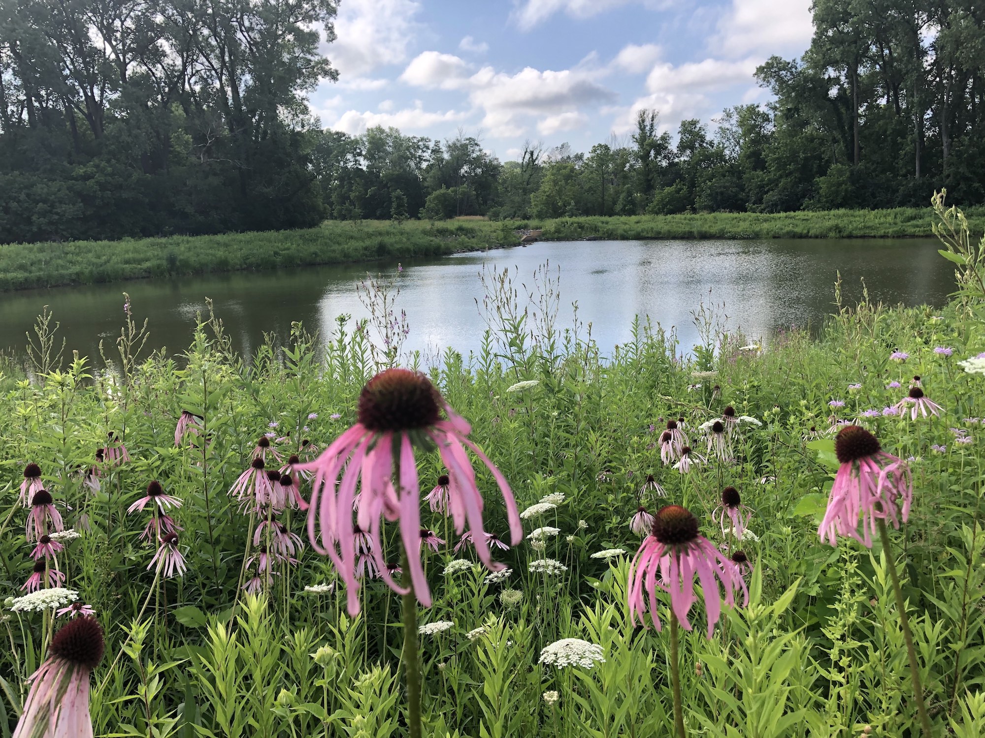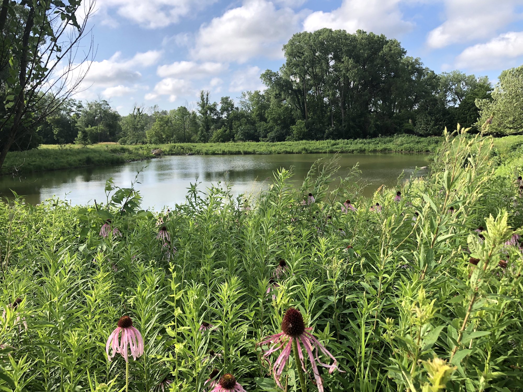 Above: Coneflowers on the banks of the retaining pond on July 11, 2019 (69°).