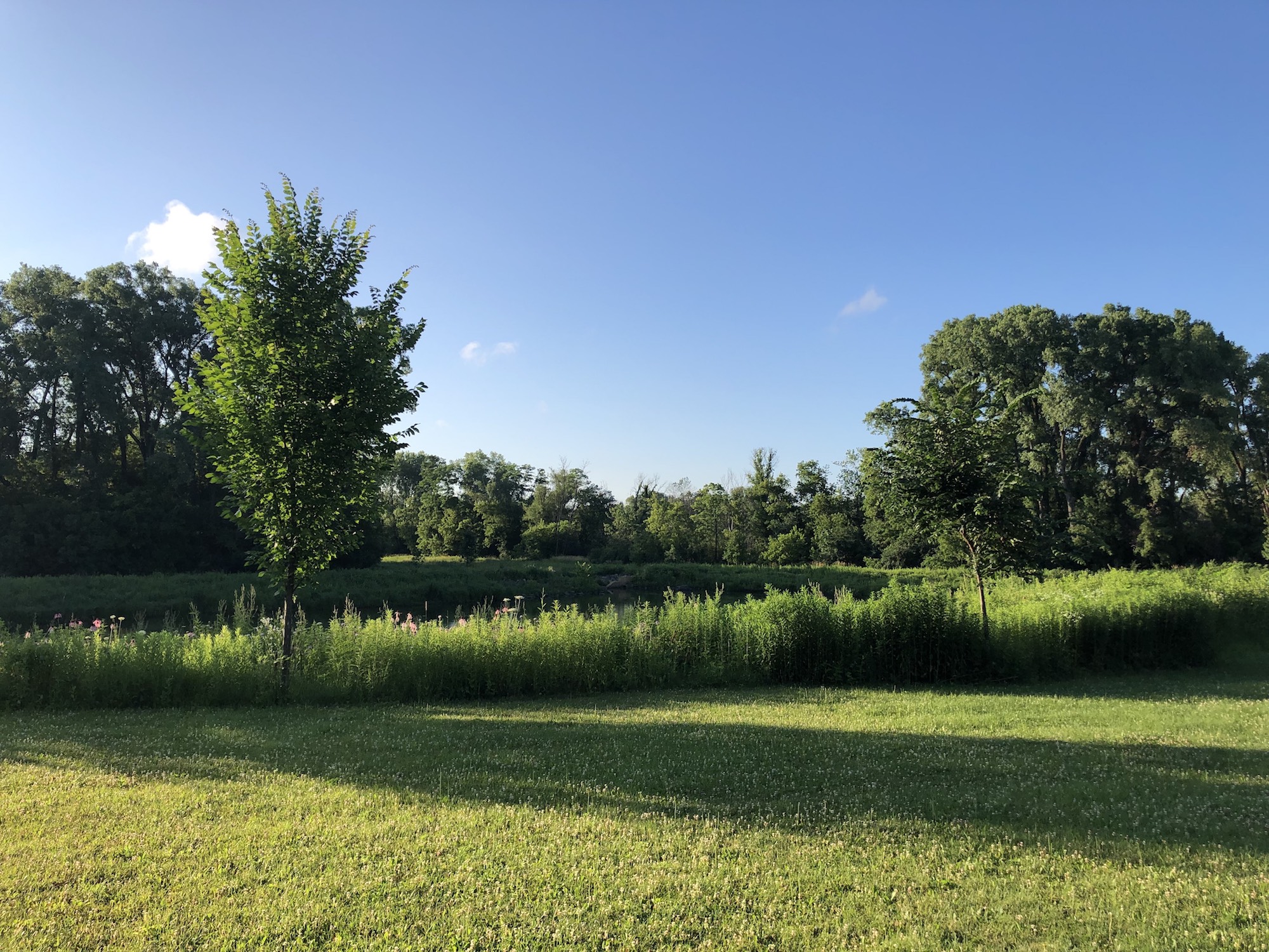 Above: Retaining pond on corner of Nakoma Road and Manitou Way on July 11, 2019 (69°). Narrow-leaved purple coneflower in foreground.