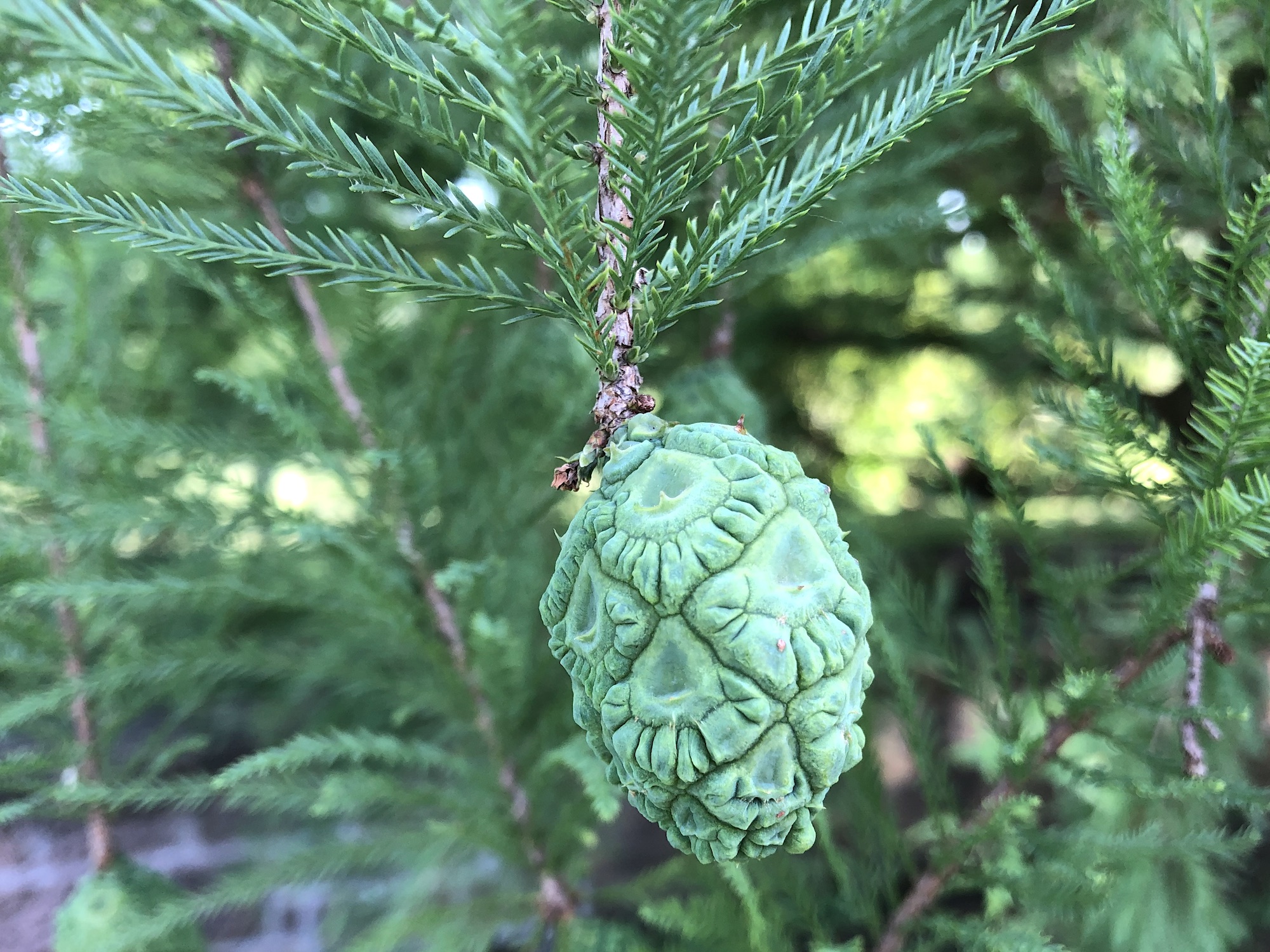 Below: Immature Bald Cypress pine cone along CCC stone wall in UW Arboretum's Viburnum Garden off of Manitou Way.