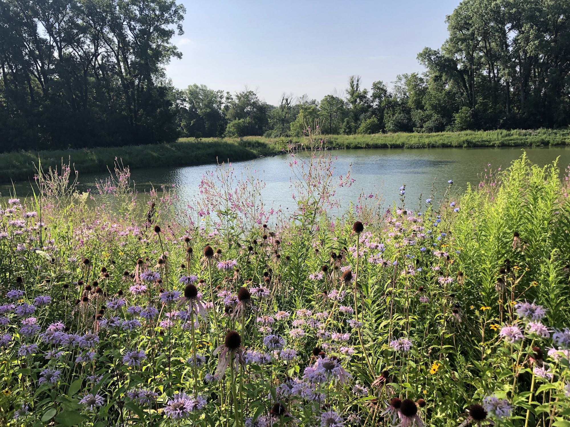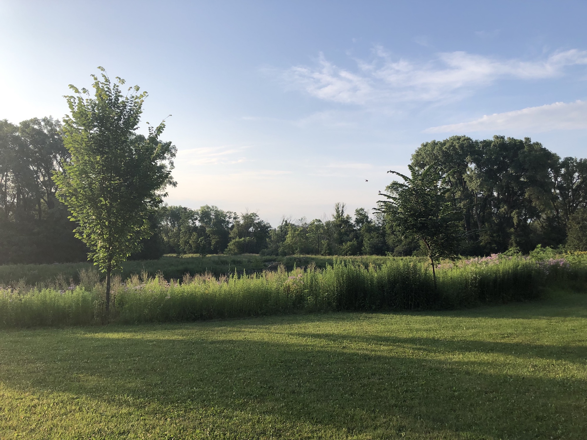 Above: Retaining pond on corner of Nakoma Road and Manitou Way on July 27, 2019 (73°). Bergamot is now the dominant flower in the foreground.