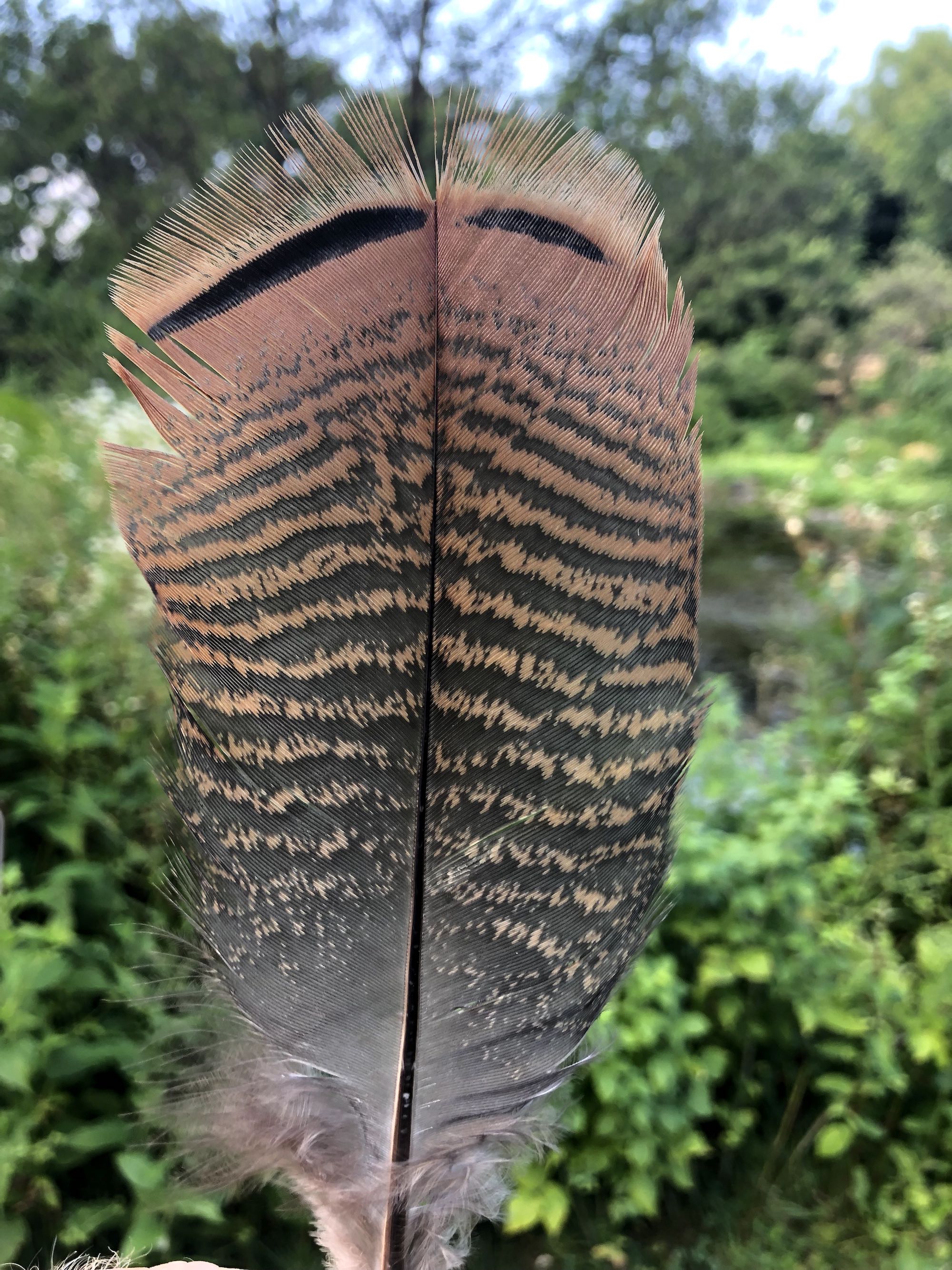 Above: Wild turkey feather found by Duck Pond on July 27, 2019 (73°).