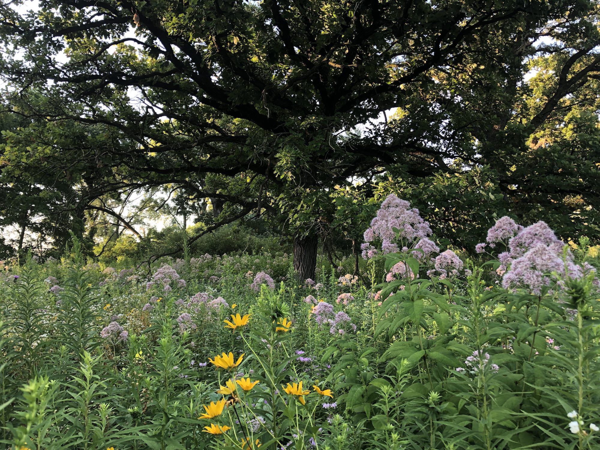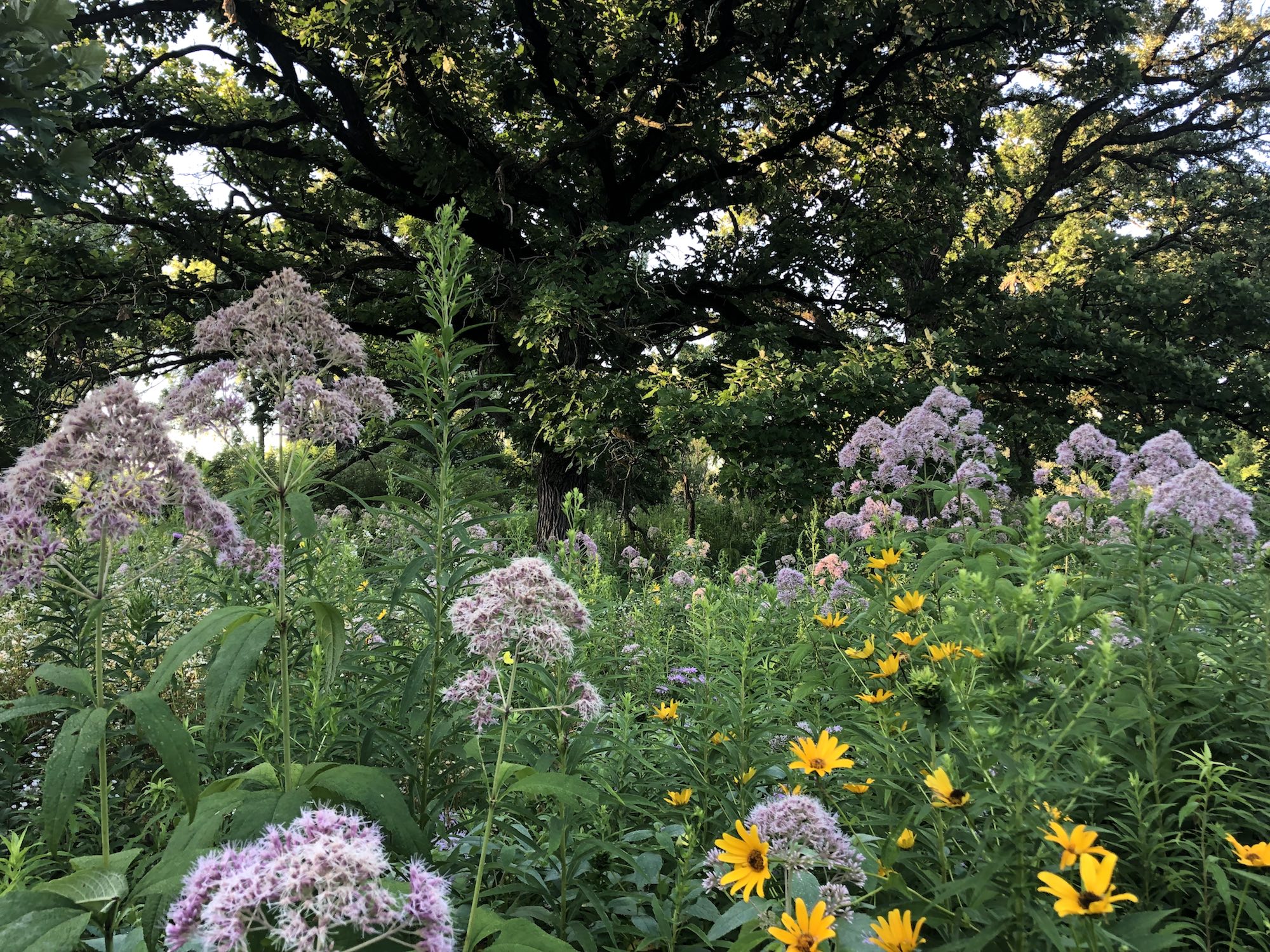 Above: Oak Savanna on July 31, 2019 (60°). False Sunflowers and Joe Pye Weed in foreground.
