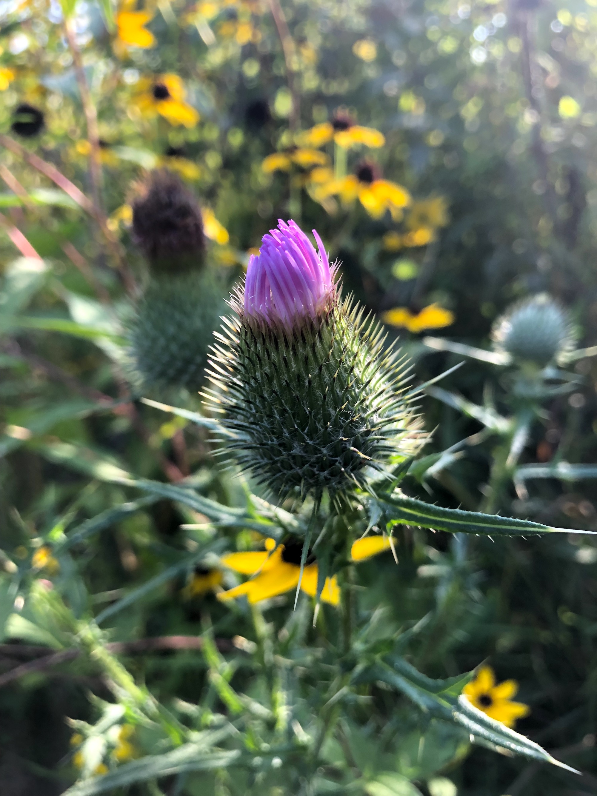 Above: Bull Thistle on bank of Retaining pond on corner of Nakoma Road and Manitou Way on September 2, 2019 (65°). Note: Yellow tips of long spikes on flower head.