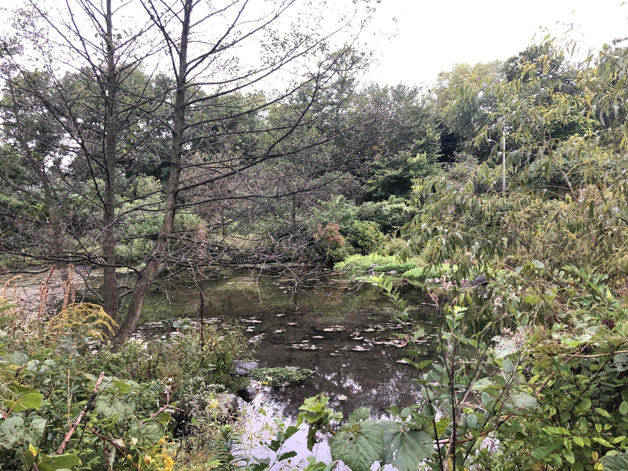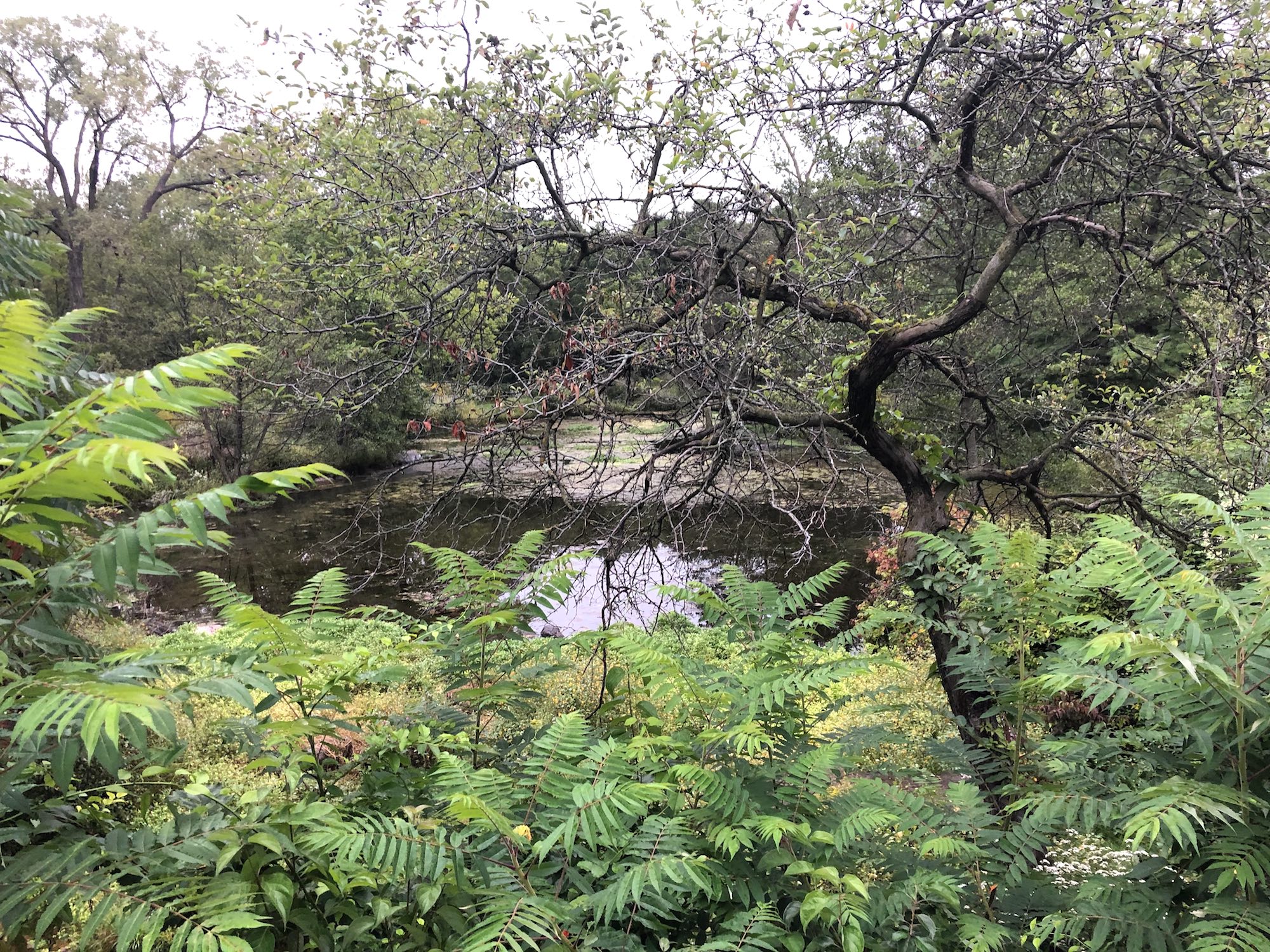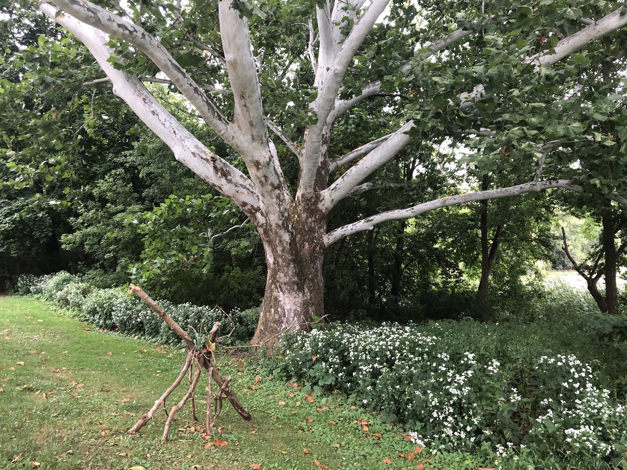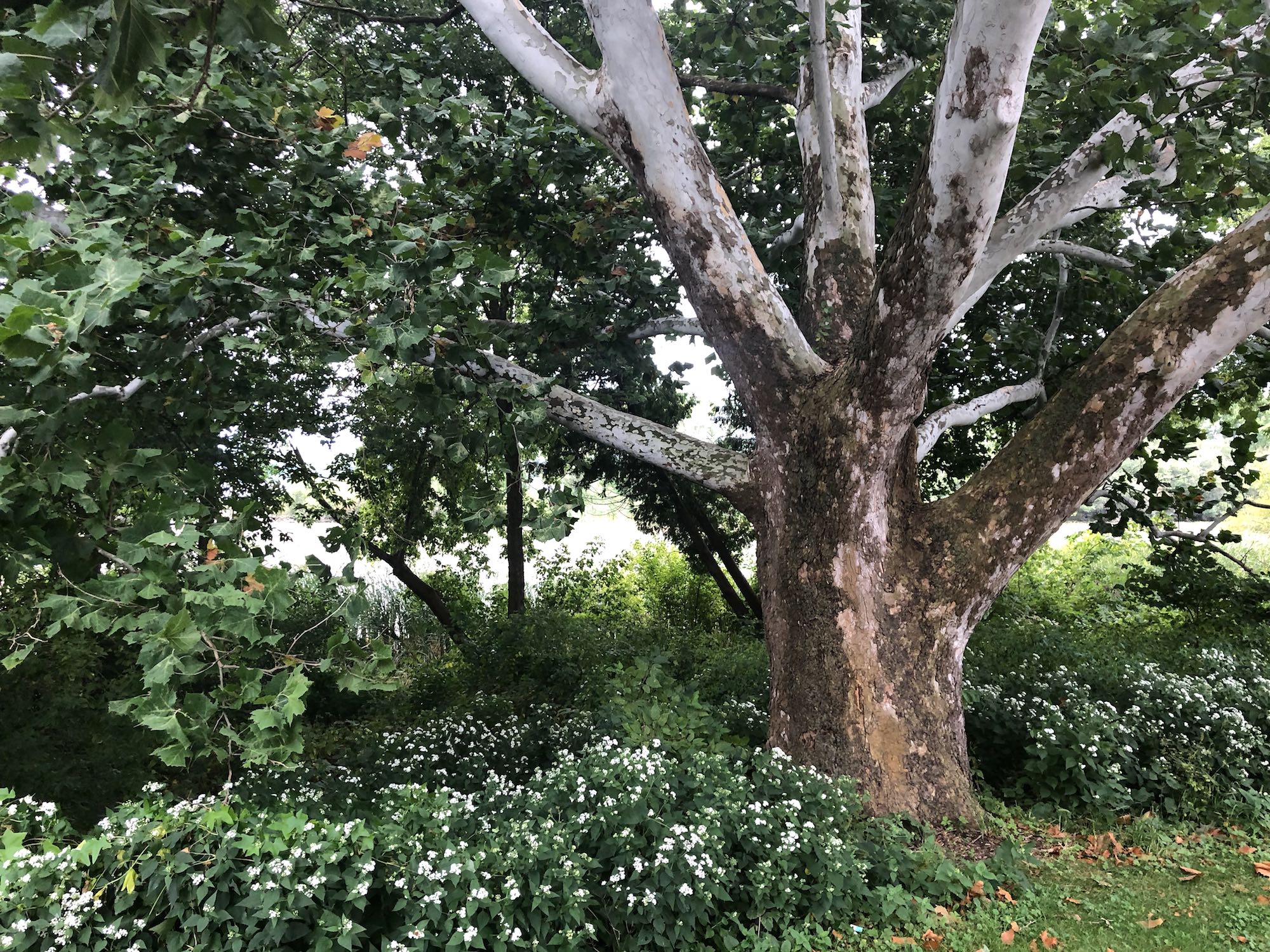 Above: Looking at Ho-Nee-Um Pond from Arbor Drive. NOTE: White Snakeroot surrounding Sycamore tree.