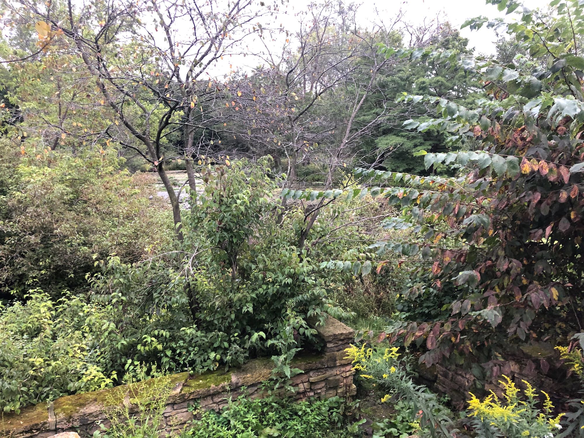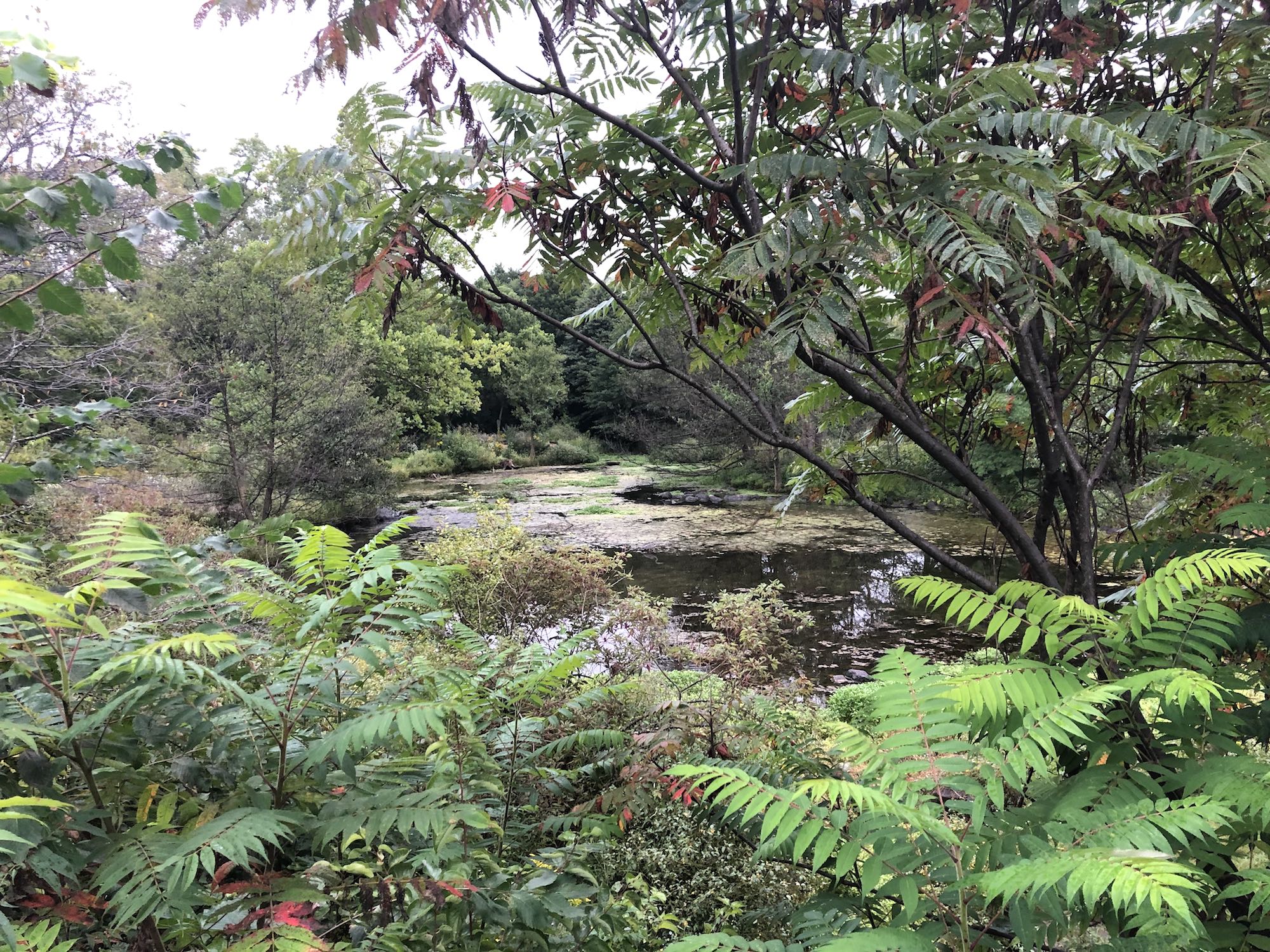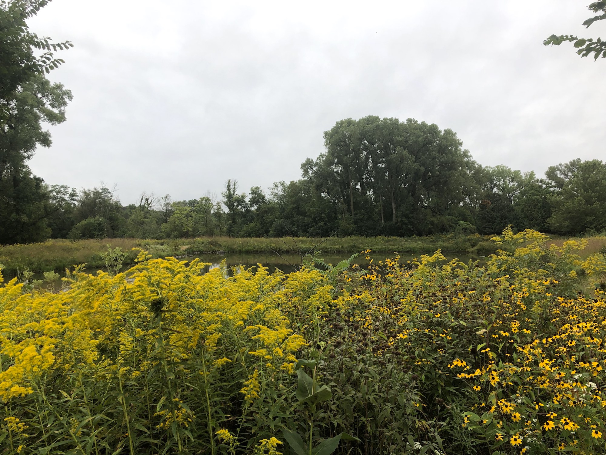 Above: Looking at Ho-Nee-Um Pond from Arbor Drive. NOTE: White Snakeroot surrounding Sycamore tree.