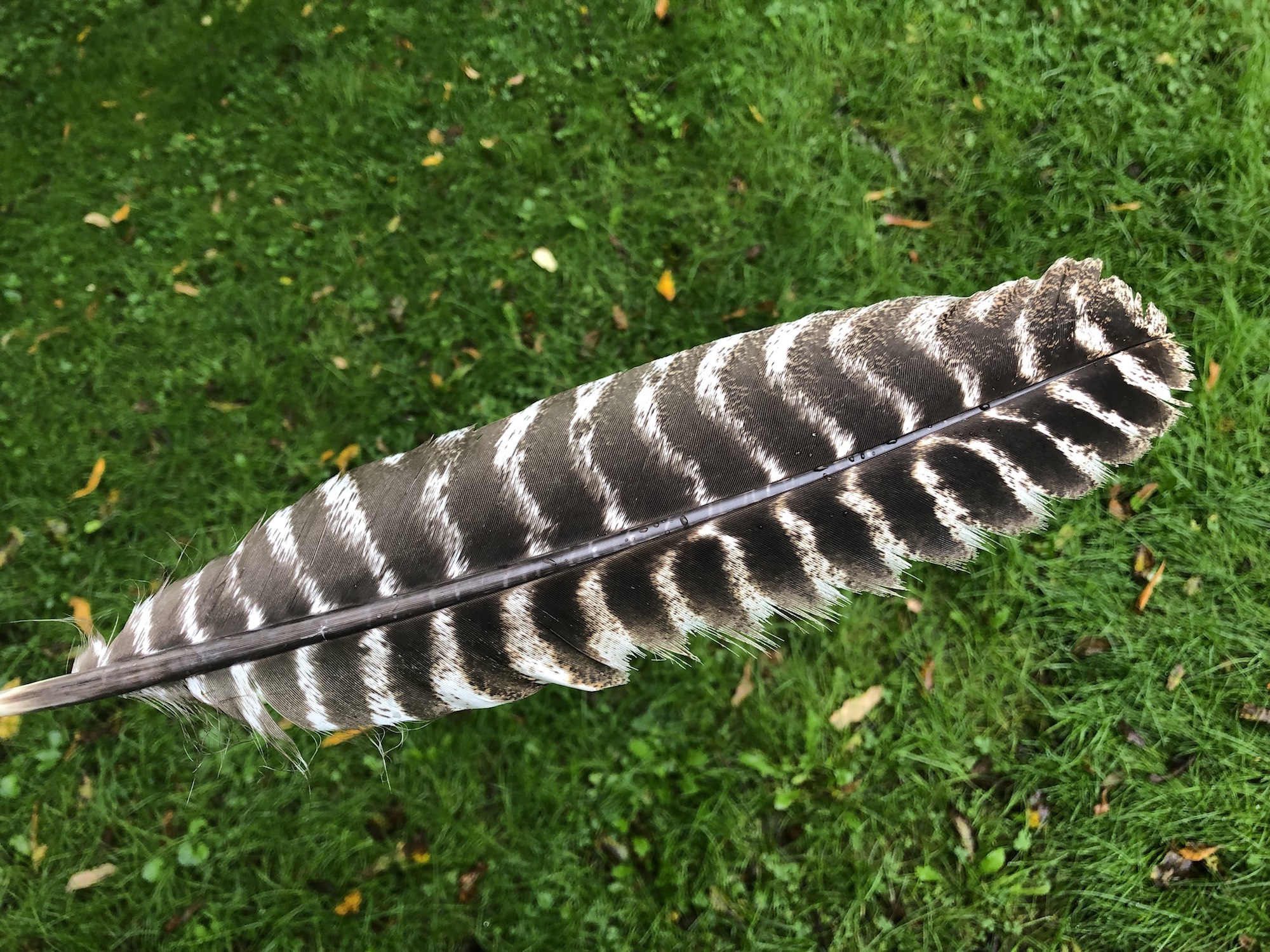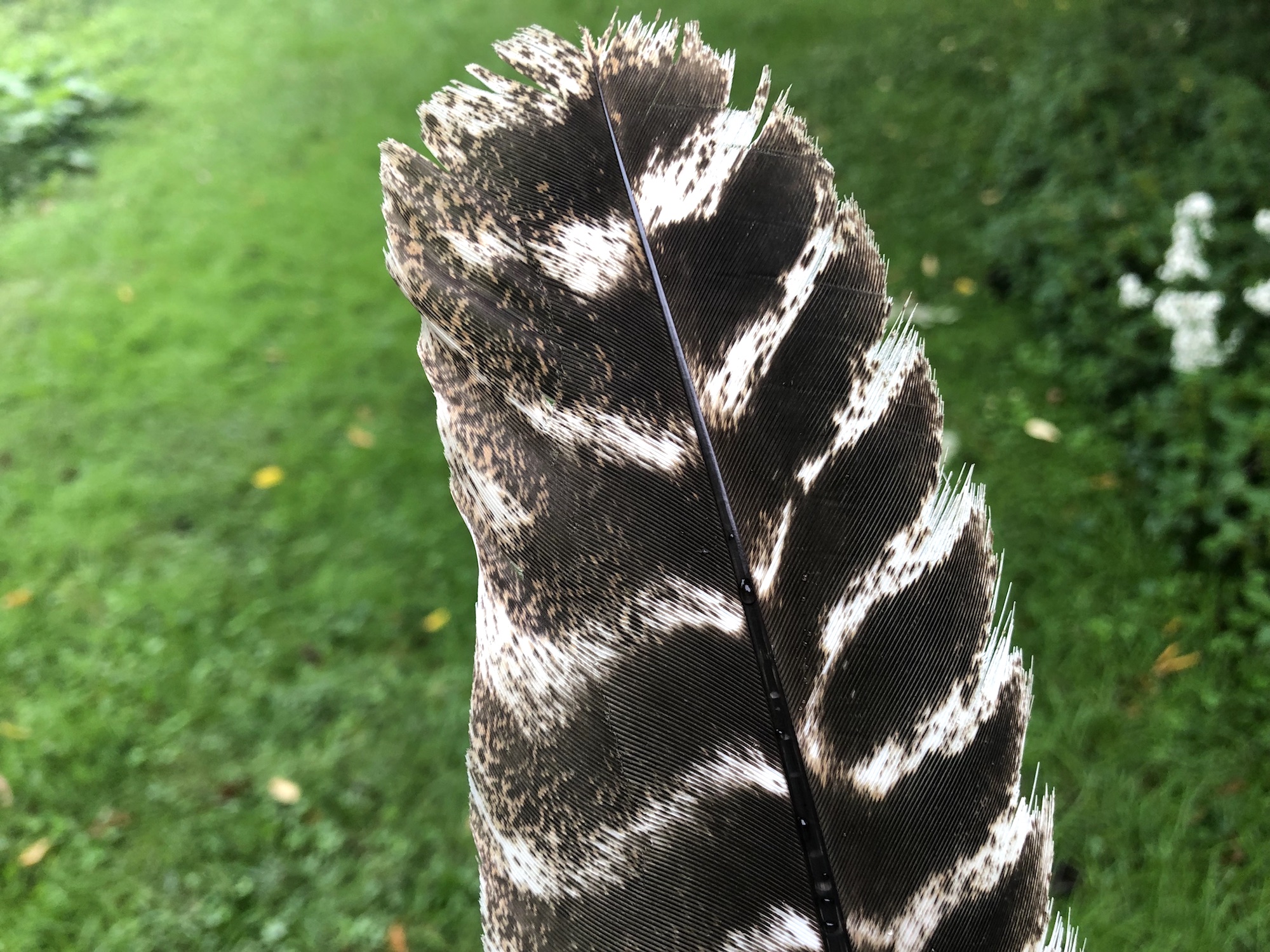 Above: Wild Turkey feather by Stevens Pond on September 16, 2019 (63°).