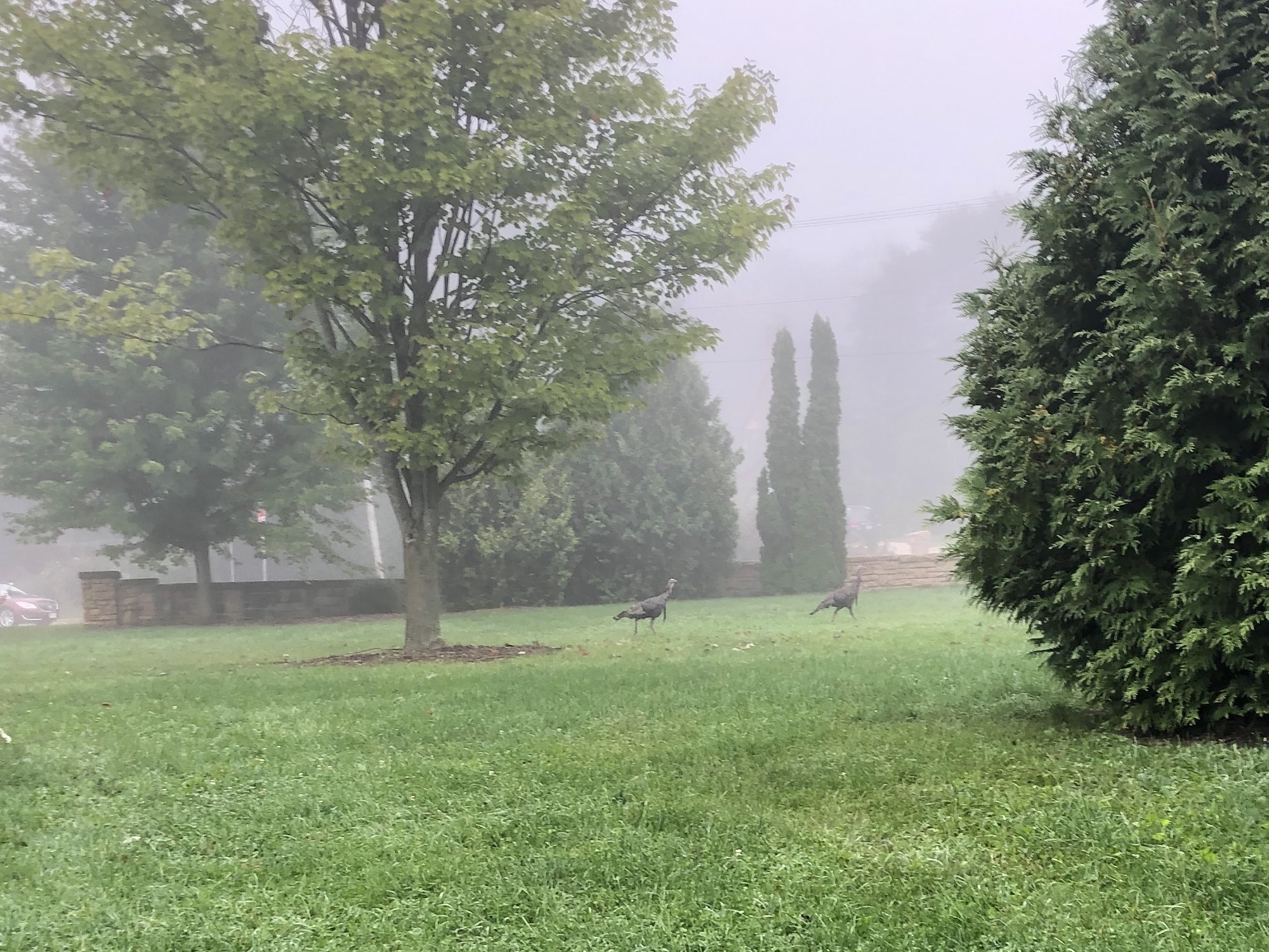 Above: Two Wild Turkeys walking around in E. Ray Stevens Pond and Aquatic Gardens on September 16, 2019 (63°).