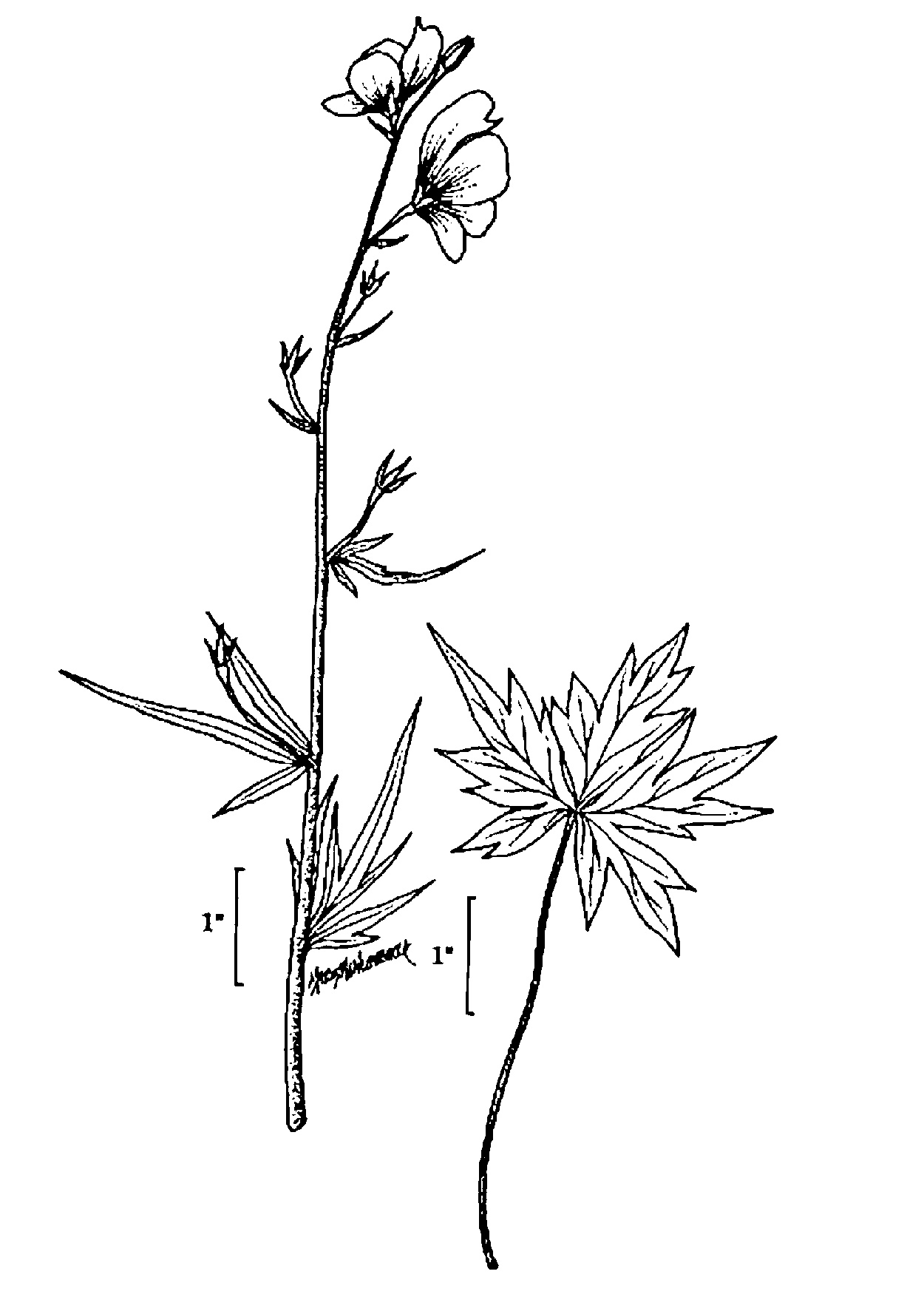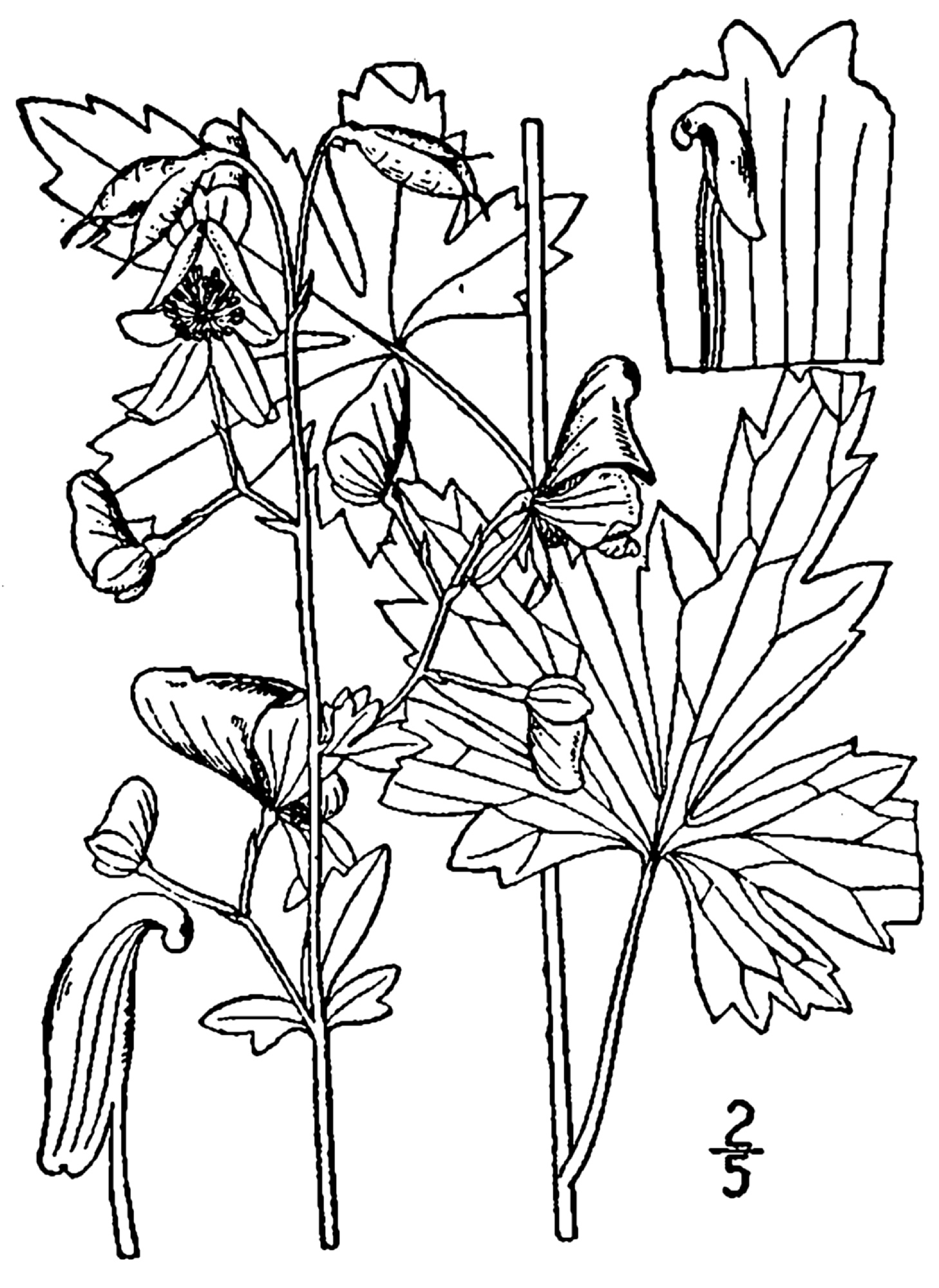 Above: Columbian Monkshood (Aconitum columbianum) line drawing from USDA NRCS, Wetland flora: Field office illustrated guide to plant species., USDA NRCS National Wetland Team.