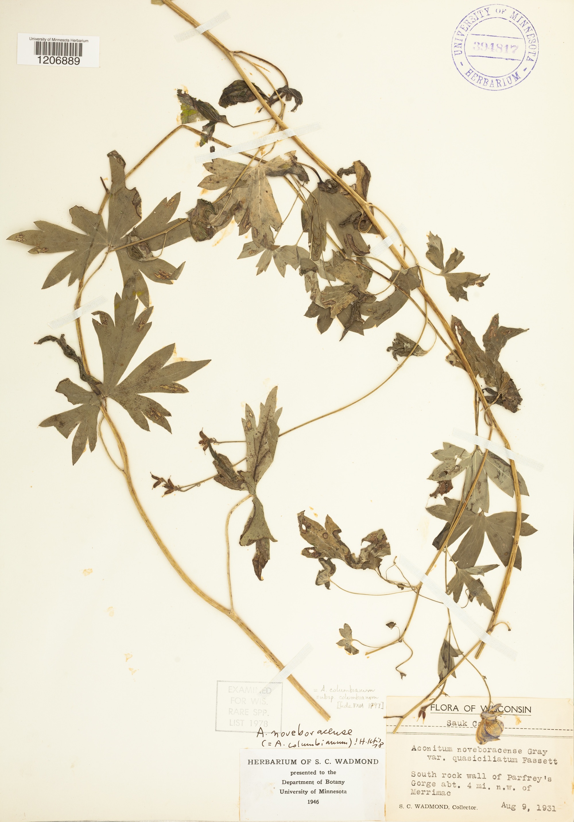 Above: Columbian Monkshood (Aconitum columbianum) specimen collected on south rock wall at Parfrey's Gorge 4 miles northwest of Merrimac, Wisconsin on August 9, 1931.