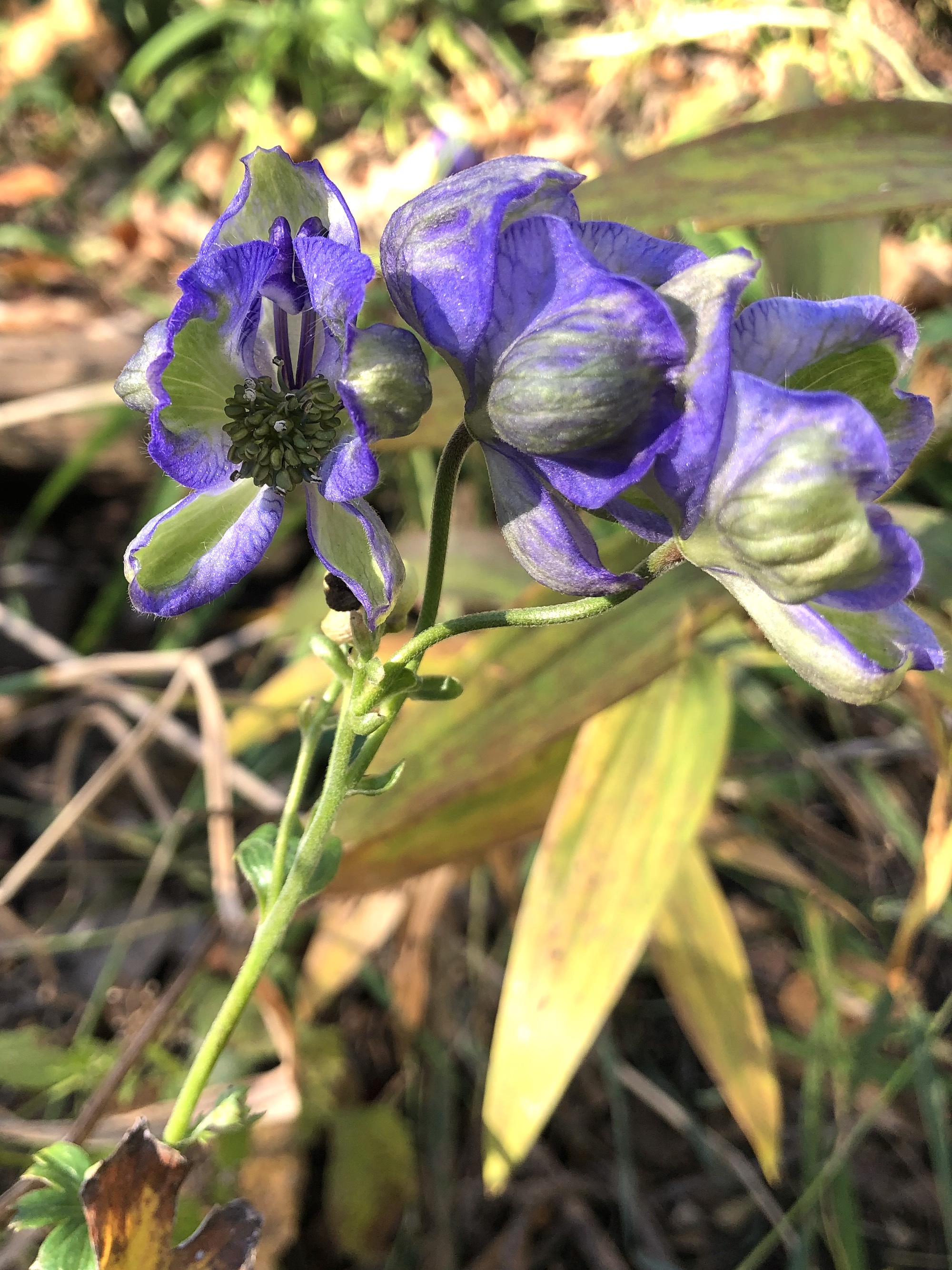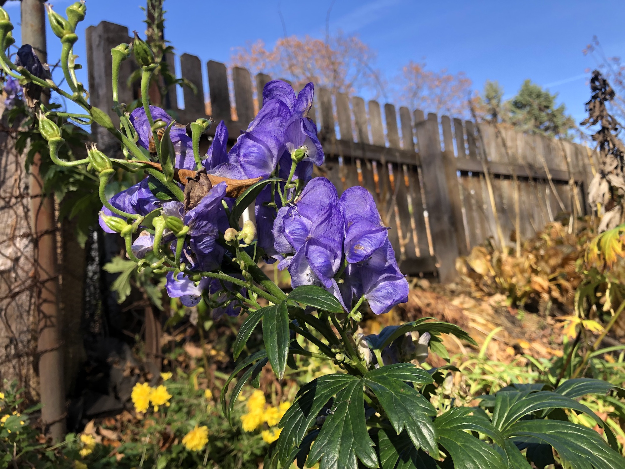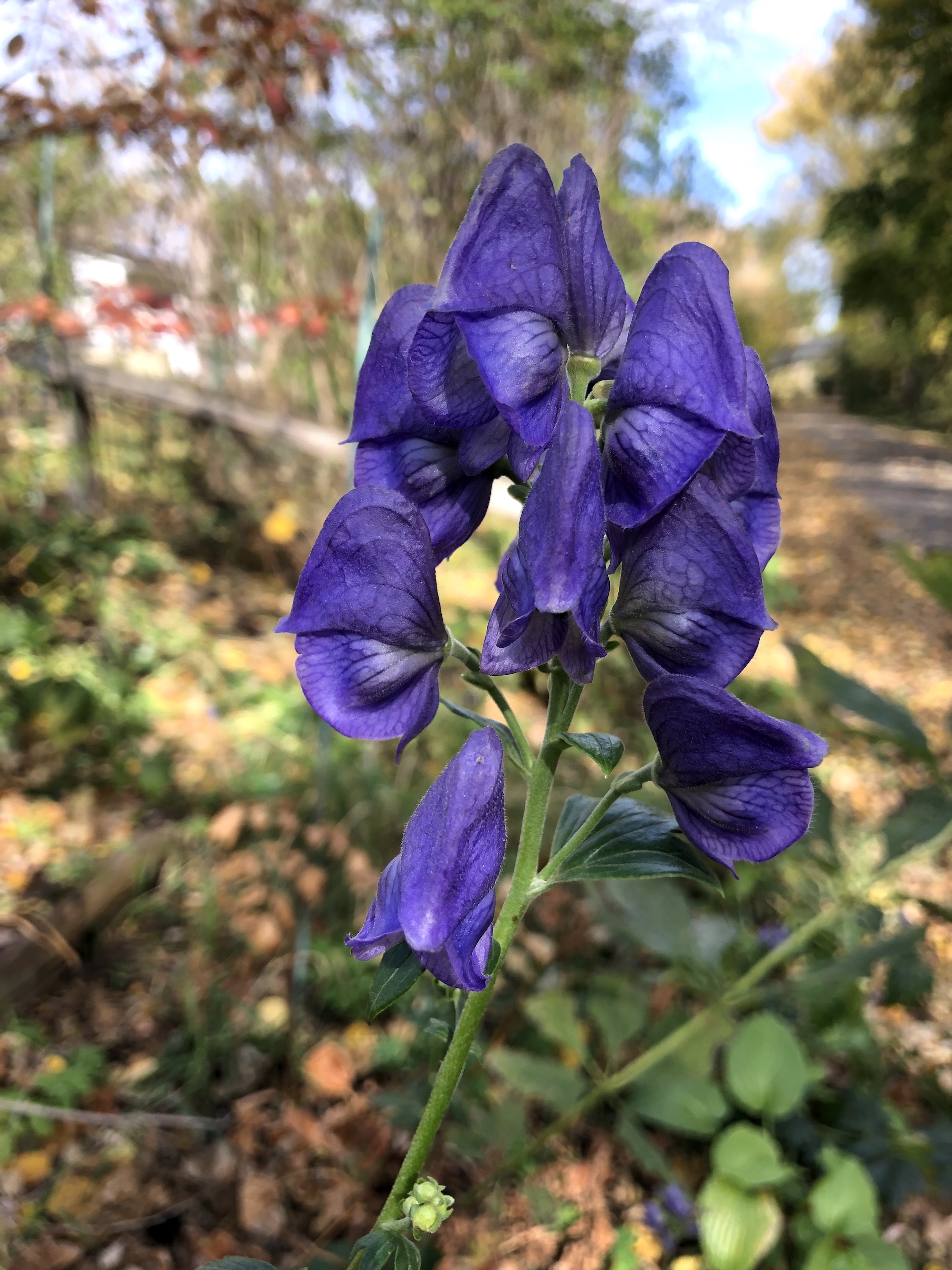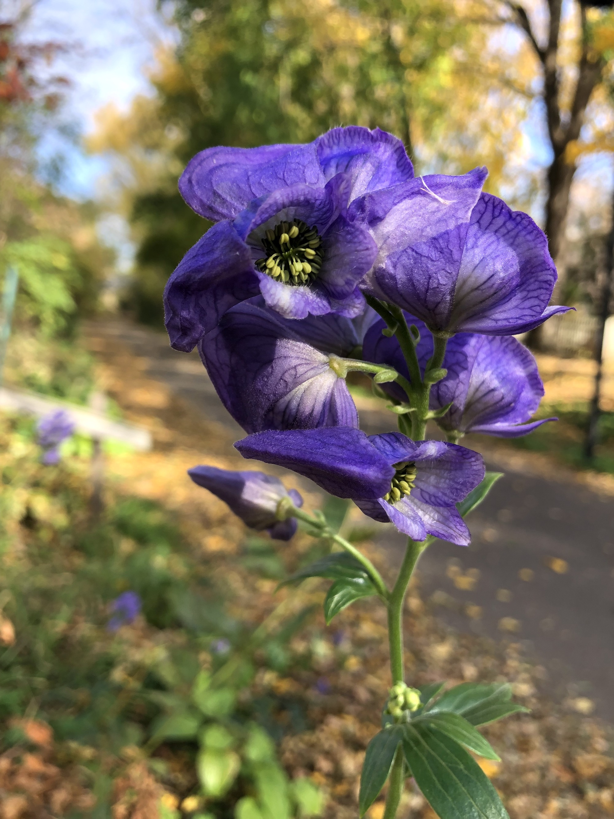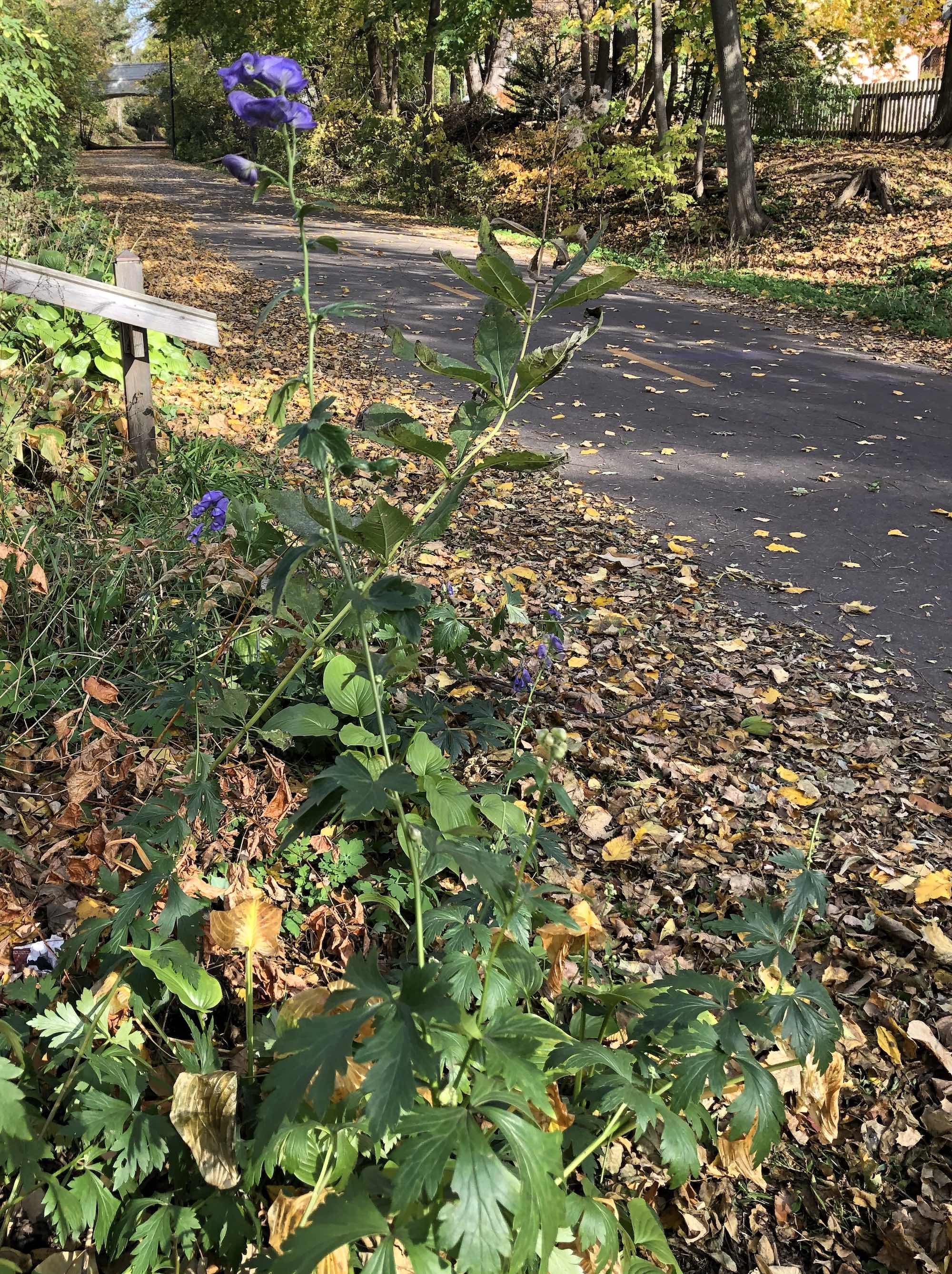 Above: Monkshood on hill off of bike path behind Fox Avenue in Madison, Wisconsin (10/28/22). From a smaller 2' tall plant.