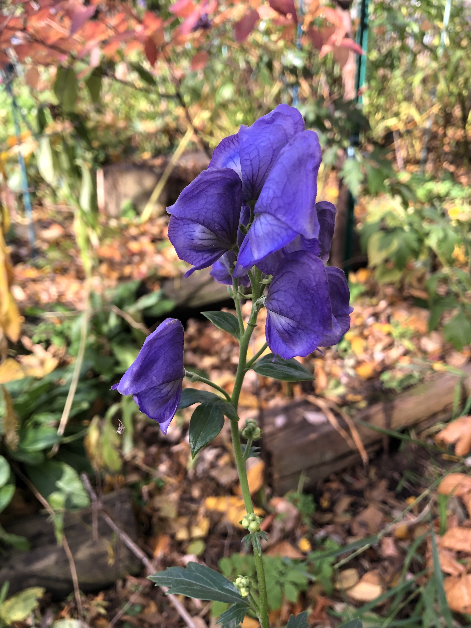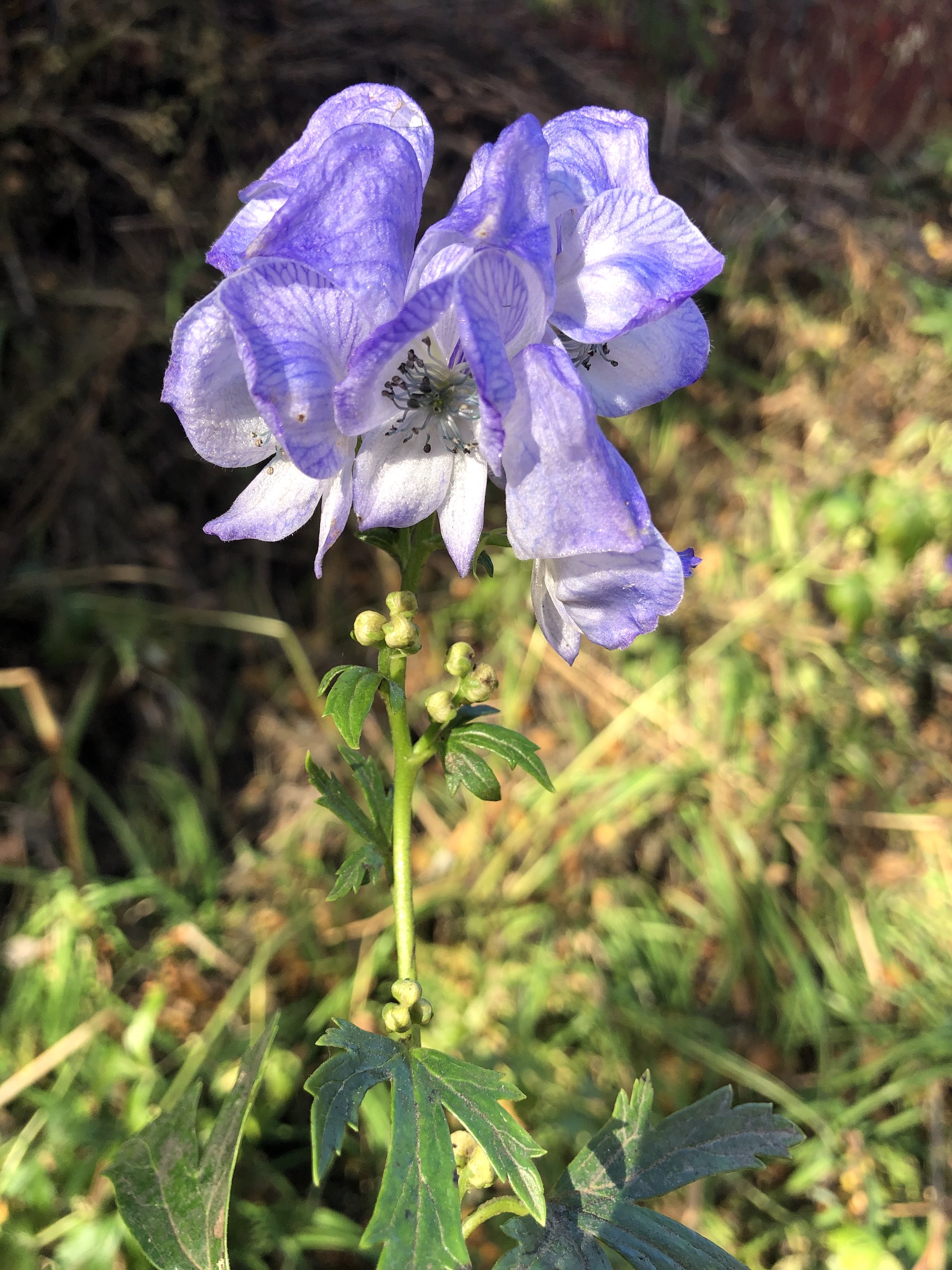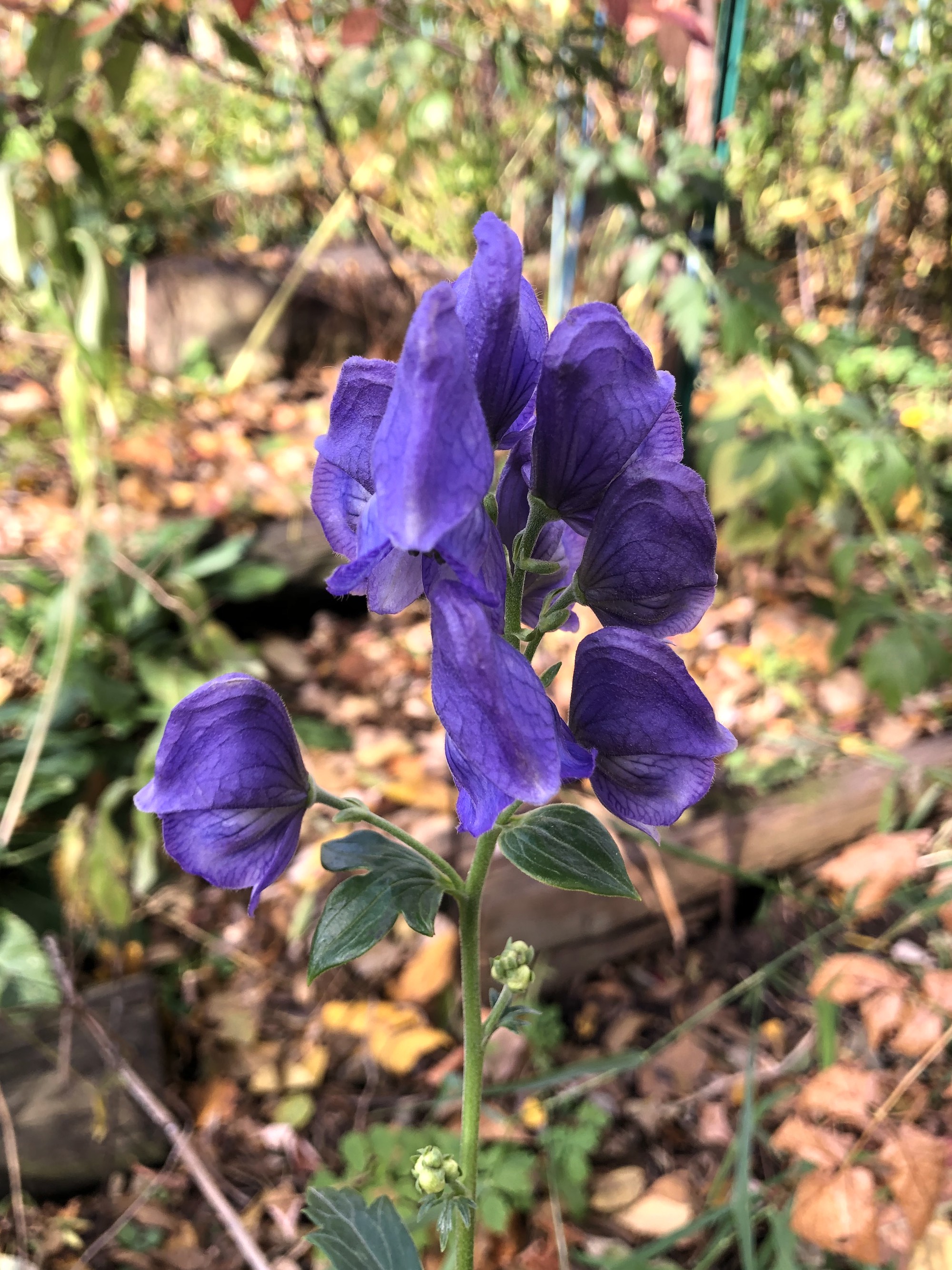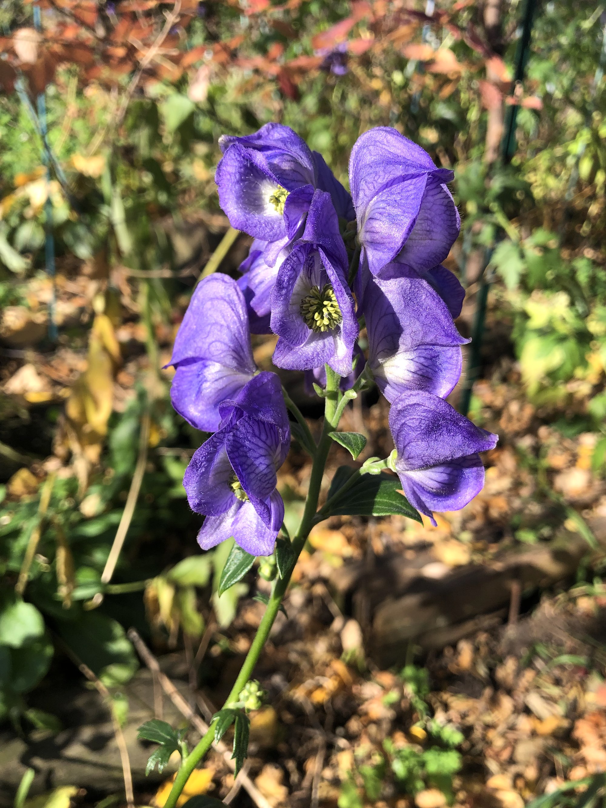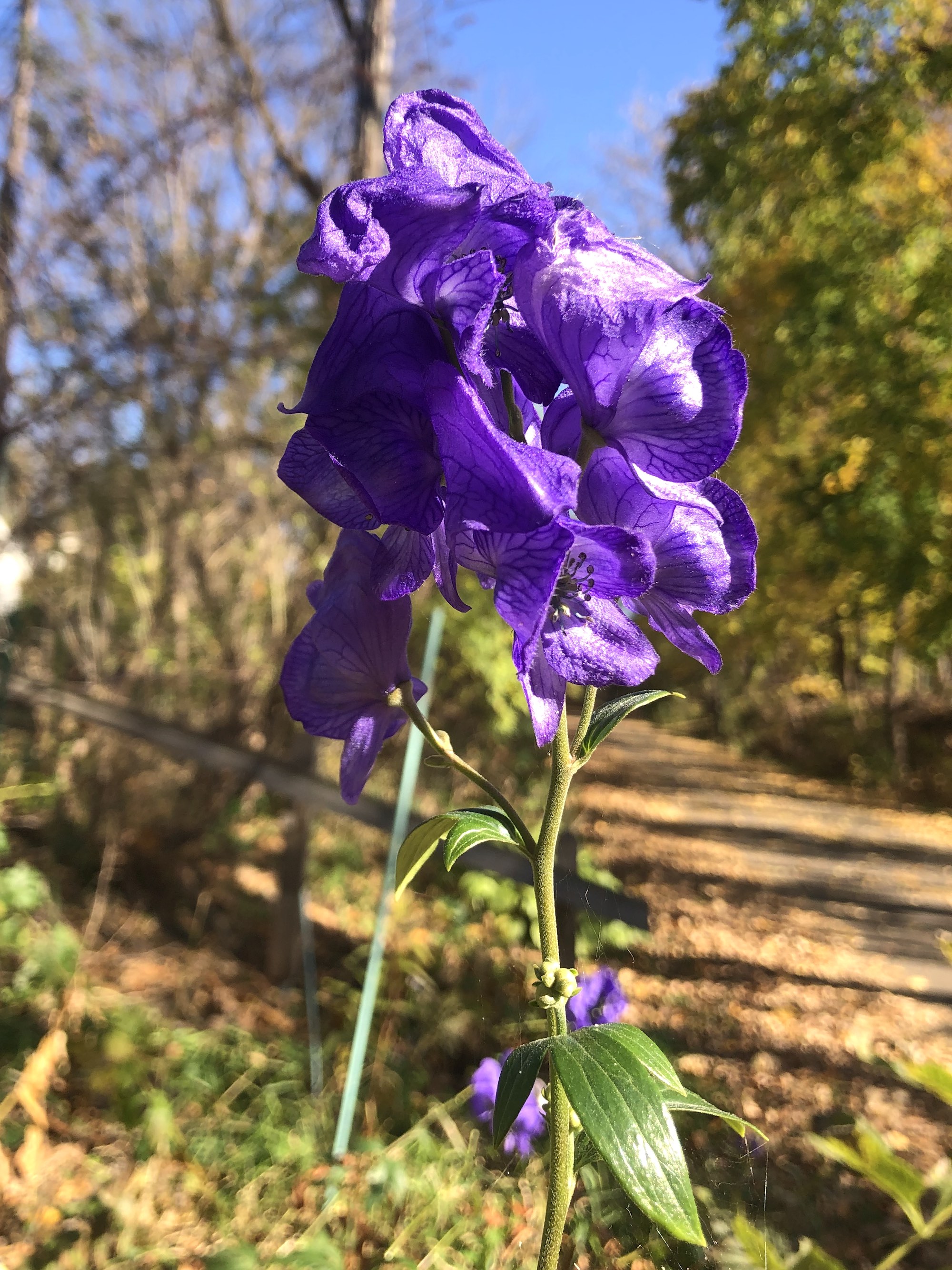 Above: Monkshood on hill off of bike path behind Fox Avenue in Madison, Wisconsin (10/28/22). From a smaller 2' tall plant.