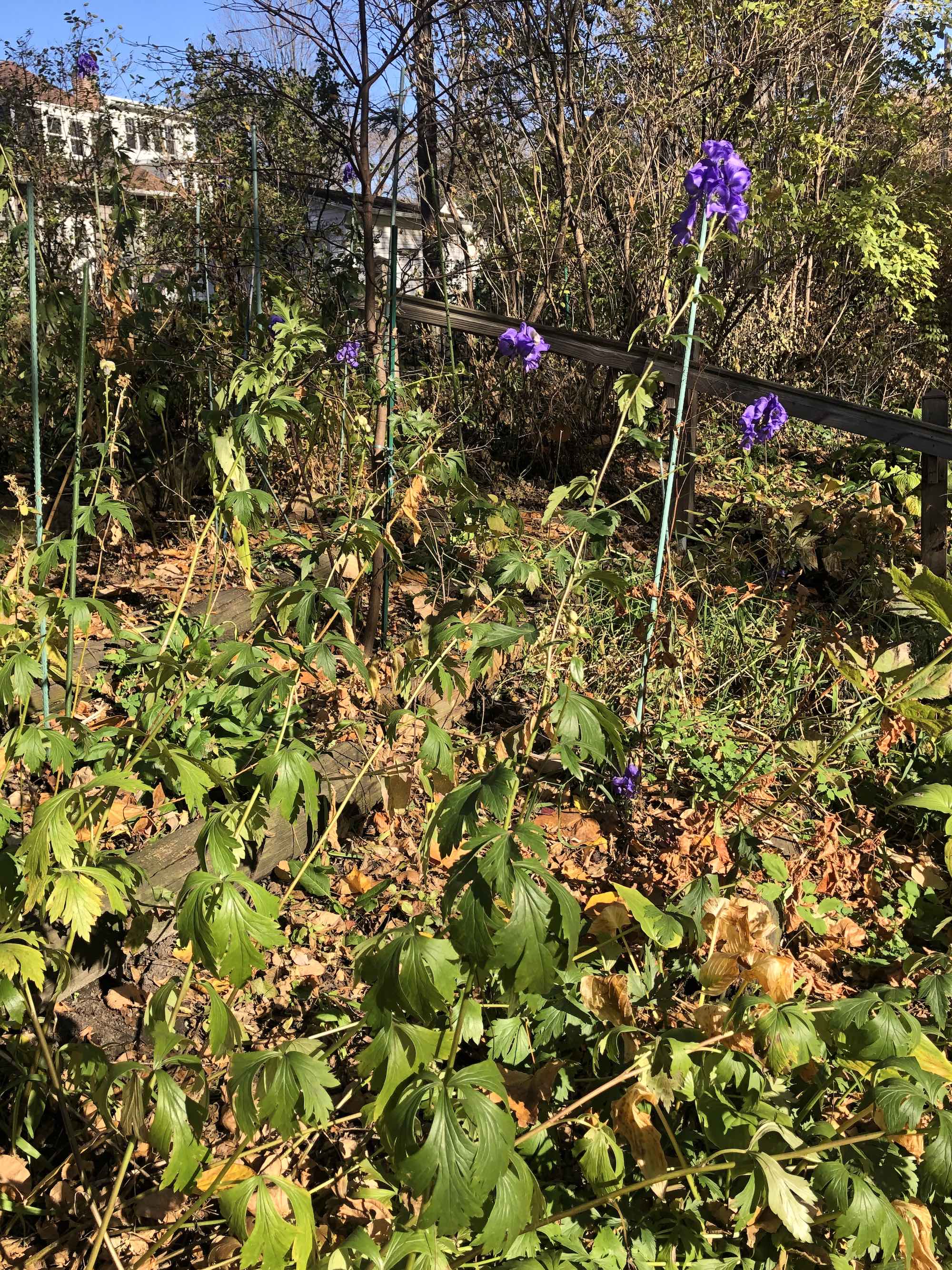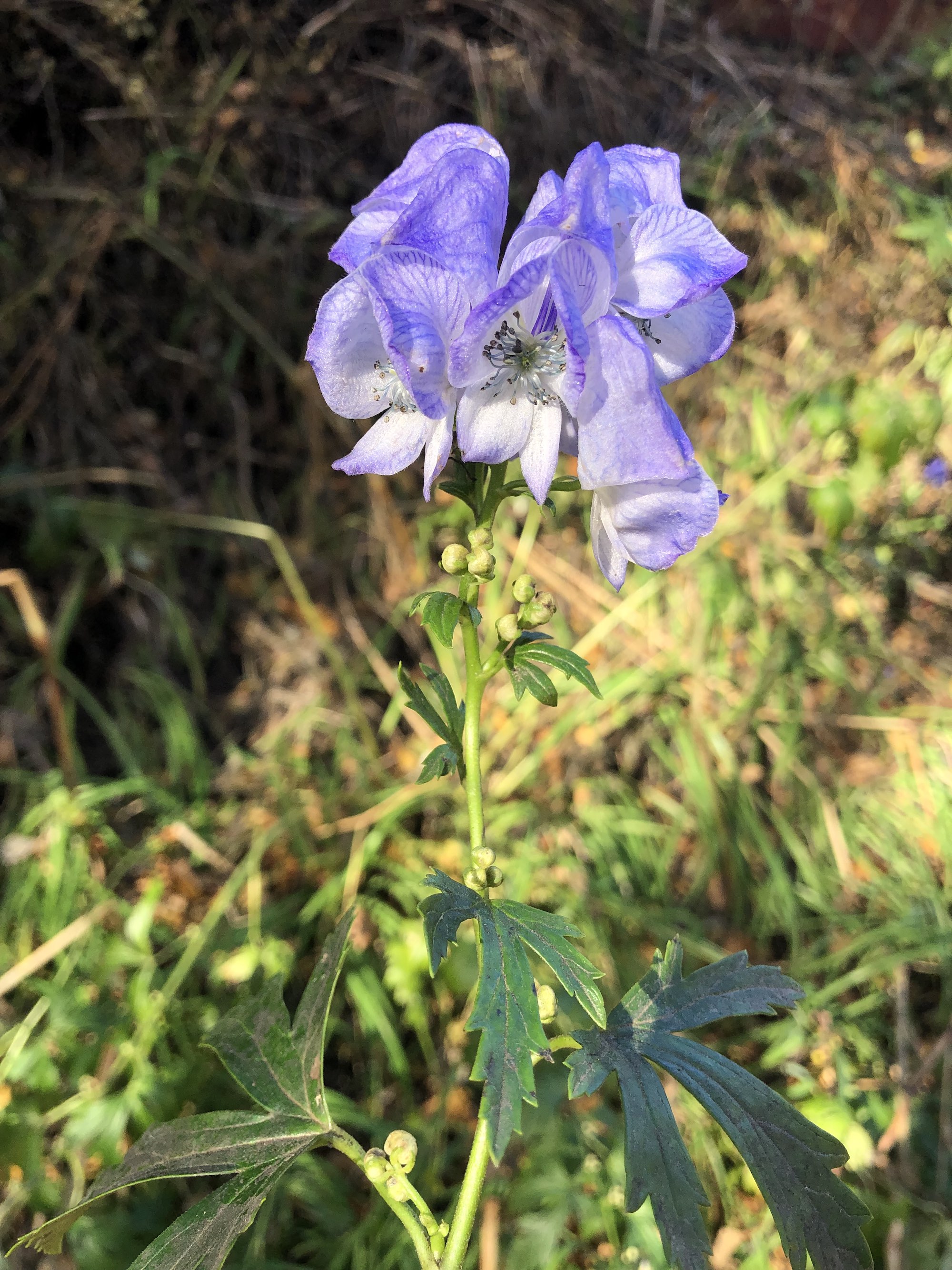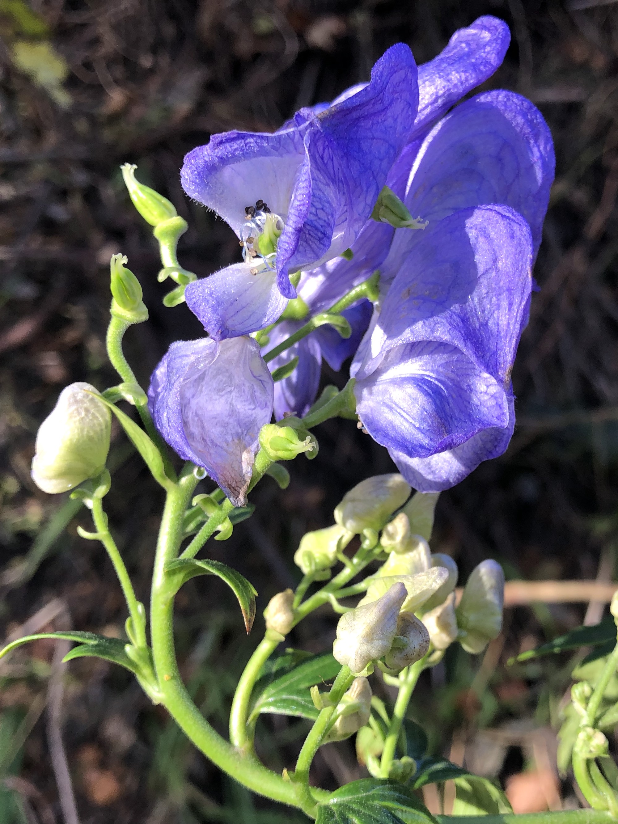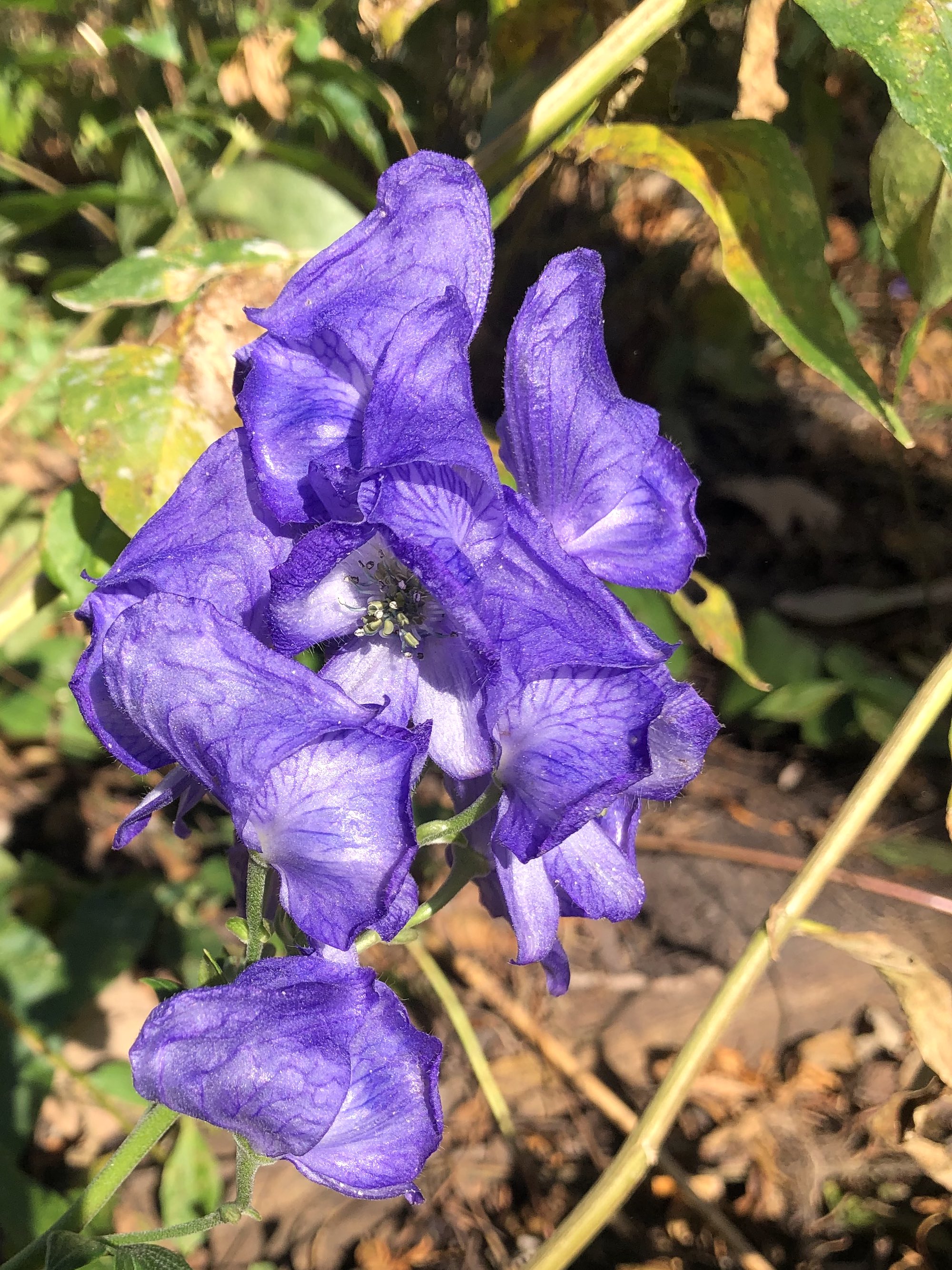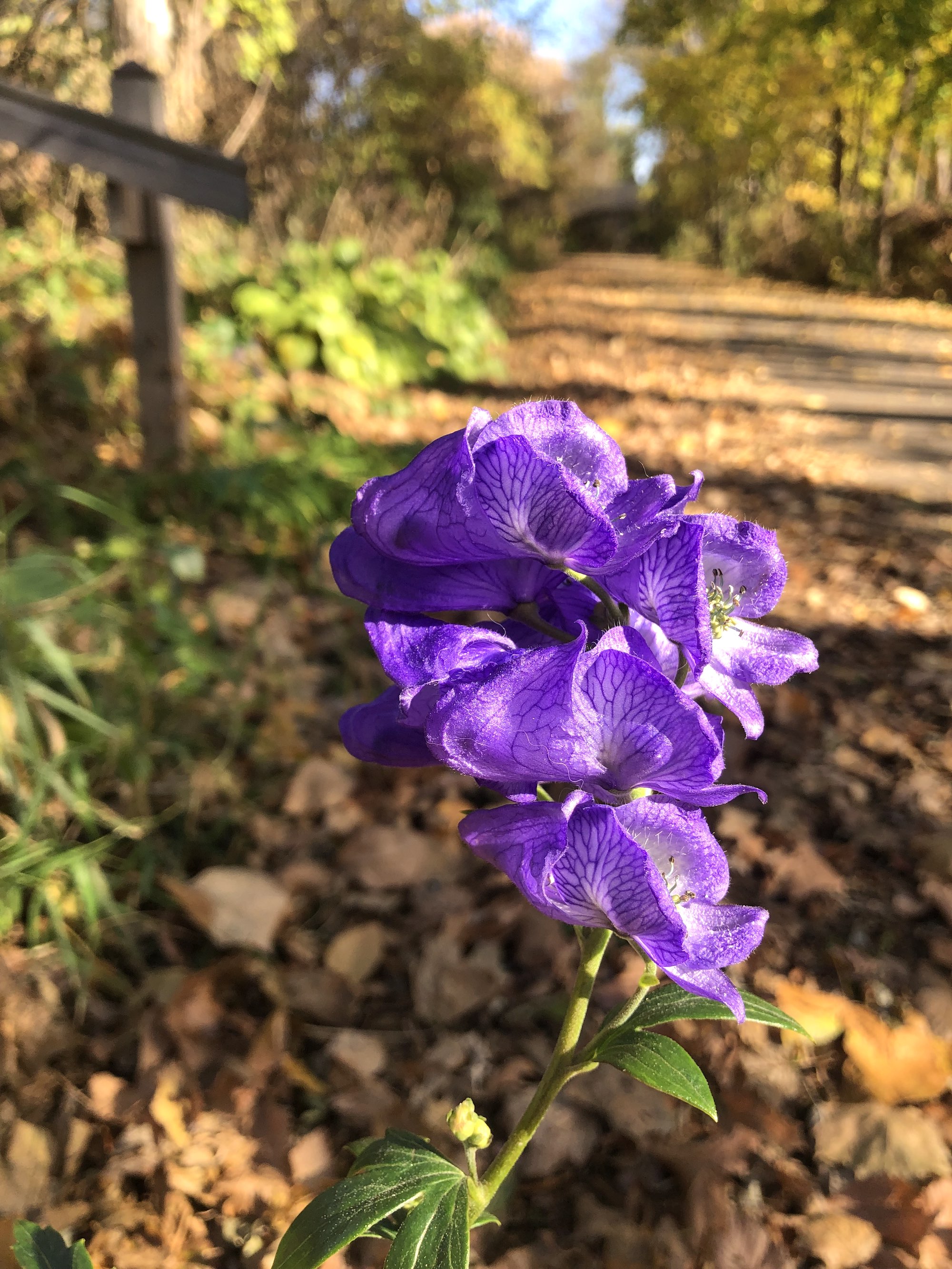 Above: Monkshood on hill off of bike path behind Fox Avenue in Madison, Wisconsin (10/28/22). From a smaller 2' tall plant.
