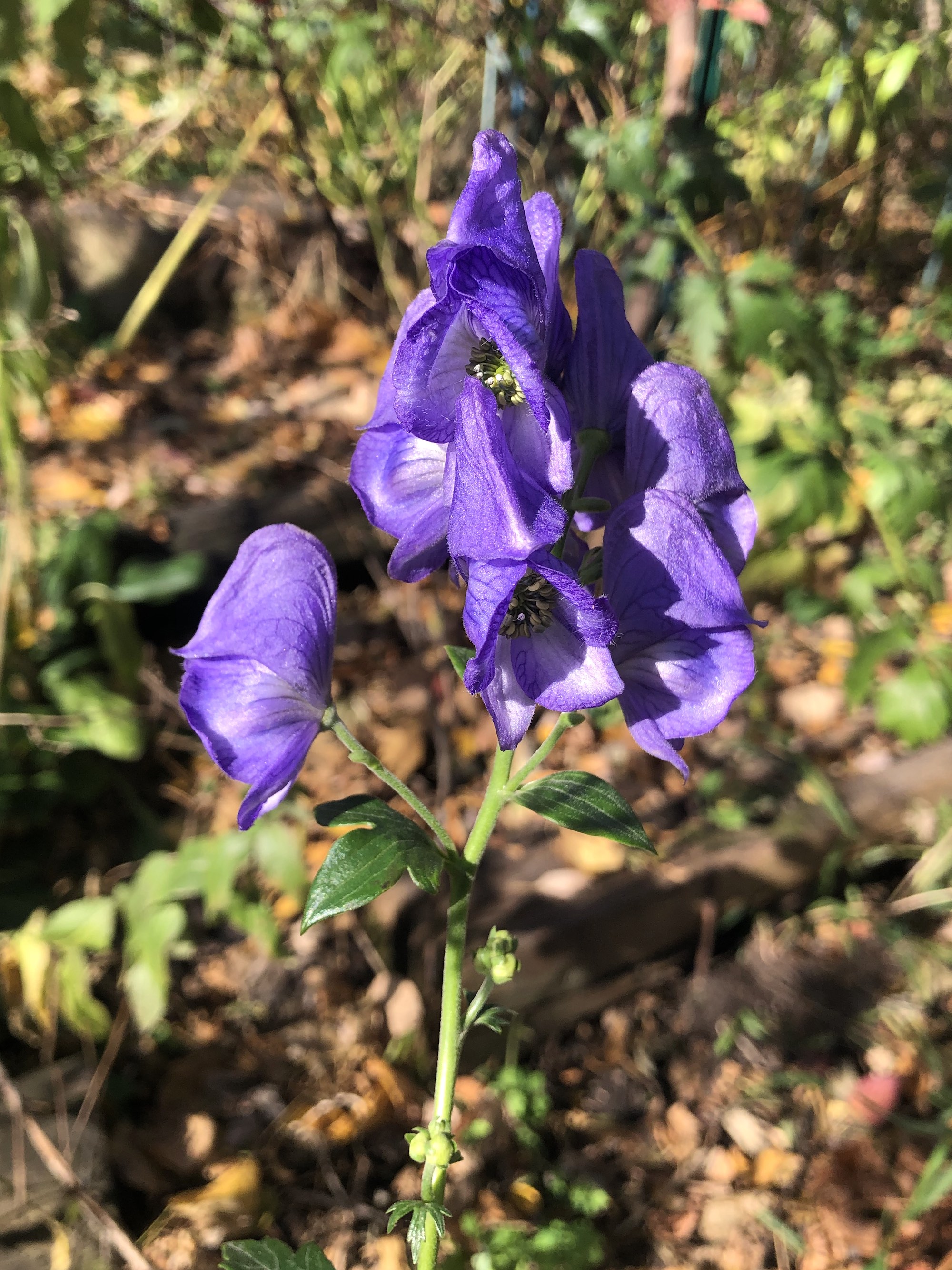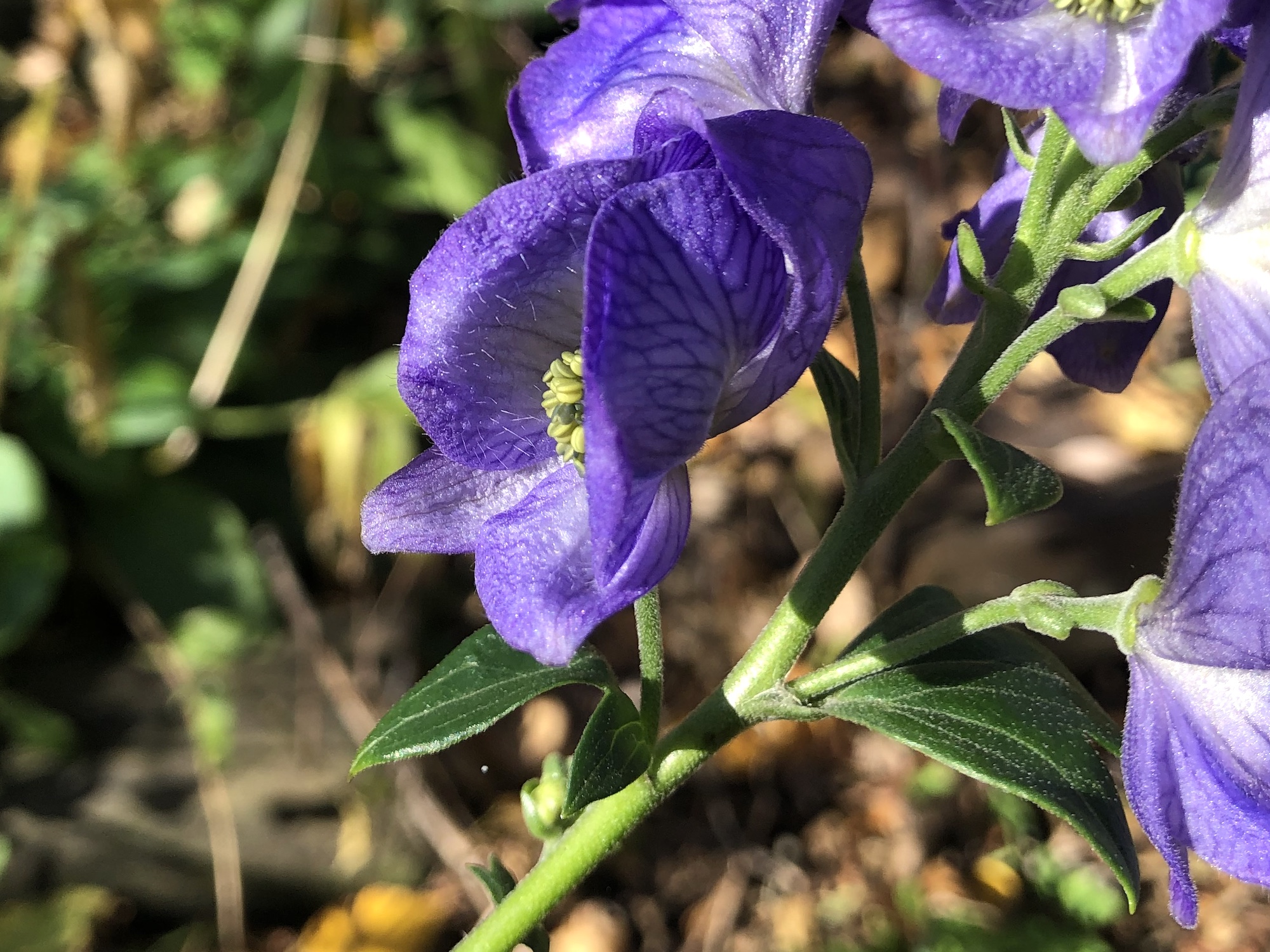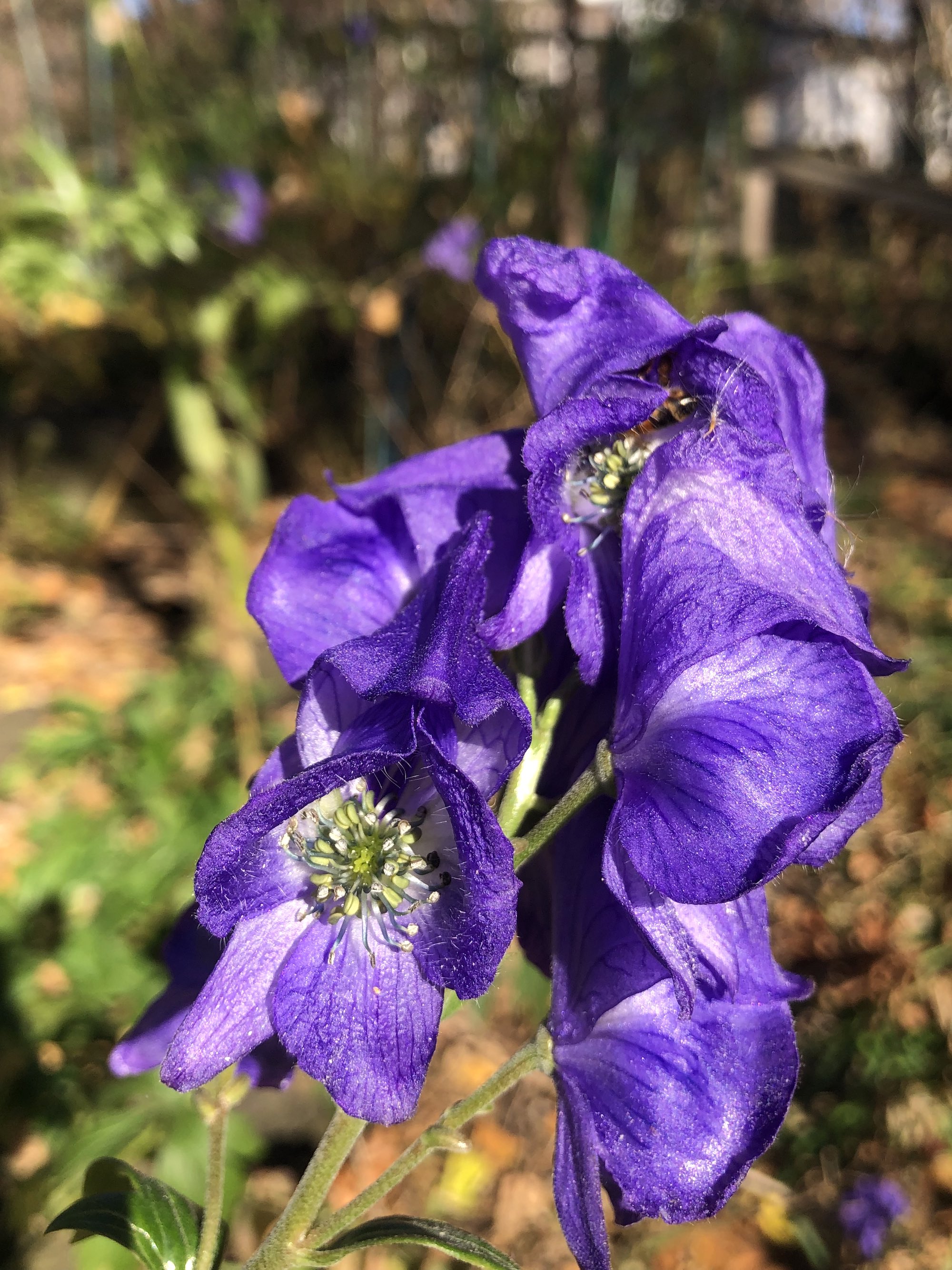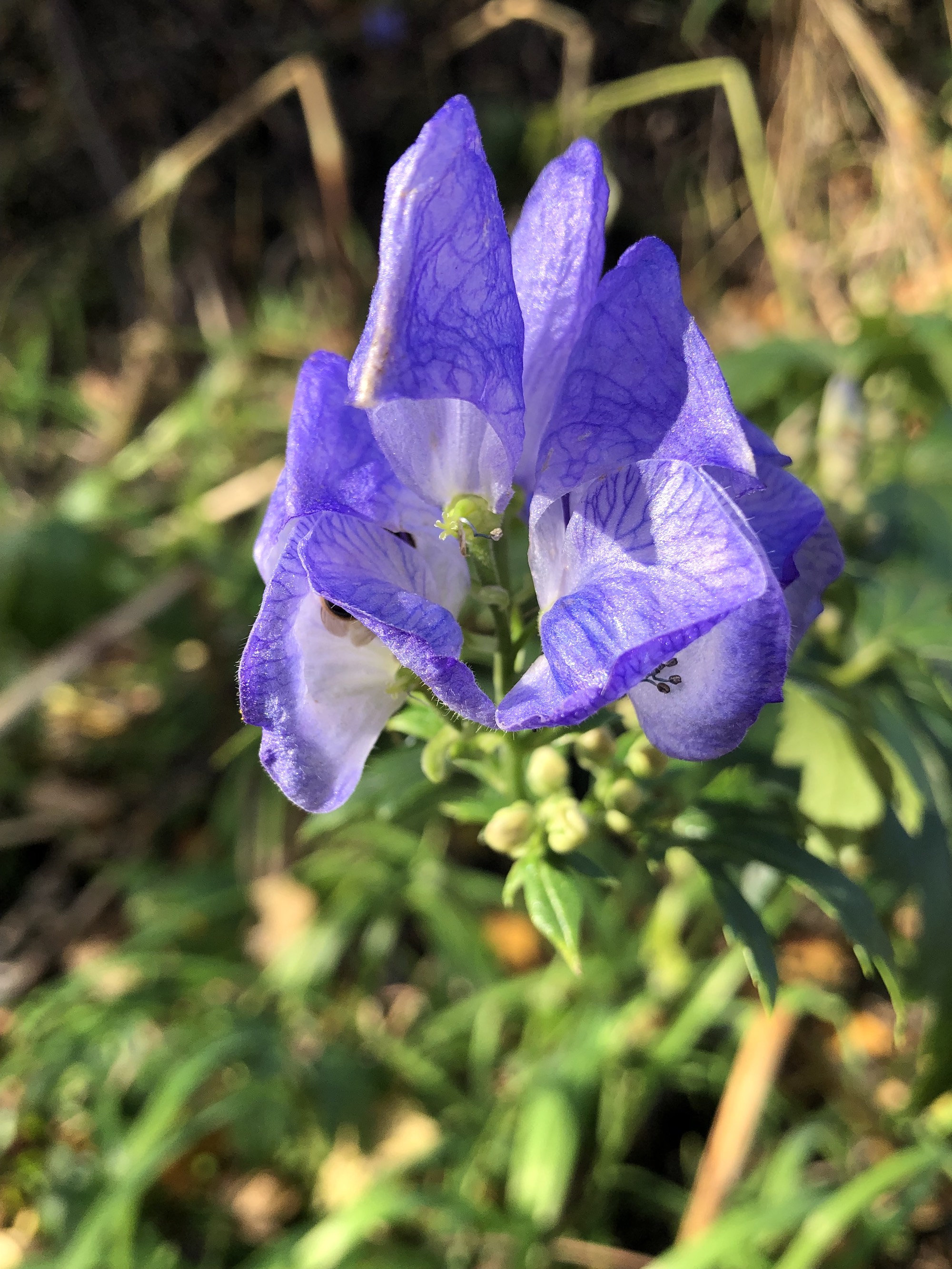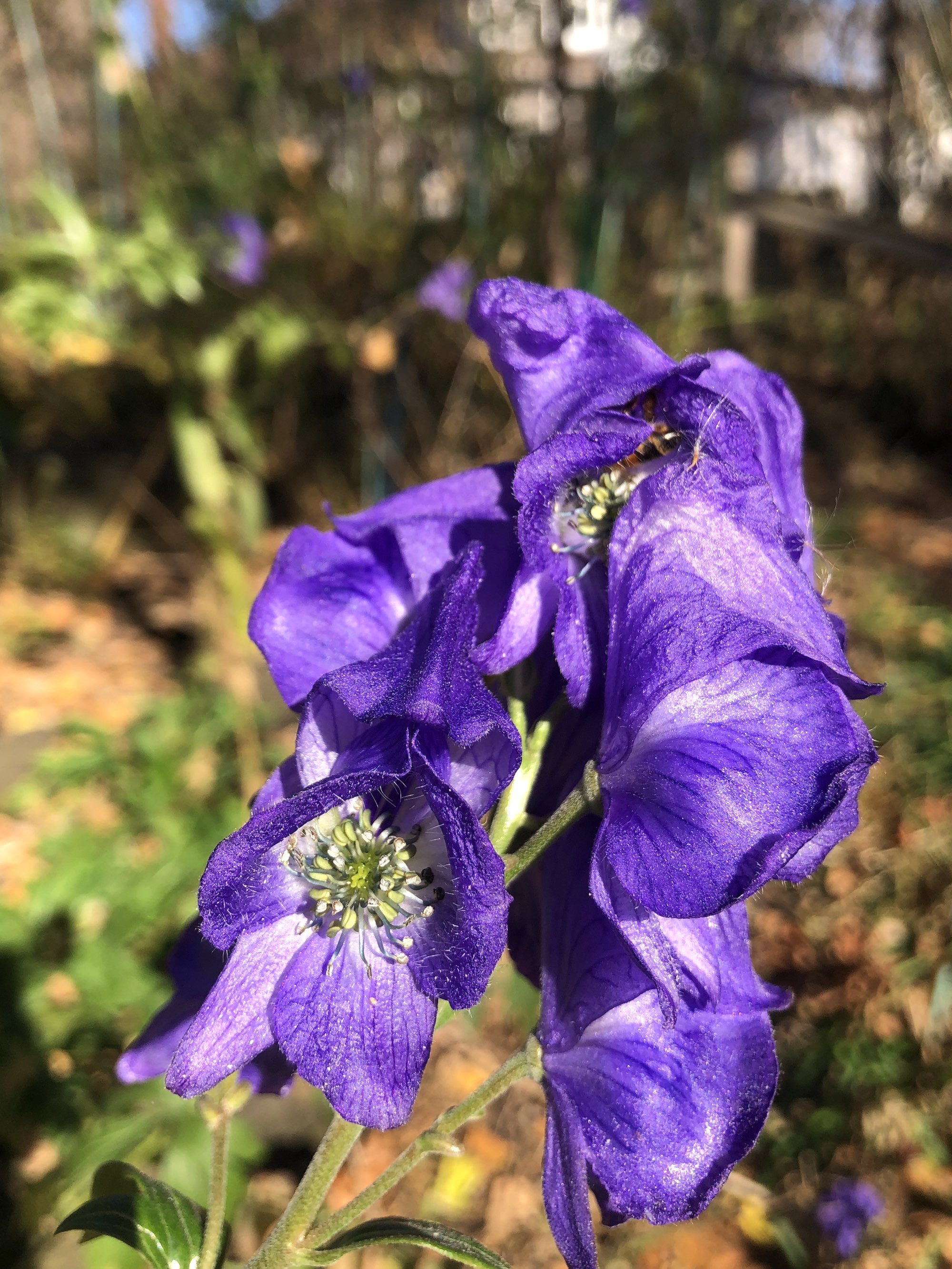 Above: Monkshood on hill off of bike path behind Fox Avenue in Madison, Wisconsin (10/28/22). From a smaller 2' tall plant.