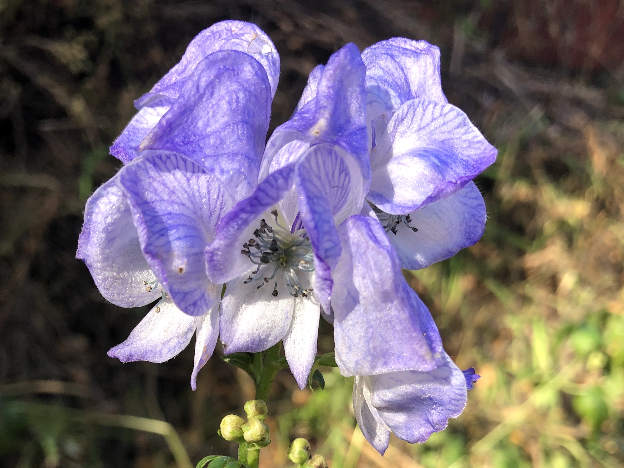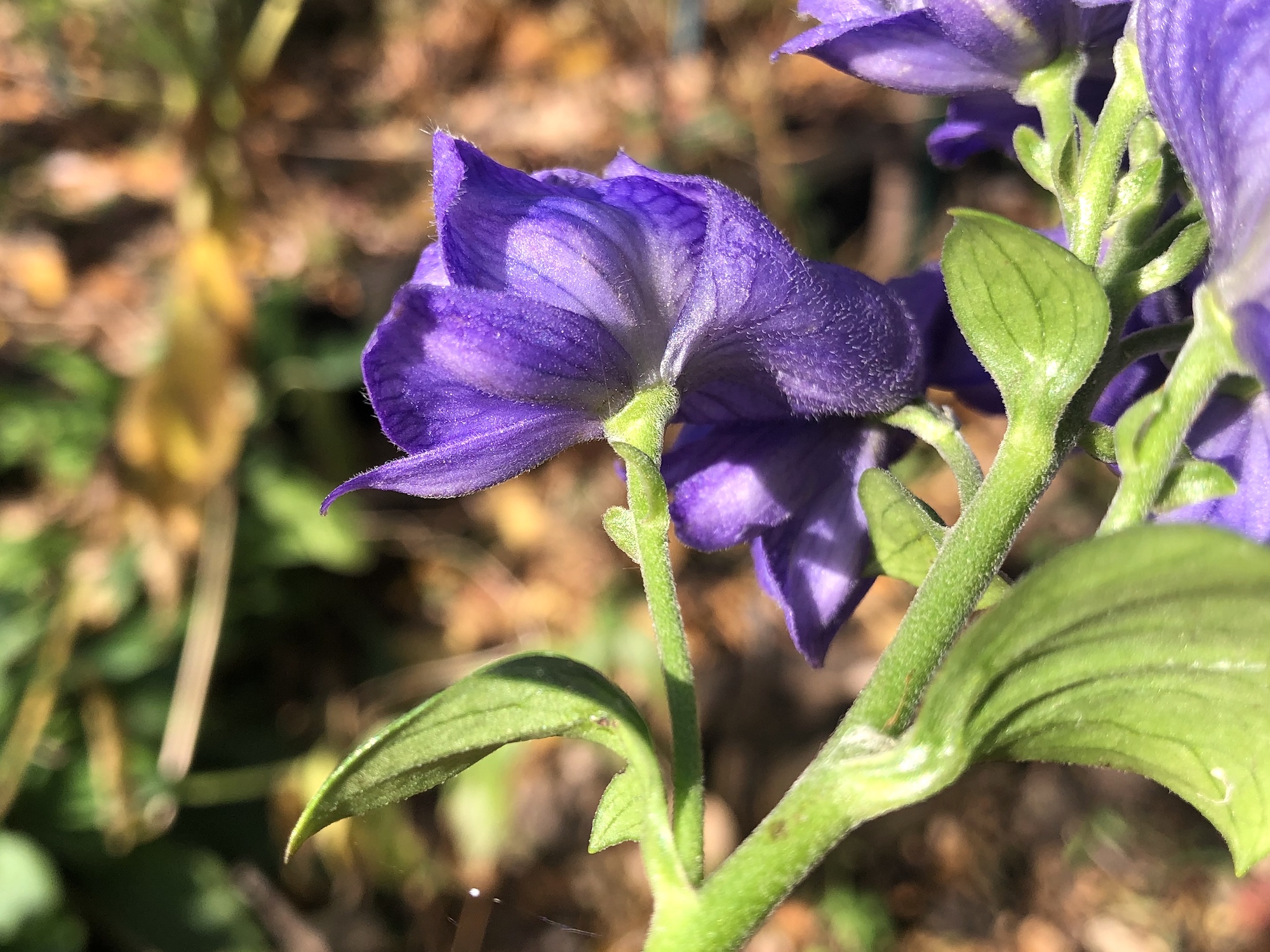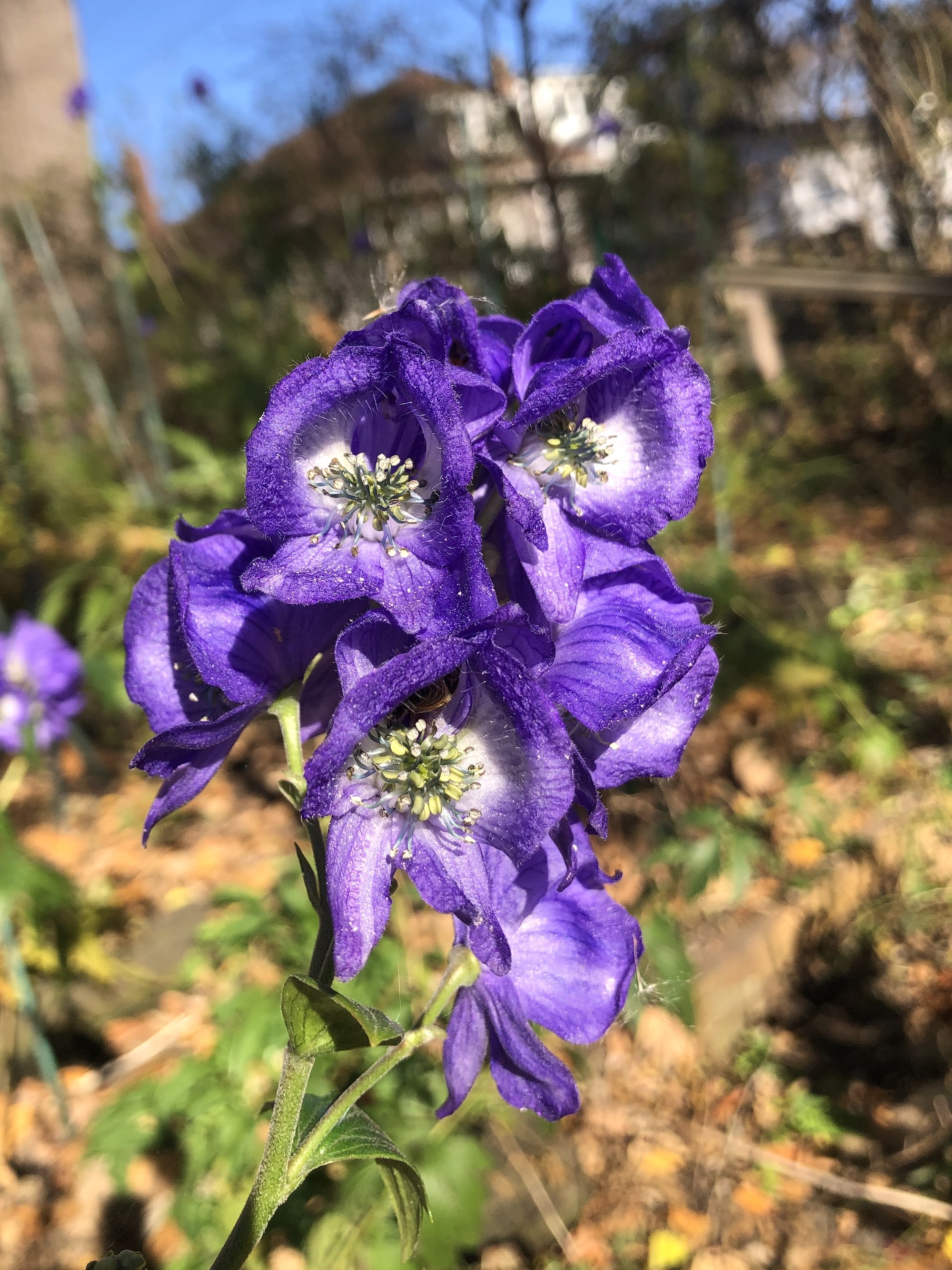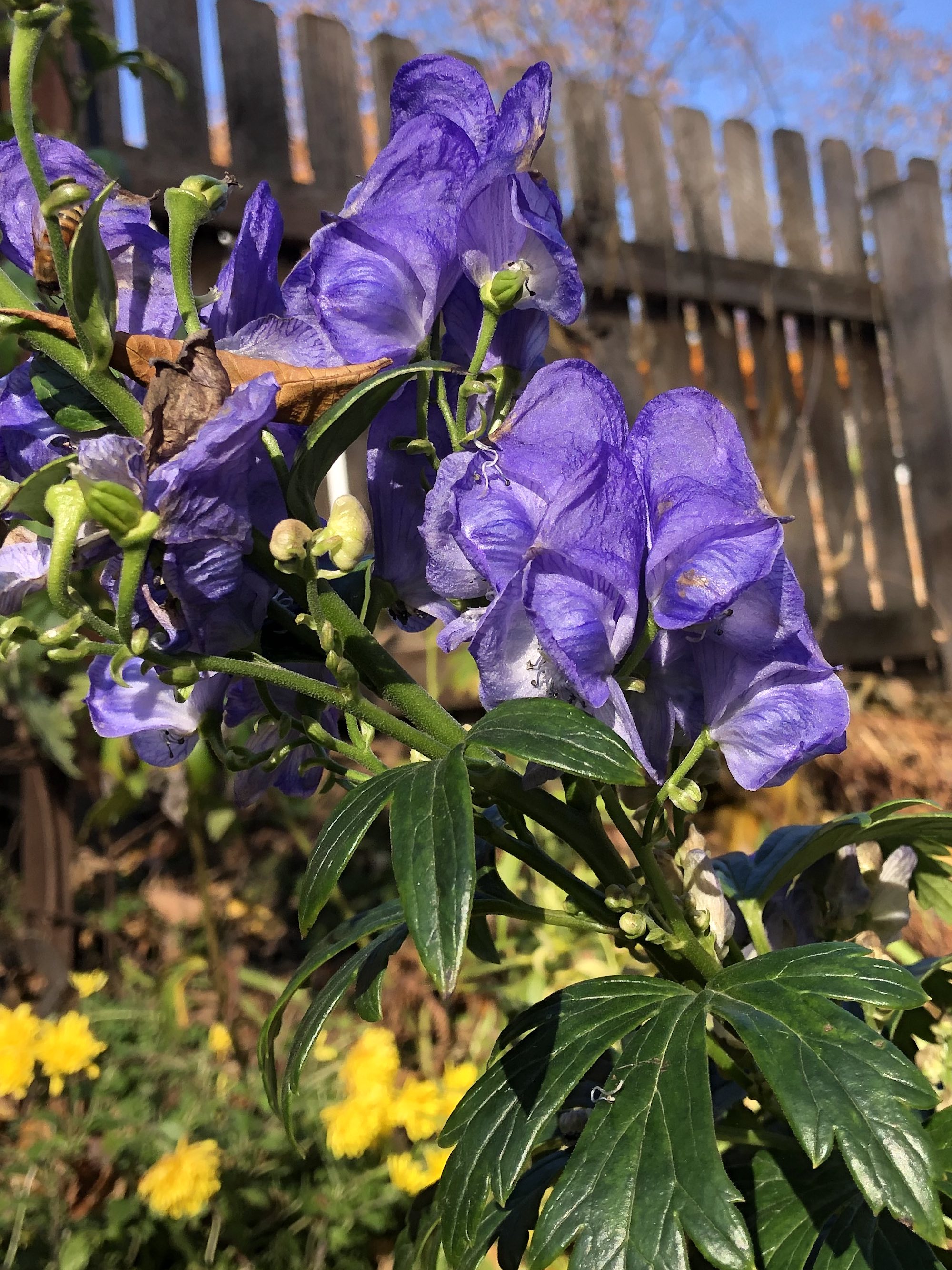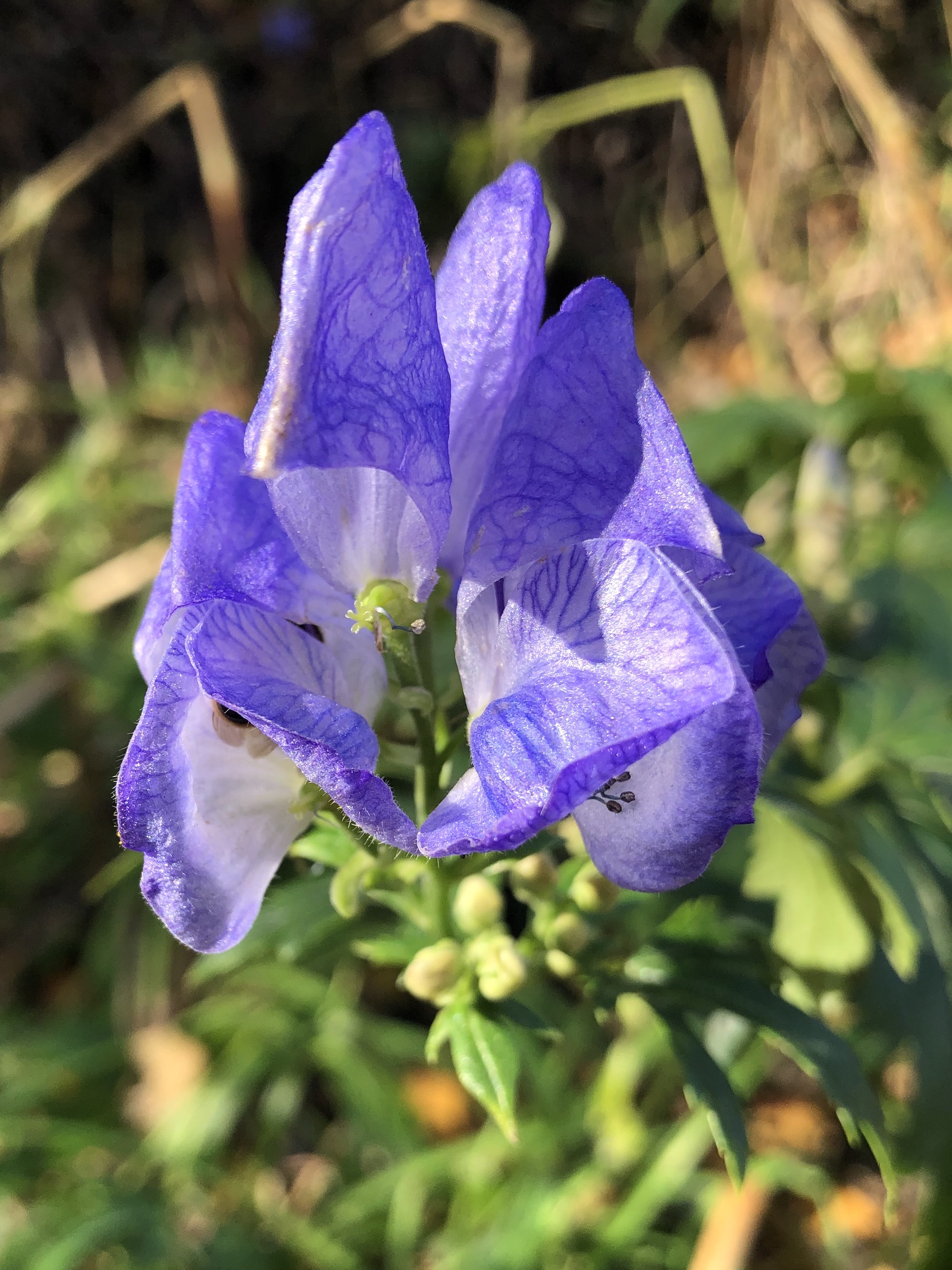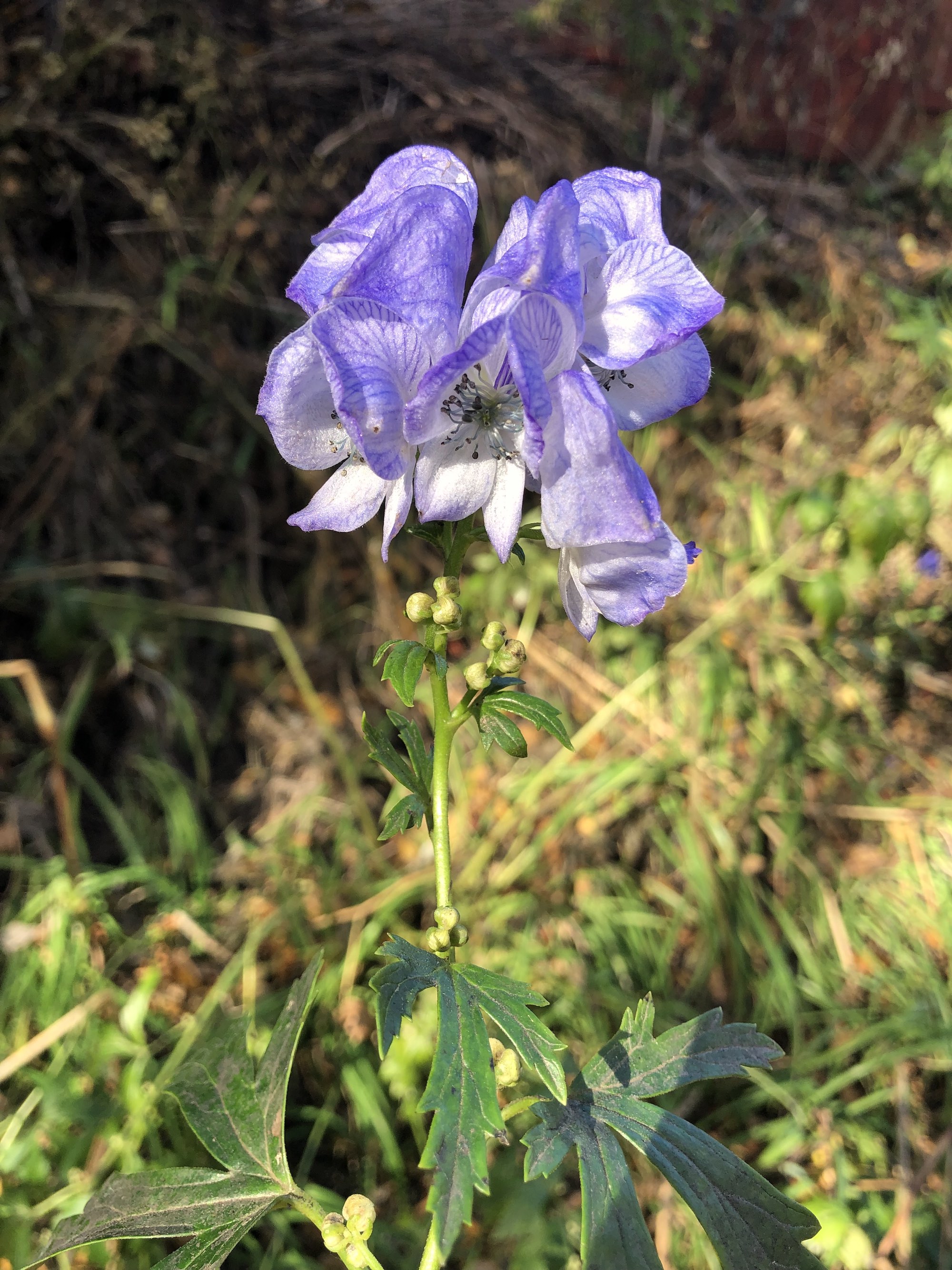 Above: Monkshood on hill off of bike path behind Fox Avenue in Madison, Wisconsin (10/28/22). From a smaller 2' tall plant.